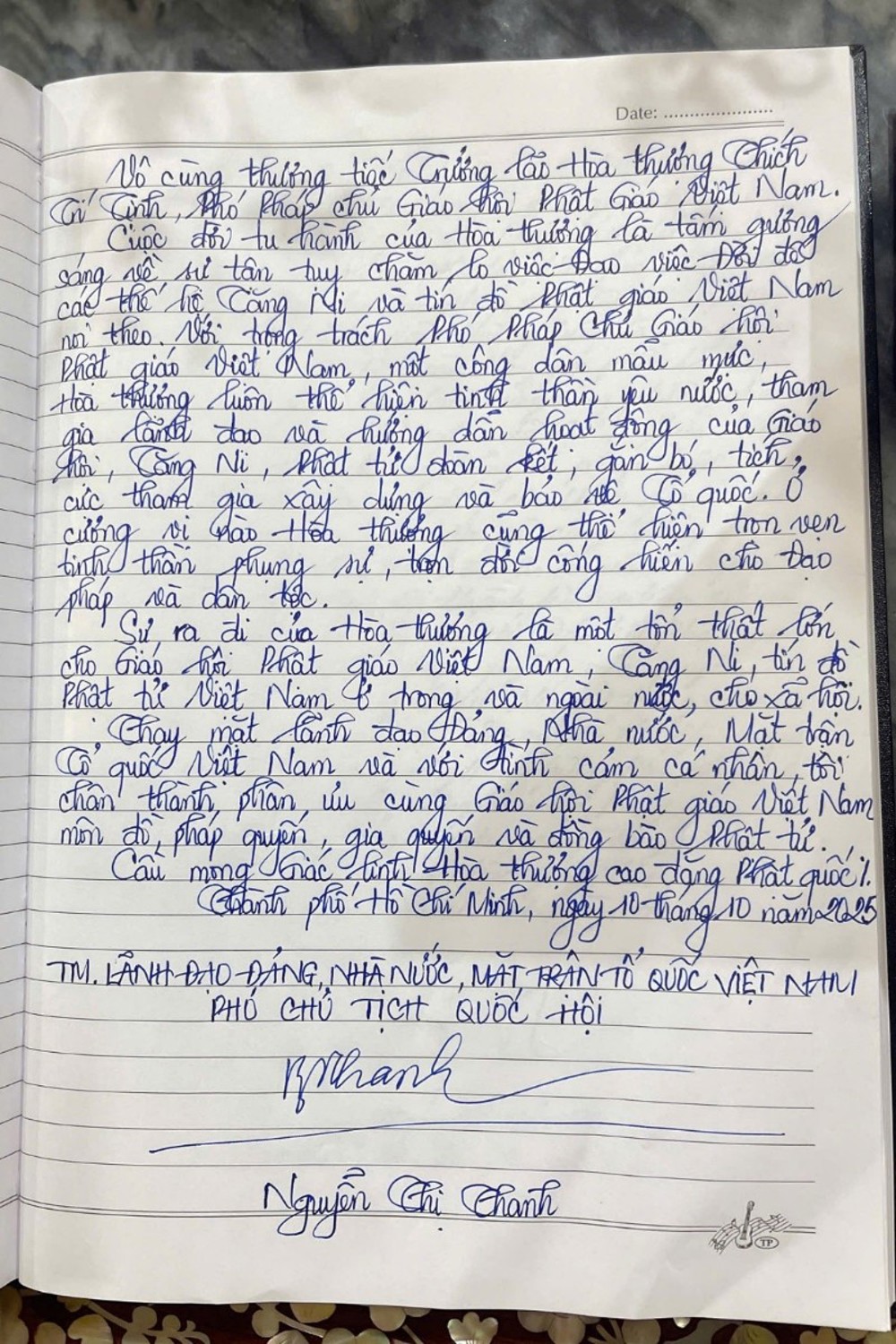 PSO - Chiều ngày 10/10/2025, lãnh đạo Đảng, Nhà nước, Mặt trận Tổ quốc Việt Nam do Bà Nguyễn Thị Thanh, Ủy viên Trung ương Đảng, Phó Chủ tịch Quốc hội Nước Cộng hòa Xã hội Chủ nghĩa Việt Nam làm trưởng đoàn đã đến chùa Vĩnh Nghiêm (phường Xuân Hòa, TP. HCM) viếng tang, đảnh lễ Giác linh Trưởng lão Hòa thượng Thích Trí Tịnh, Phó Pháp chủ Hội đồng Chứng minh GHPGVN tân viên tịch.