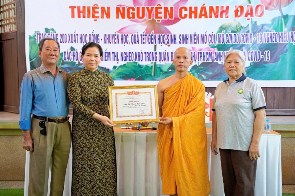 Trước đó, Đại đức Thích Minh Phú đã tổ chức trao 200 phần quà cho học sinh, sinh viên tàn tật và mồ côi do ảnh hưởng của dịch Covid-19, các hộ gia đình khiếm thị, khó khăn trên địa bàn phường Bình Thạnh. Mỗi phần quà trị giá 500.000 đồng, gồm 400.000 đồng tiền mặt và quà bánh. Với tổng trị giá 100 triệu đồng