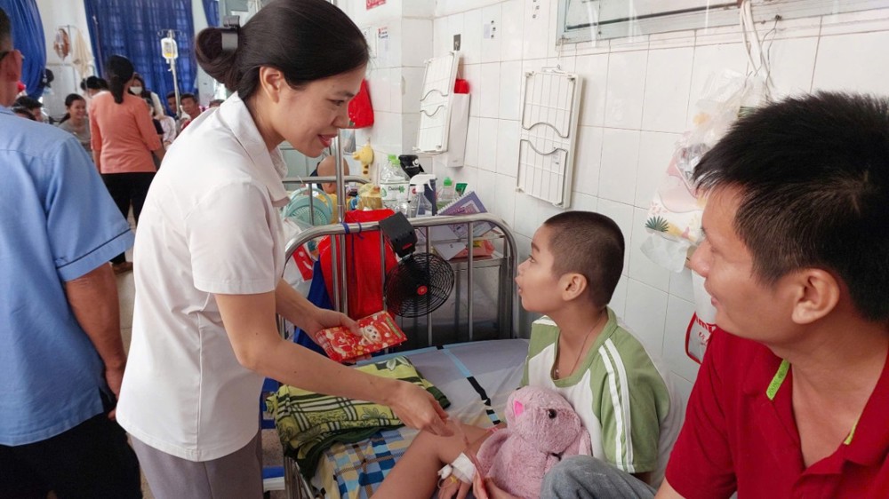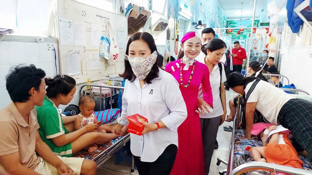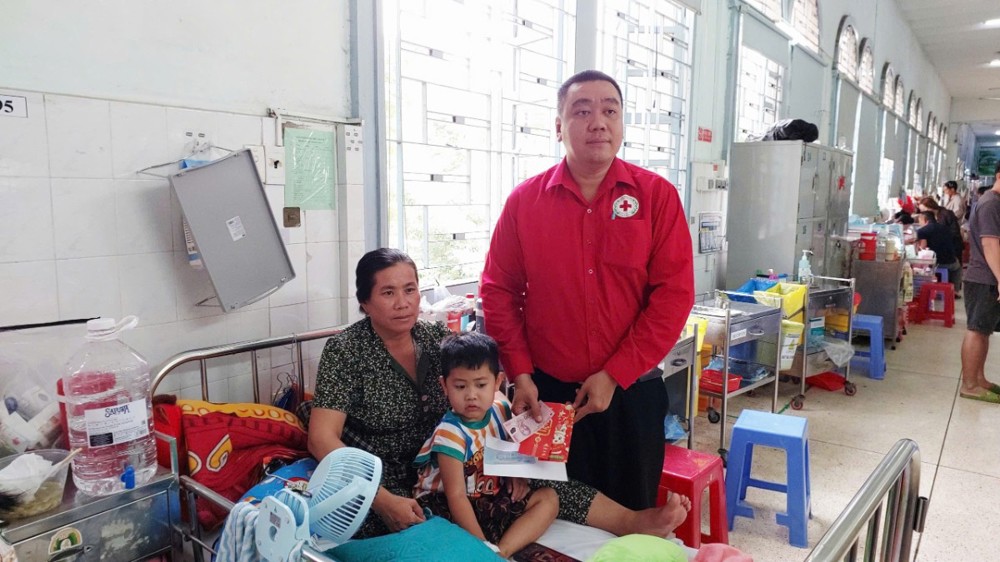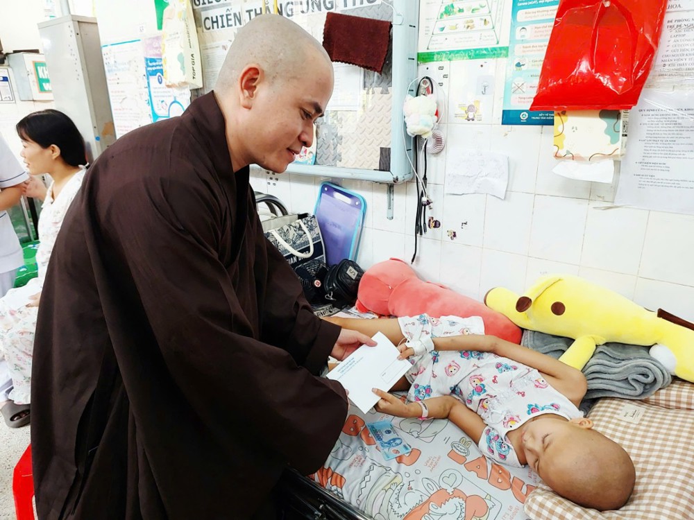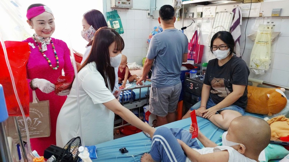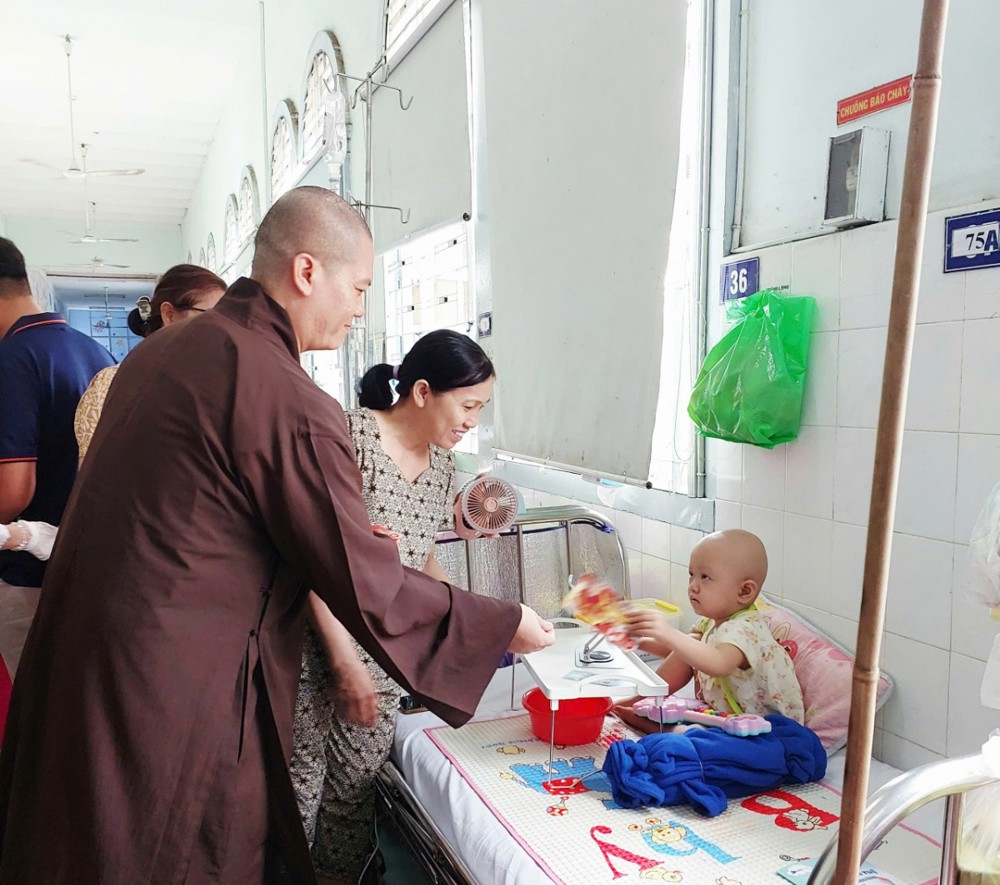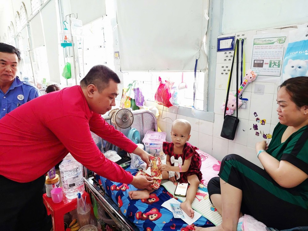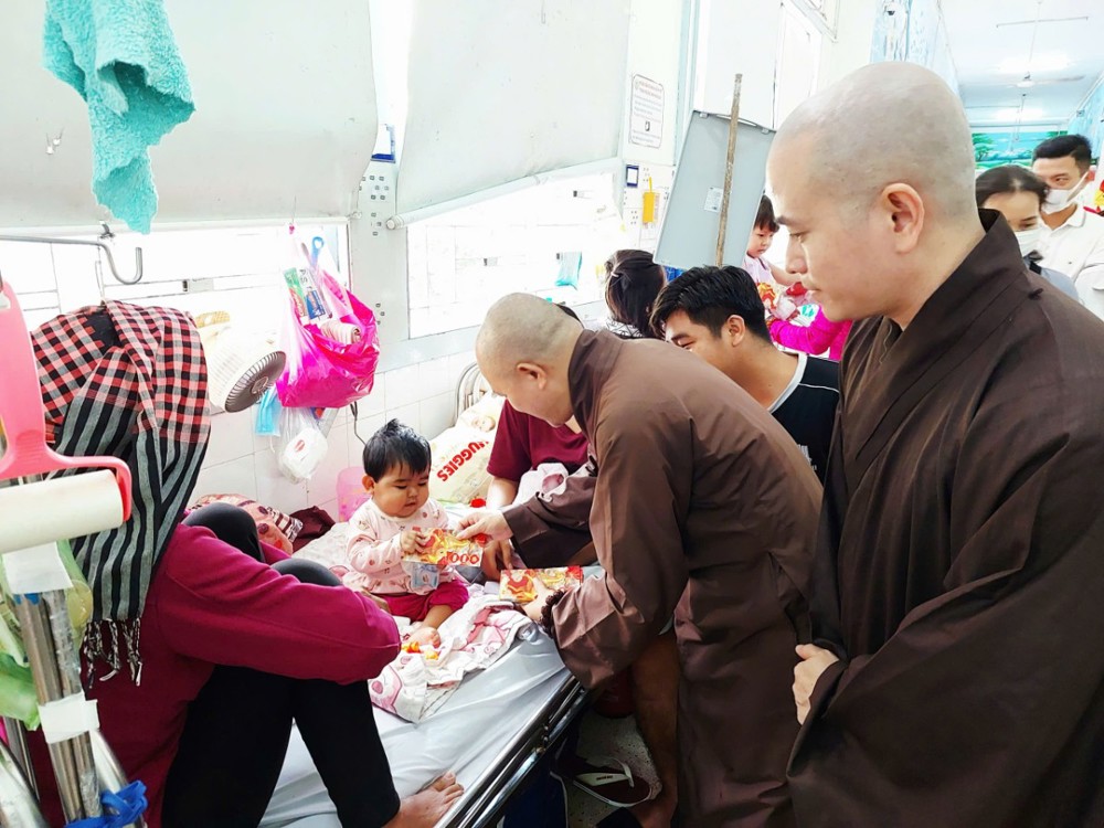 Trên tinh thần sẻ chia yêu thương, đoàn đã đến thăm hỏi, chúc Tết và trao lì xì cho các bệnh nhi đang điều trị tại các khoa: Bỏng – Chỉnh hình, Tim mạch, Thận và Ung bướu. Tại mỗi nơi đến, đoàn ân cần thăm hỏi sức khỏe các em, đồng thời động viên gia đình bệnh nhân giữ vững tinh thần lạc quan, nỗ lực vượt qua khó khăn để chăm sóc tốt cho các em. Nhân dịp năm mới, đoàn kính chúc các gia đình và bệnh nhi đón xuân an lạc, bình an, hạnh phúc, đồng thời nguyện cầu mười phương chư Phật gia hộ cho các em sớm bình phục, trở về sum họp cùng gia đình.
