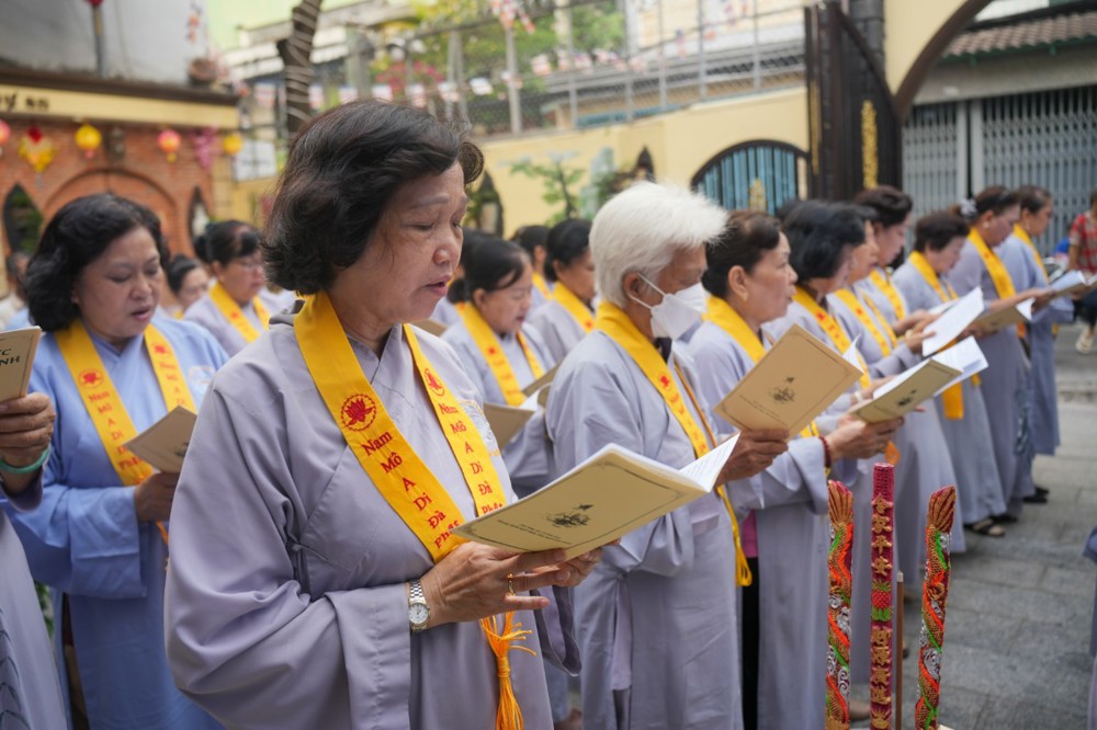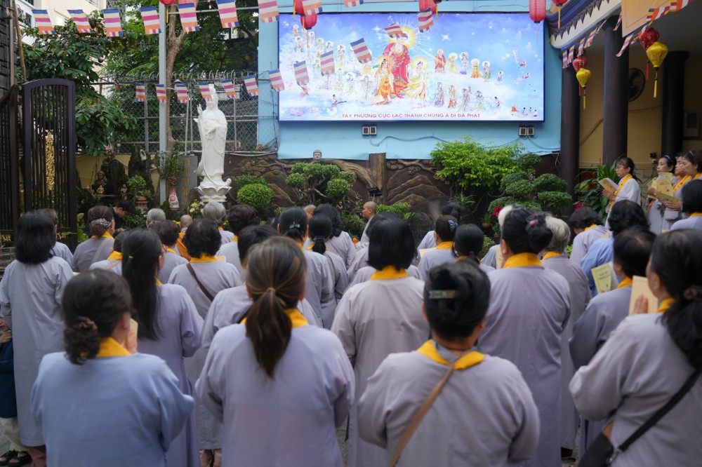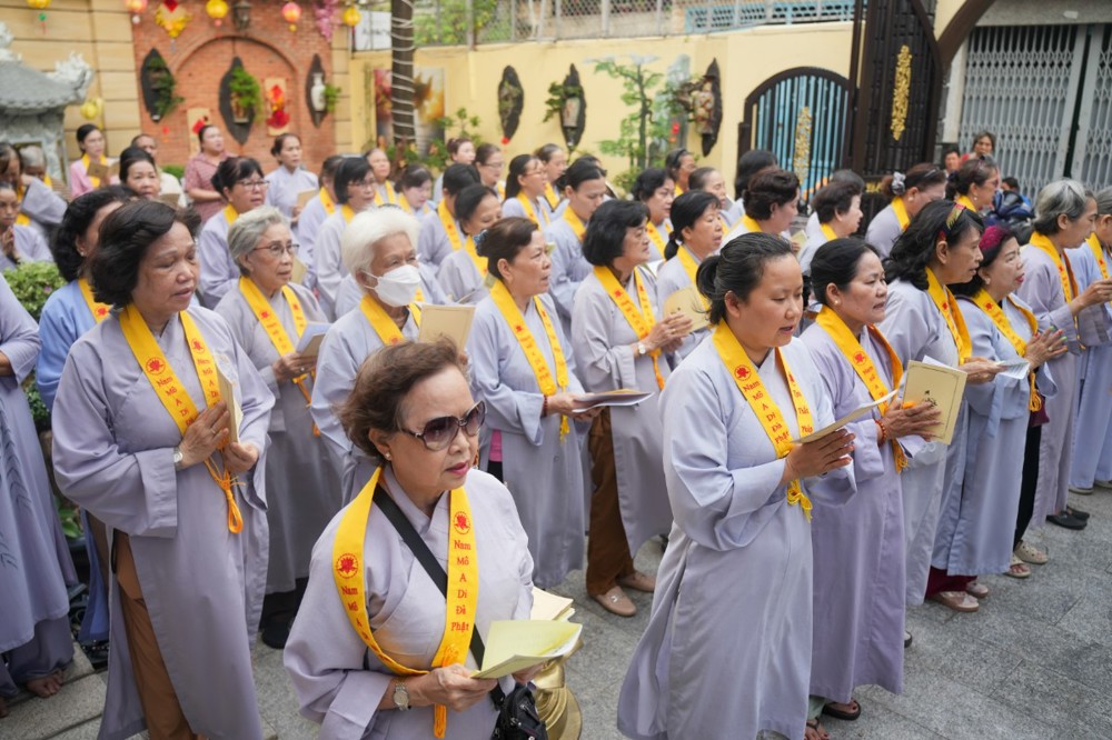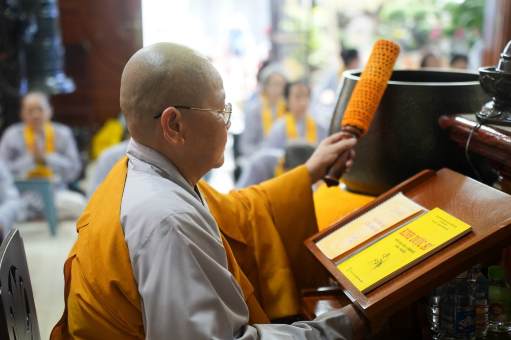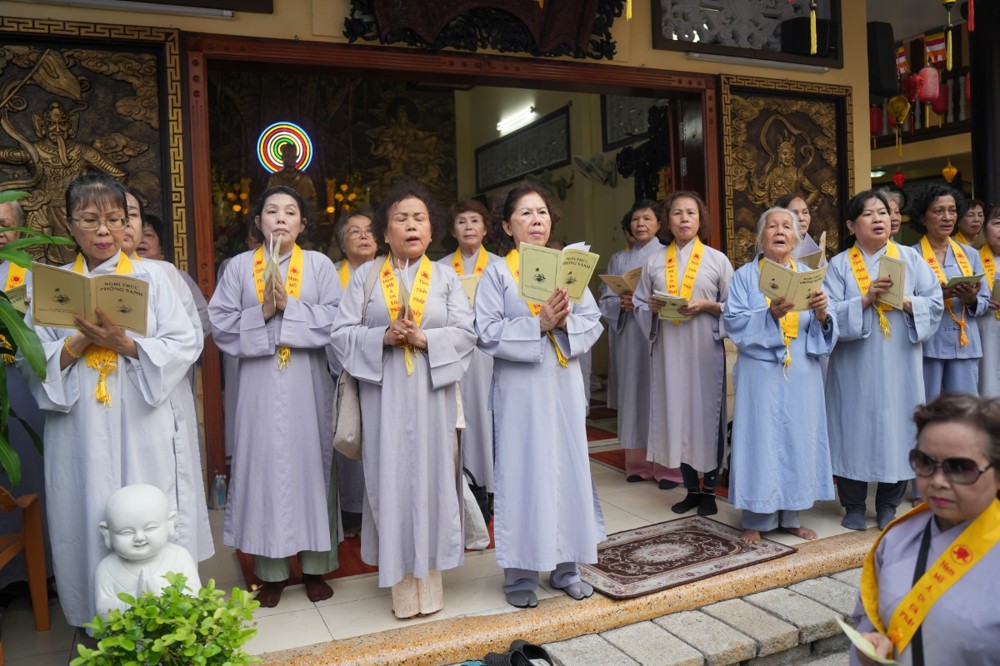 Buổi chiều cùng ngày, đạo tràng trang nghiêm cử hành khóa lễ tụng kinh Dược Sư cầu quốc thái dân an, nhất tâm hồi hướng công đức đến pháp giới chúng sanh, nguyện cầu thế giới hòa bình, nhân sinh an lạc.