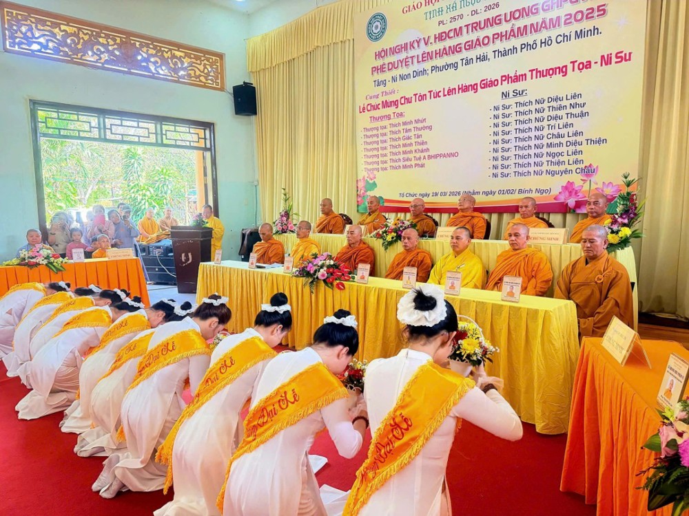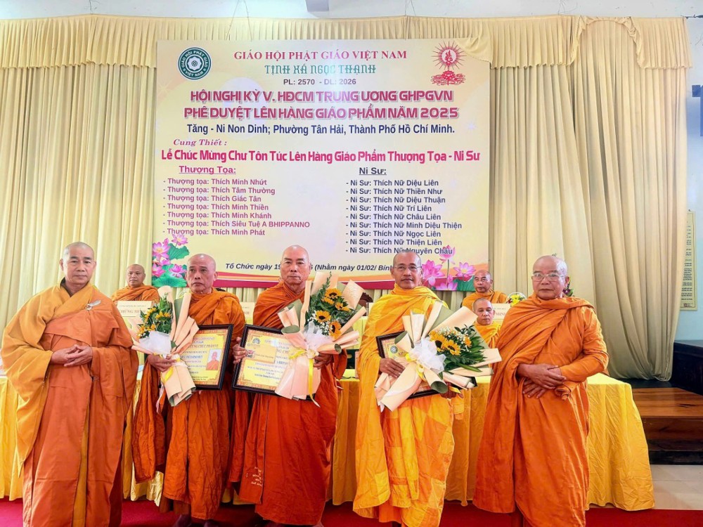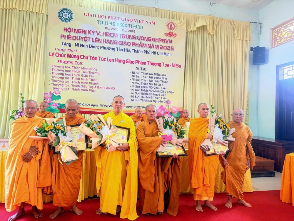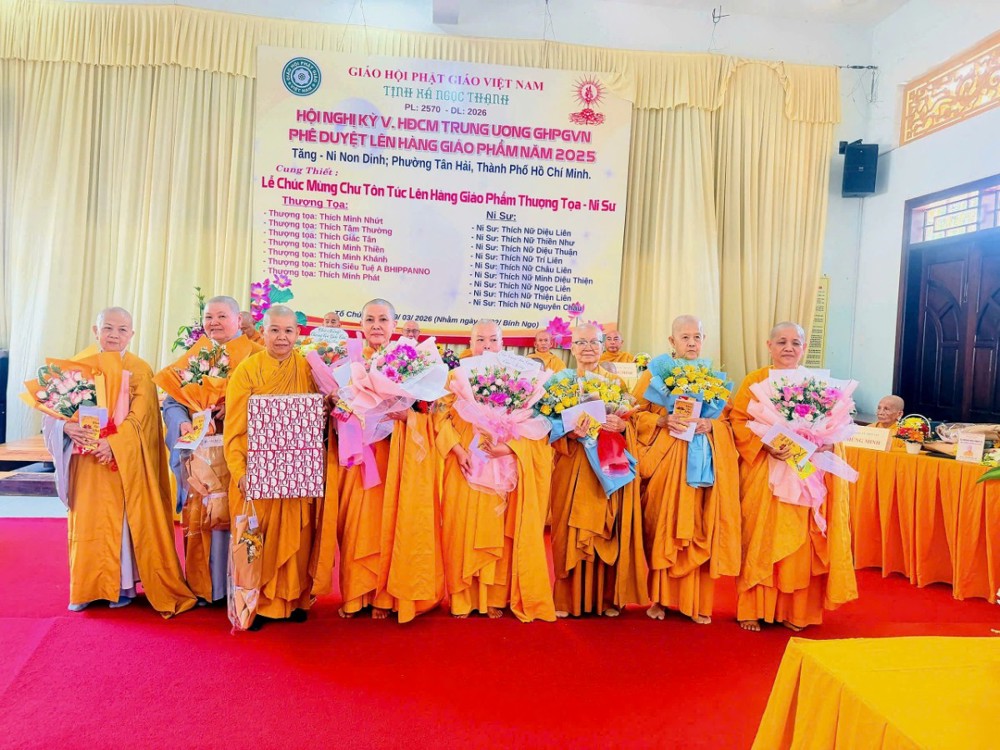 Nhân dịp này, Ban Tổ chức đã tặng hoa chúc mừng chư Tôn đức Tăng Ni được Hội đồng Chứng minh tấn phong Giáo phẩm Thượng tọa và Ni sư năm 2025.