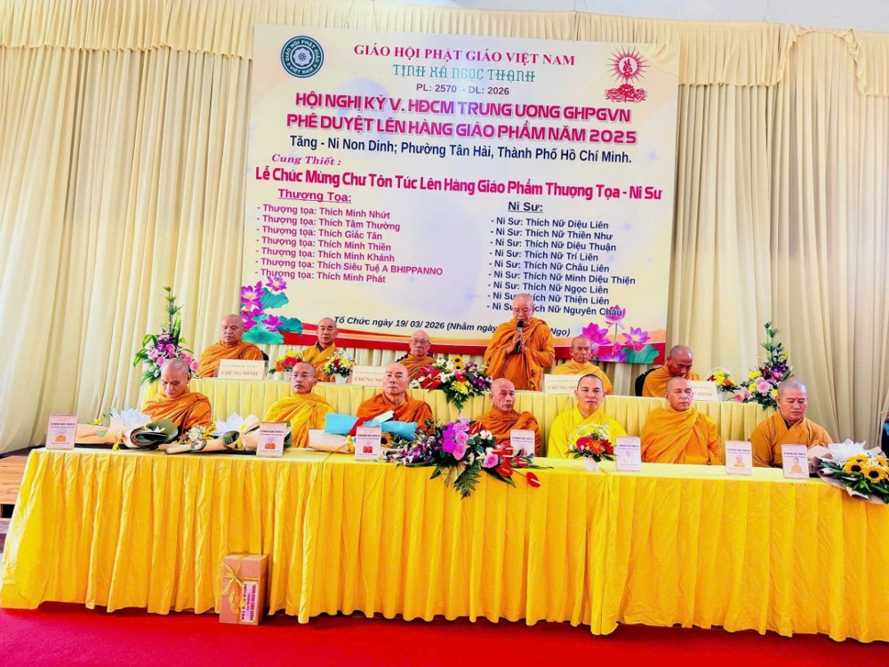 Đại diện chư Tôn đức được tấn phong đã dâng lời cảm niệm, tri ân chư Tôn đức lãnh đạo, Pháp lữ và quý Phật tử đã trợ duyên, đồng thời phát nguyện tinh tấn tu học, phụng sự đạo pháp và nhân sanh.