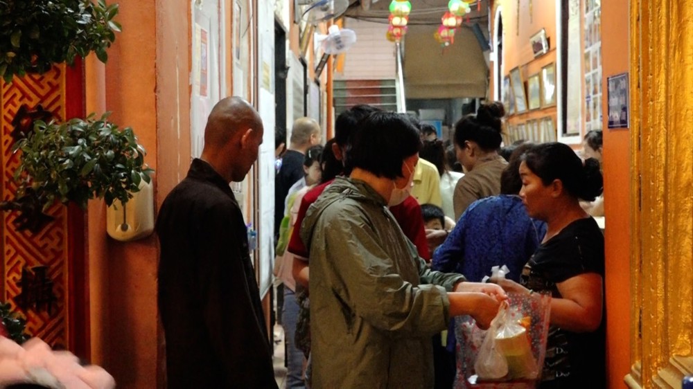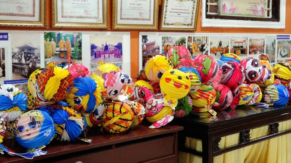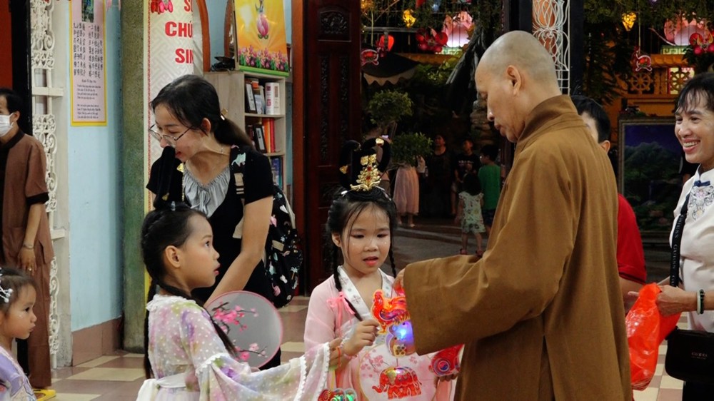 Các phần quà bánh Trung thu và lồng đèn cũng được chư Tăng trao đến các em dịp này.