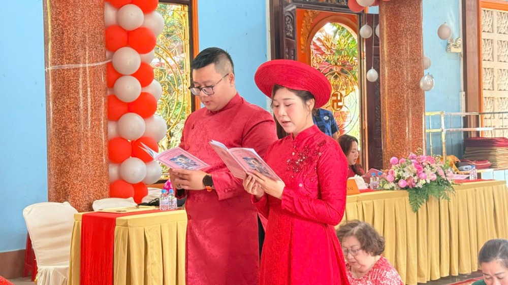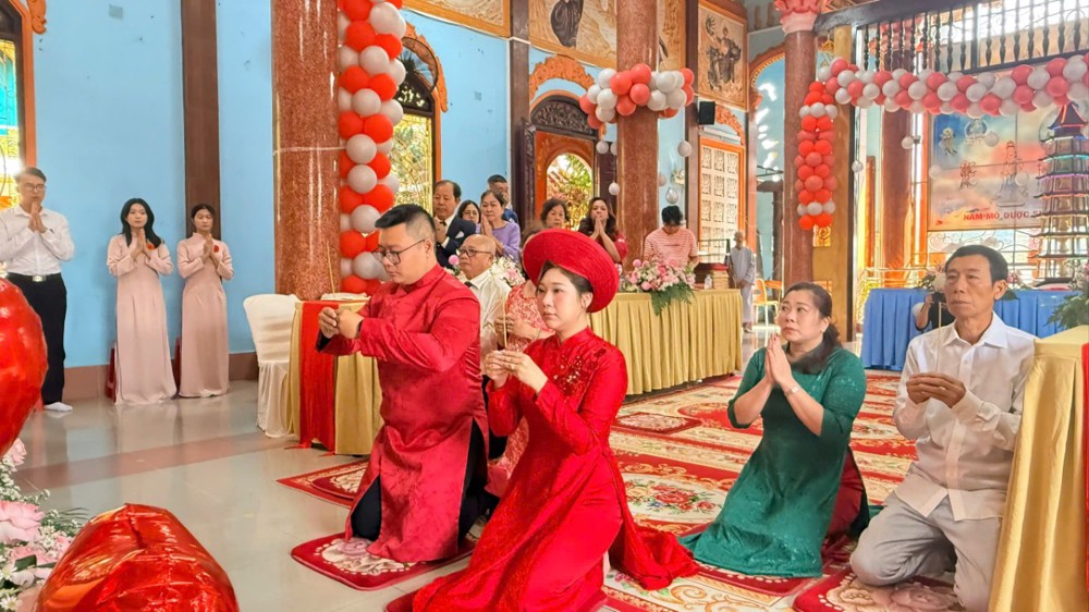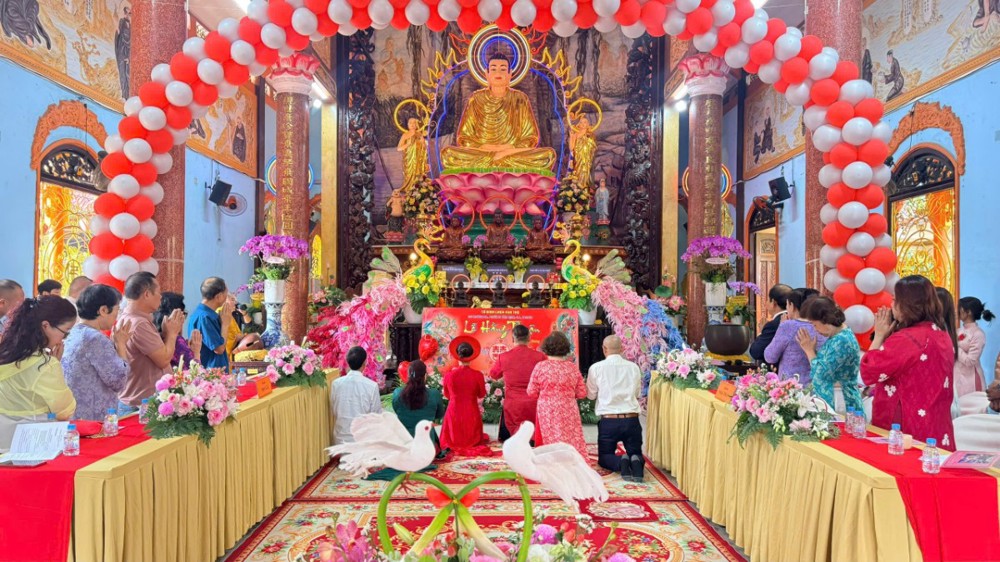 Trong không khí trang nghiêm nơi Tổ đình, đôi Phật tử trẻ đã thành kính đảnh lễ, phát nguyện trước Tam bảo nguyện sống chung thủy, hòa hợp, xây dựng mái ấm gia đình trên nền tảng chánh tín và đạo đức Phật giáo, cùng nhau hướng đến đời sống an lạc, hạnh phúc.