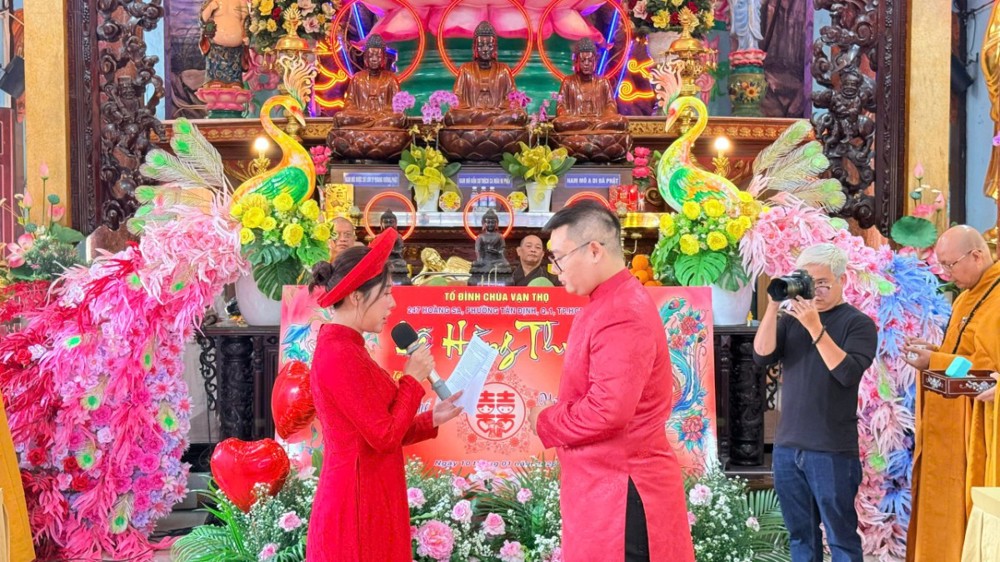 PSO - Sáng ngày 10/1/2026 (nhằm ngày 22/11 năm Ất Tỵ), tại Tổ đình chùa Vạn Thọ (số 247 Hoàng Sa, phường Tân Định, TP.HCM), lễ hằng thuận đã được trang trọng cử hành cho đôi Phật tử trẻ Bùi Huỳnh Thế Phát (Pháp danh Minh Huy) và cô dâu Vũ Thu Thủy (Pháp danh Diệu Vân), trong không khí thanh tịnh, ấm áp đạo vị và thấm đượm nghĩa tình gia đình.