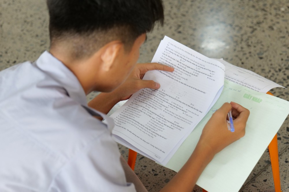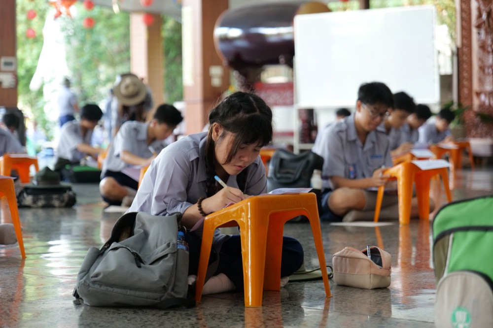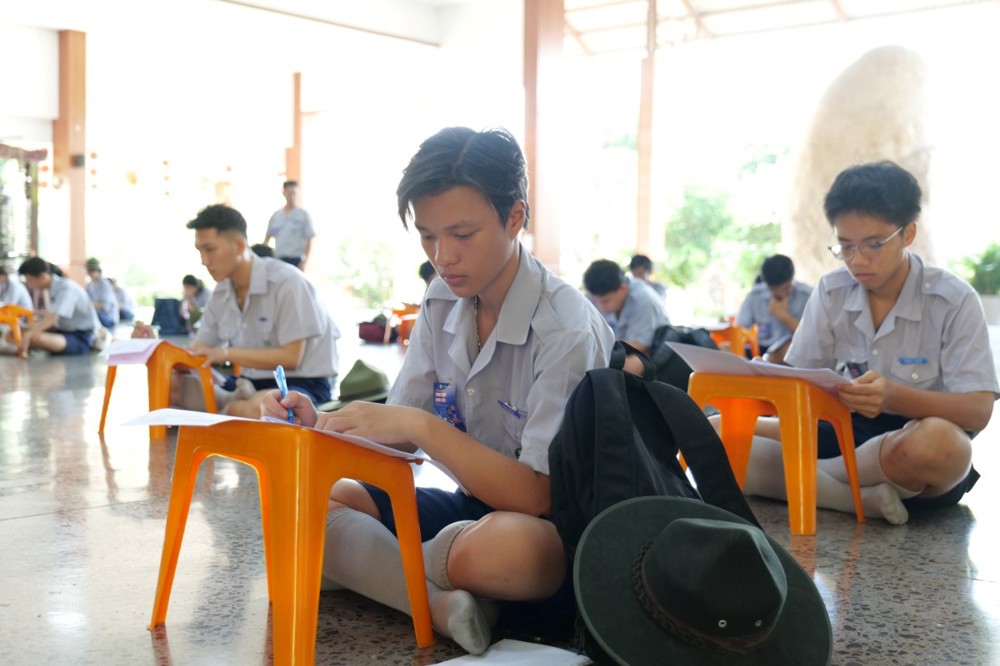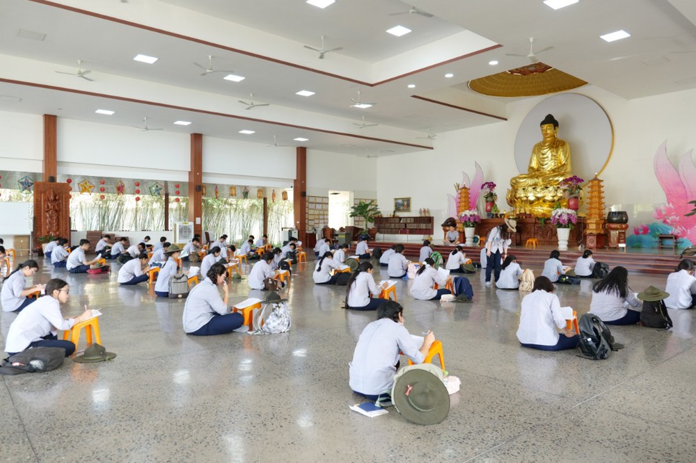 Sau lễ khai mạc, các trại sinh bước vào phần thi làm bài tại chánh điện trong không gian trang nghiêm, thanh tịnh. Với thái độ nghiêm túc, tập trung và chánh niệm, các em đã vận dụng kiến thức giáo lý Phật pháp, lịch sử Gia đình Phật tử cùng những kỹ năng tu học đã được trau dồi, thể hiện sự trưởng thành cả về nhận thức lẫn tác phong của người đoàn sinh.
