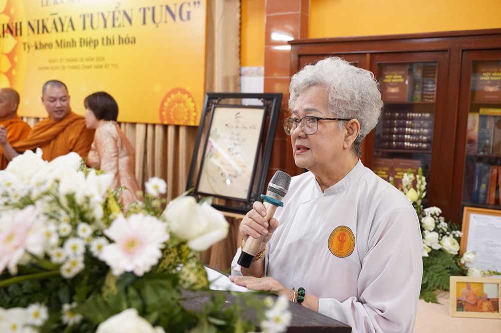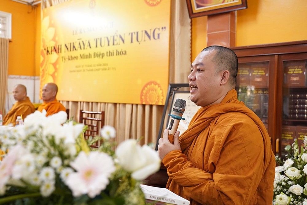 Mở đầu buổi lễ, Tỳ-kheo Minh Điệp có phần chia sẻ đầy tâm huyết về quá trình hình thành cũng như nhân duyên biên soạn, thi hóa tác phẩm “Kinh Nikaya Tuyển Tụng”.