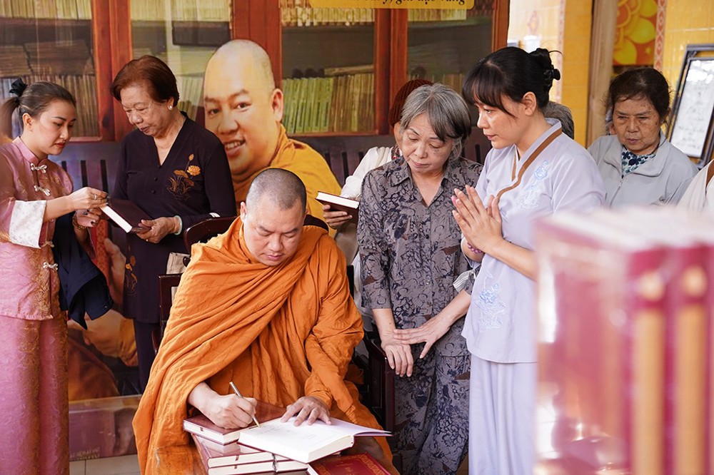 Dịp này, tác giả đã dâng lời tri ân và trao tặng sách đến chư Tôn đức, các đơn vị đồng hành cùng Phật tử tham dự. Buổi lễ khép lại trong không khí hoan hỷ với phần tụng kinh hồi hướng, ký tặng sách, chụp hình lưu niệm và tiệc thân mật, góp phần thắt chặt tình đạo vị và tinh thần hộ trì Tam bảo.