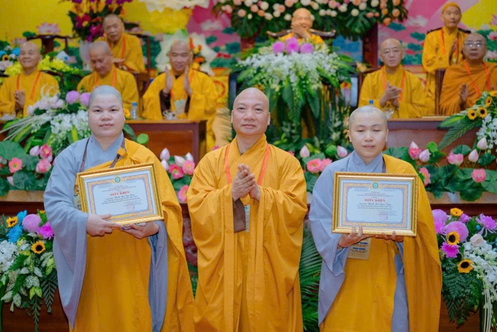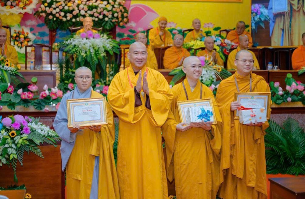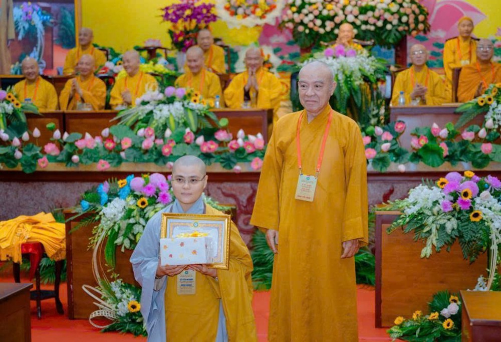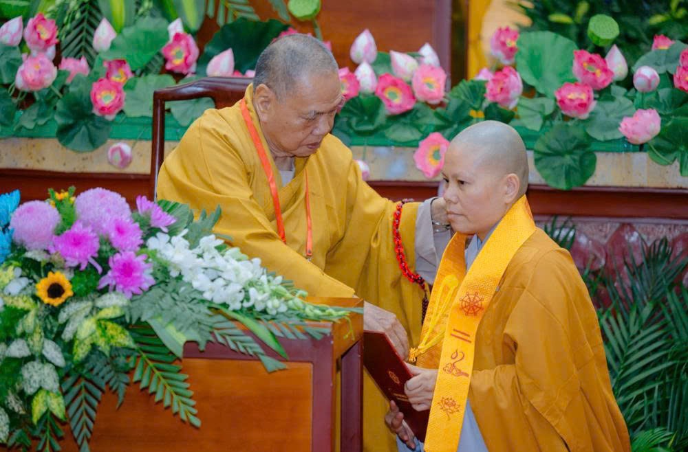 Tiếp đó, Thượng tọa Thích Chiếu Tuệ – Ủy viên HĐTS, Phó Trưởng ban Thường trực Hoằng pháp Trung ương trao kỷ niệm chương đến Tăng Ni tốt nghiệp, như lời tán dương và động viên tiếp tục giữ vững chí nguyện hoằng pháp trong chặng đường sắp tới.