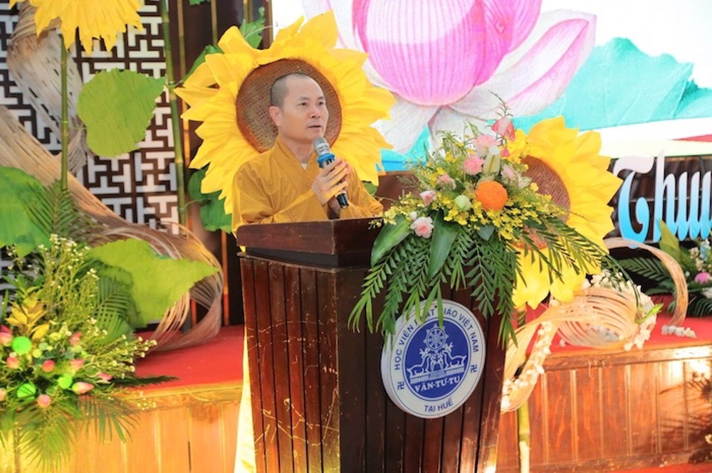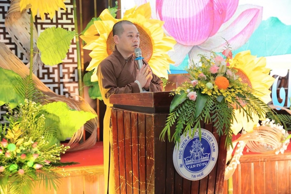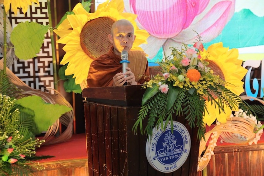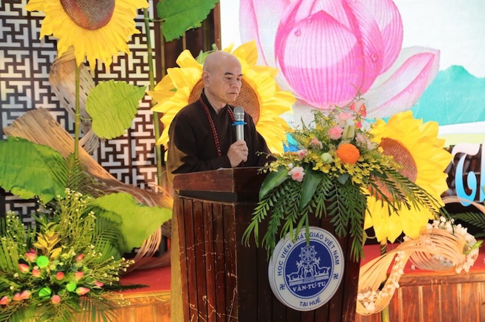 Tiếp đó, TT Thích Minh Thuận đã thay mặt phái đoàn phát biểu. Thượng tọa bày tỏ niềm hoan hỷ khi lần đầu tiên được đến thăm Học viện Phật giáo Việt Nam tại Huế – một môi trường đào tạo rất trong lành, thanh tịnh, cách xa đô thị, tạo điều kiện thuận lợi cho hành giả an trú tu học và phát triển trí tuệ. Thượng tọa tán dương mô hình đào tạo của Học viện, đồng thời khuyến khích Tăng Ni sinh nỗ lực trau dồi tri thức, hướng đến việc học lên bậc Tiến sĩ để góp phần nâng cao trình độ học thuật Phật giáo Việt Nam. Bên cạnh đó, Thượng tọa nhấn mạnh tầm quan trọng của ngoại ngữ trong thời đại hội nhập, xem đây là hành trang thiết yếu để Tăng Ni sinh có thể giao lưu, học hỏi và truyền bá Phật pháp đến bạn bè quốc tế.