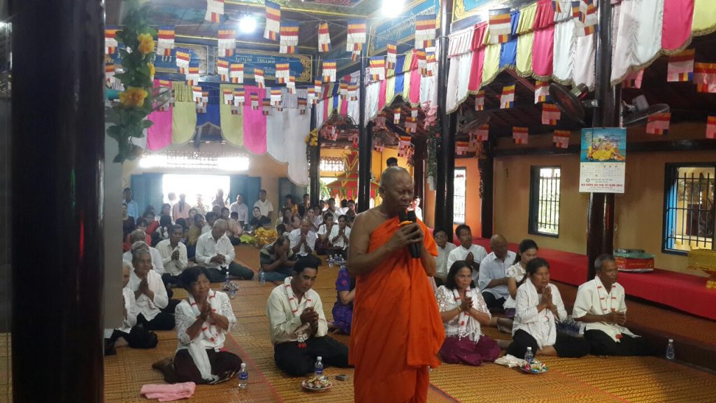 Trước khi chính thức diễn ra lễ, tại giảng đường chùa, HT. CanDaSiRi Thạch Sok Xane, Trụ trì chùa Âng hướng dẫn đạo tràng Phật tử chào cờ PG (Khrup Tông), chia sẻ thời pháp thoại ngắn với chủ đề "Ý nghĩa Đại lễ Dâng y Kathina".