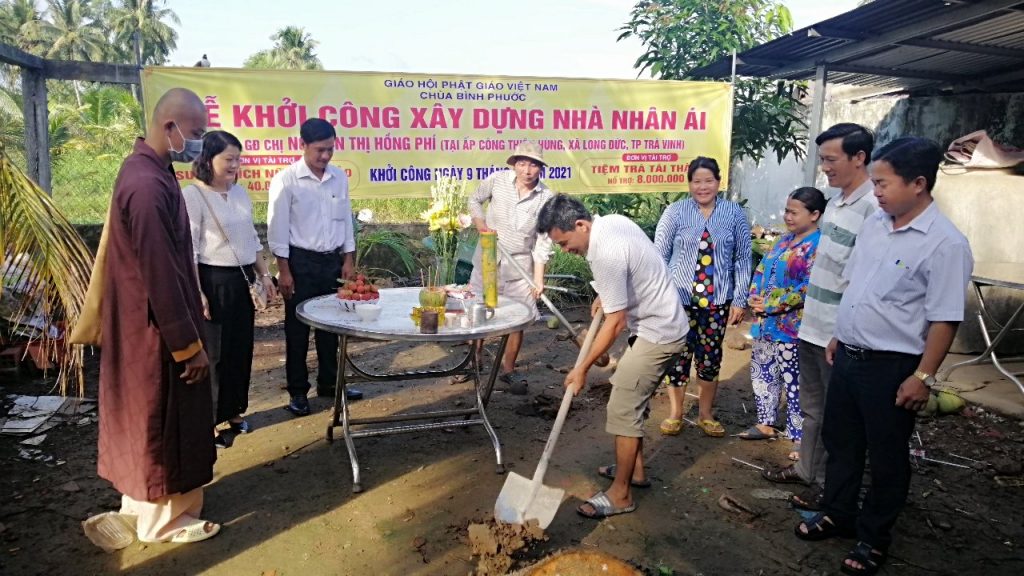PSO - Sáng ngày 09/6/2021 (nhằm ngày 29/4 năm Tân Sửu), chùa Bình Phước (phường 4, TP. Trà Vinh) kết hợp cùng chính quyền địa phương làm lễ khởi công xây dựng nhà Nhân Ái cho hộ gia đình chị Huỳnh Thị Hồng Phí (ấp Công Thiện Hùng, xã Long Đức, TP. Trà Vinh).
