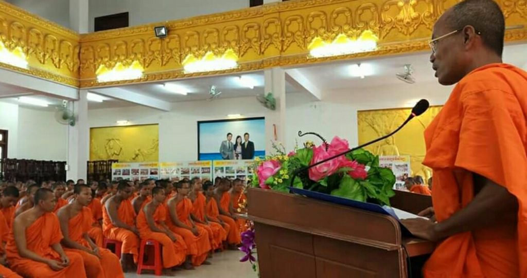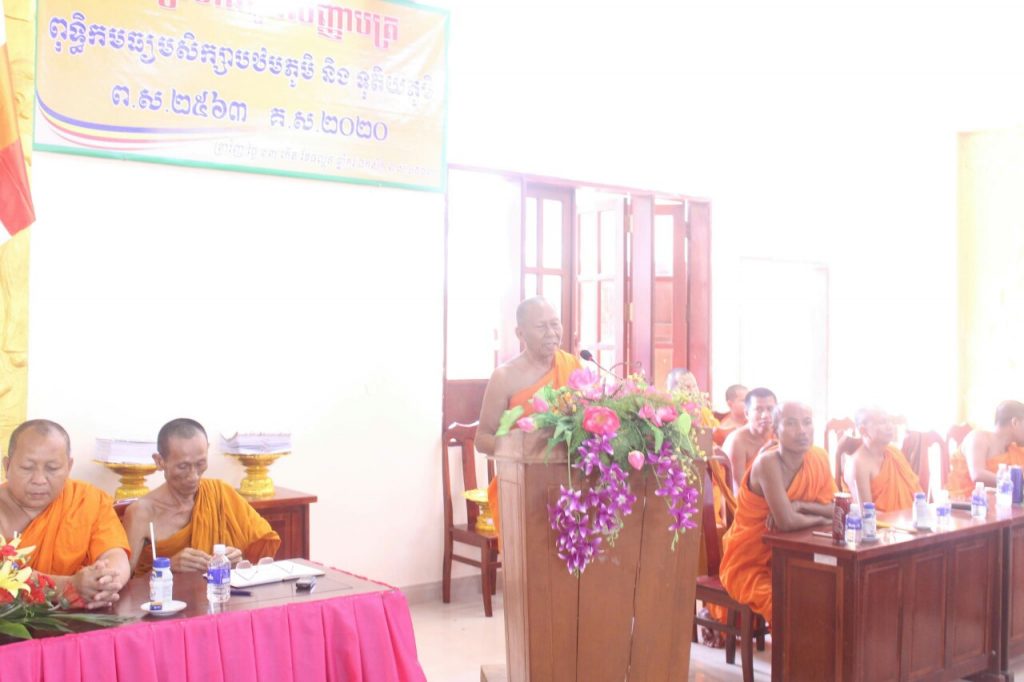 Tiếp đến, HT. Thạch Oai - Phó chủ tịch Thường trực Hội ĐKSSYN tỉnh Trà Vinh phát biểu thông tin về các hướng Tăng thí sinh sau khi đã nhận bằng tốt nghiệp, phải tiếp tục làm thủ tục nộp hồ sơ vào học các trường Trung cấp Pali - Khmer, các Học viện PG Nam tông Khmer hoặc du học các trường PG ngoài nước.