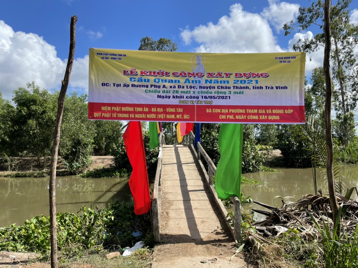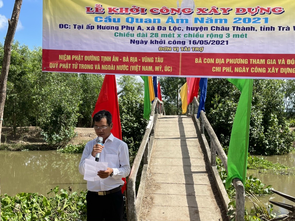 PSO - Sáng ngày 16/5/2021 (nhằm ngày 05/4 năm Tân Sửu), ĐĐ. Thích Minh Trí - Trụ trì Chùa Long Bửu (xã Nhị Long); SC Thích Nữ Giác Thành - Trụ Trì Niệm Phật Đường Tịnh Ân (tỉnh Bà Rịa - Vũng Tàu) đã long trọng tổ chức lễ khởi công xây dựng cầu Quan Âm tại ấp Hương Phụ A, xã Đa Lộc, huyện Châu Thành, tỉnh Trà Vinh.