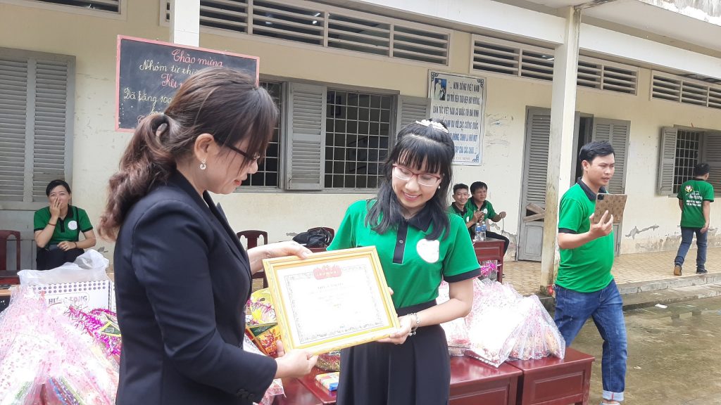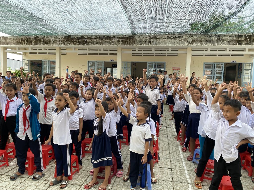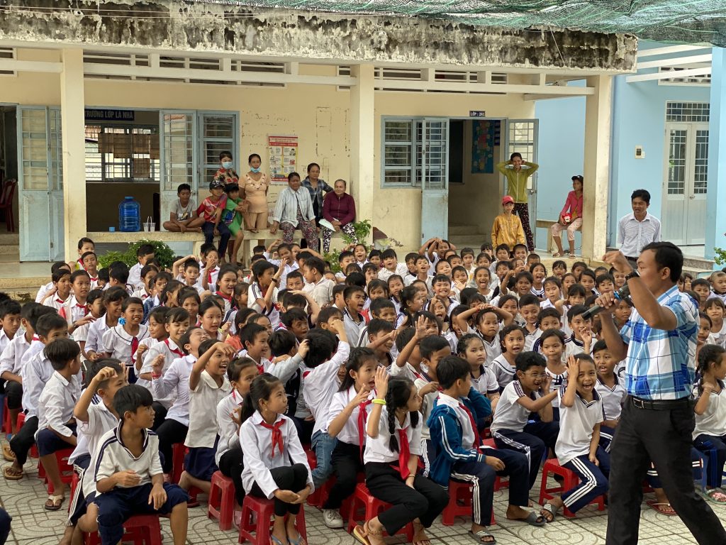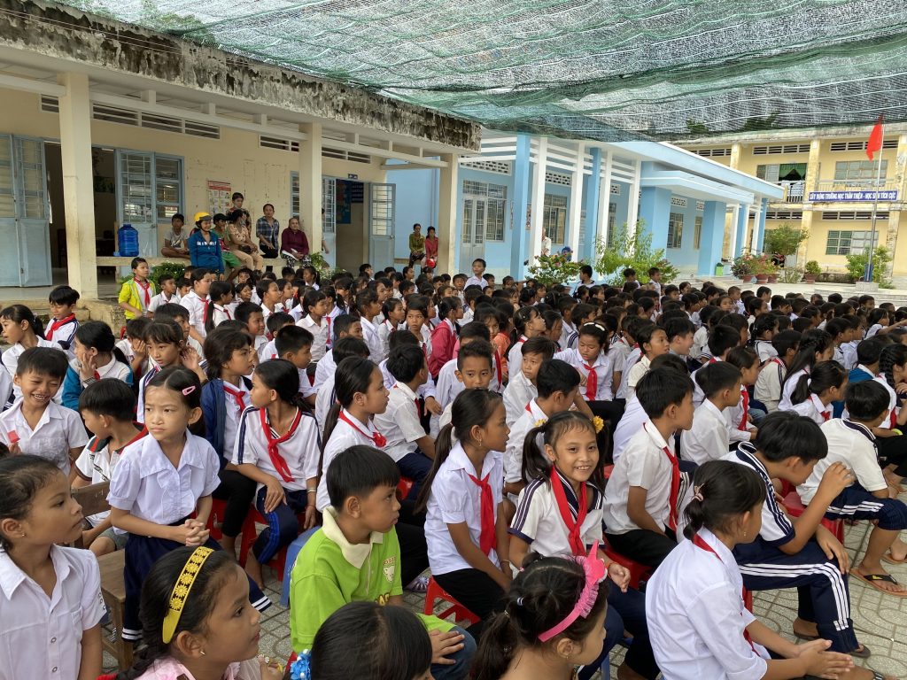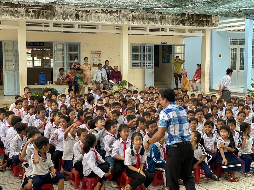 Trước đó, ngày 28/9/2020 (nhằm ngày 12/8 năm Canh Tý), phái đoàn đã đến trường Tiểu học Long Sơn A thuộc ấp Sóc Mới, xã Long Sơn, huyện Cầu Ngang, tỉnh Trà Vinh trao 100 phần quà cho các em học sinh có hoàn cảnh khó khăn, với sự tham dự của: PT. Huệ Ngọc Nhã - Uỷ viên Phân ban, Trưởng nhóm Từ bi Giác ngộ Kết nối Yêu thương; Cô Nguyễn Thị Lệ - Hiệu phó trường Tiểu học Long Sơn A; Thầy Ngô Hoàng Dũng - Tổng phụ trách trường, cùng tập thể giáo viên nhà trường, và các thành viên trong Nhóm Từ thiện Từ bi Giác ngộ Kết nối Yêu thương.