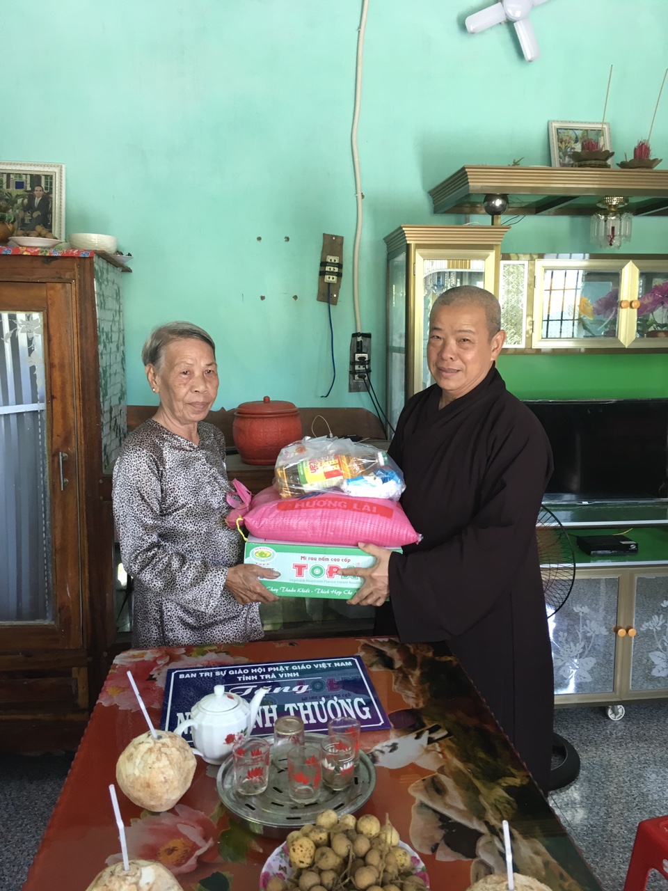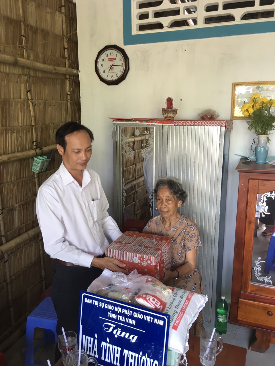 Xã Thanh Mỹ đang trong thời gian rốt ráo hoàn thành 19 tiêu chí để đạt chuẩn nông thôn mới. Do đó, chính quyền xã tích cực vận động, kêu gọi nhiều tổ chức, đoàn thể, các cơ sở tôn giáo, v.v… hỗ trợ nhà ở cho các gia đình nghèo với tiêu chí 3 cứng (Mái lợp tôn, vách tường và nền lát gạch). Với phương châm nhập đời hành đạo, cứu khổ ban vui, đại diện BTS GHGVN tỉnh Trà Vinh, TT.Thích Trí Minh, đã cùng với chính quyền khảo sát và tiến hàng ủng hộ xây dựng lại hai căn nhàn này. Mỗi căn nhà có tổng chi phí xây dựng là 40 triệu đồng, trong đó Thường trực BTS GHPGVN tỉnh đã ủng hộ 30 triệu đồng, UB MTQVN huyện trích từ Quỹ hỗ trợ người nghèo 10 triệu đồng, và phần còn lại do gia đình tự đối ứng.
