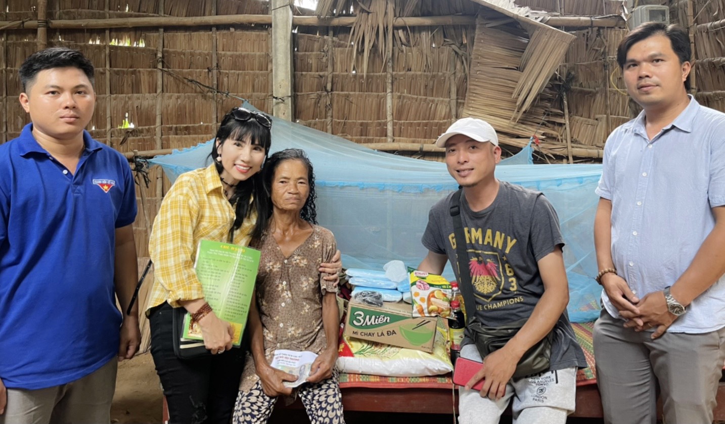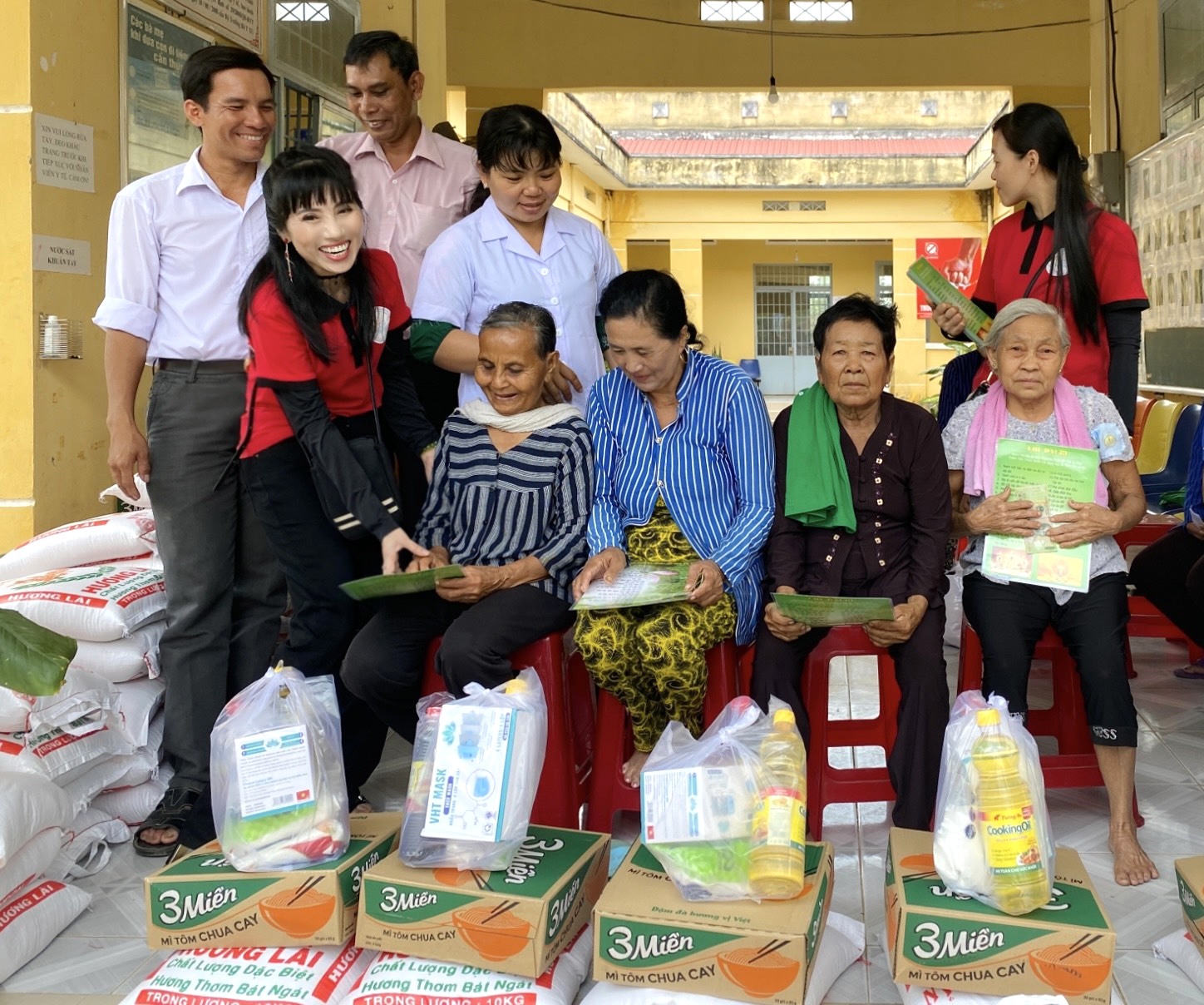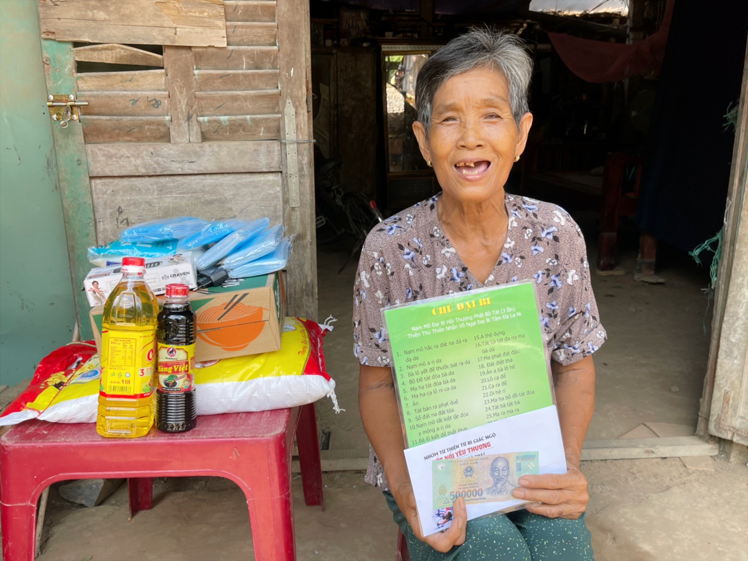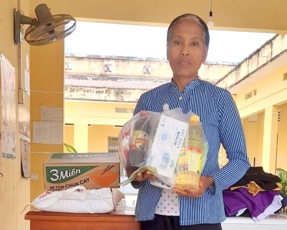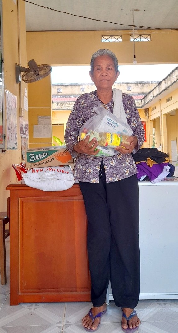 50 phần quà trao tận tay bà con trị giá là 30 triệu đồng, mỗi phần là 500 ngàn đồng, bao gồm: 10kg gạo, thùng mì, bột nêm, đường, dầu ăn, nước tương, máy nghe pháp, tờ kinh chú Đại Bi, phong bì 100.000 vnd.