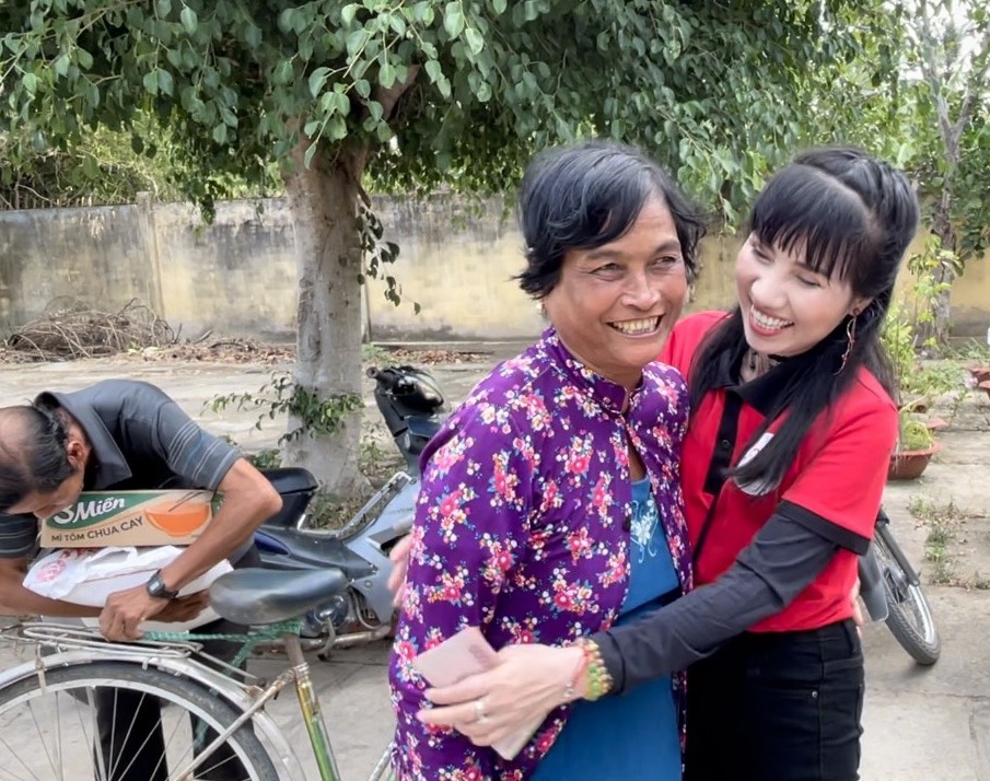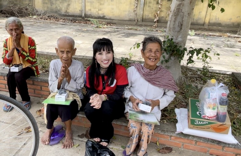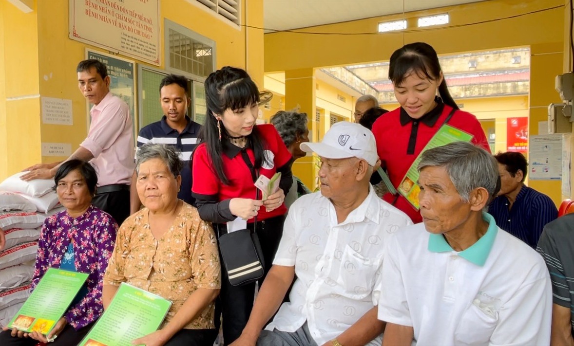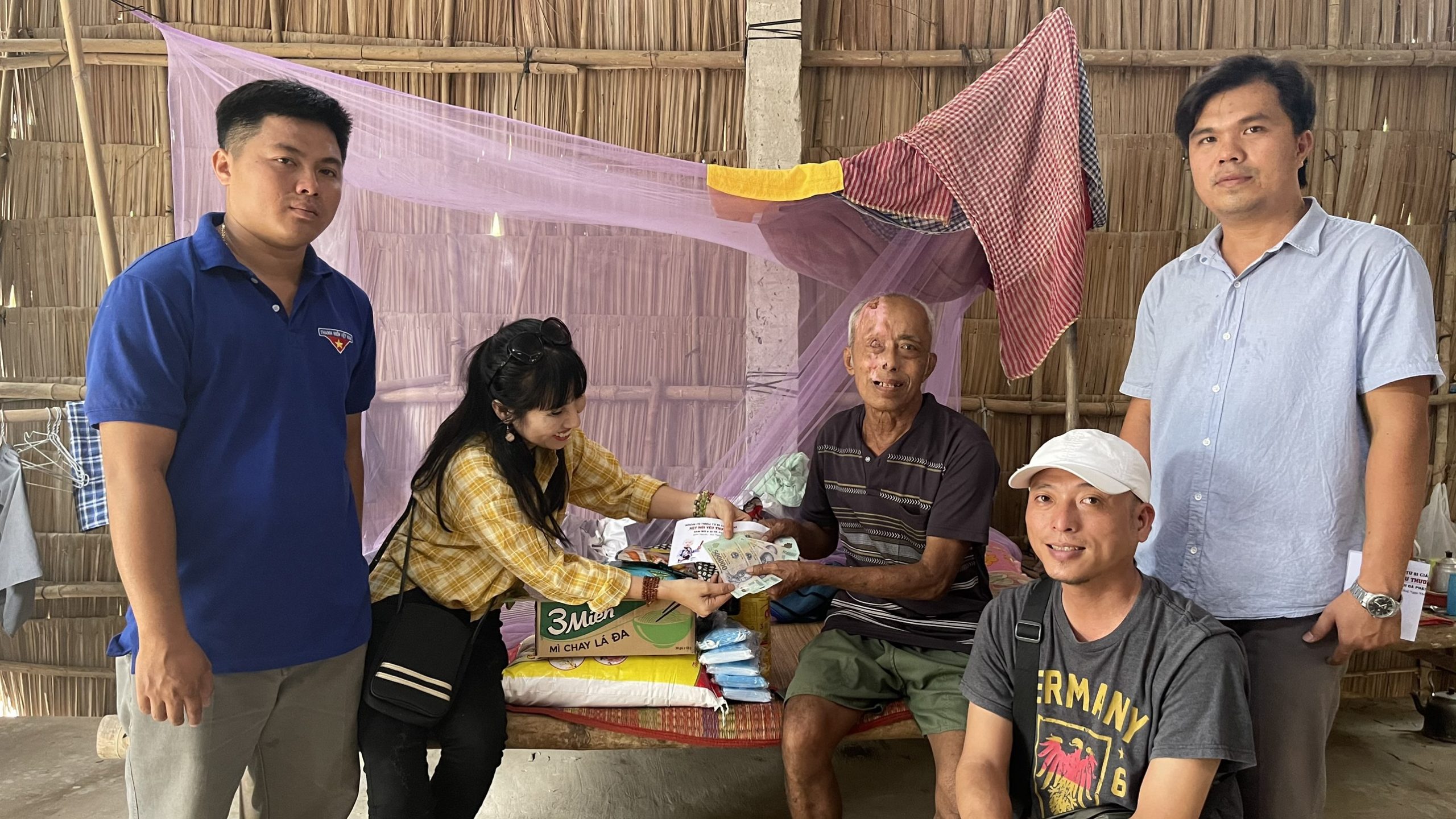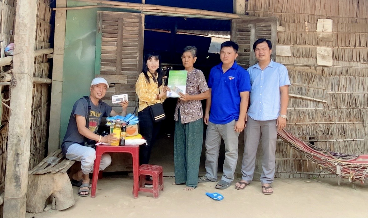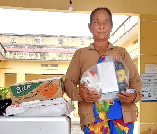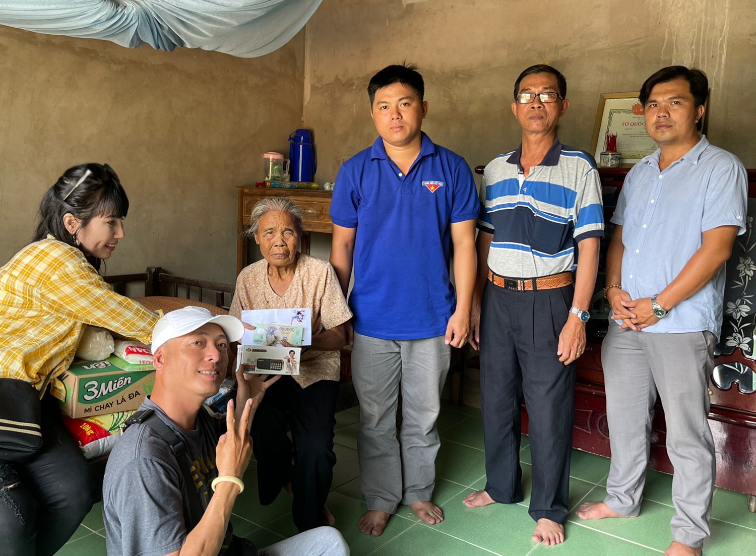 50 phần quà trao tận tay bà con trị giá là 30 triệu đồng, mỗi phần là 500 ngàn đồng, bao gồm: 10kg gạo, thùng mì, bột nêm, đường, dầu ăn, nước tương, máy nghe pháp, tờ kinh chú Đại Bi, phong bì 100.000 vnd.