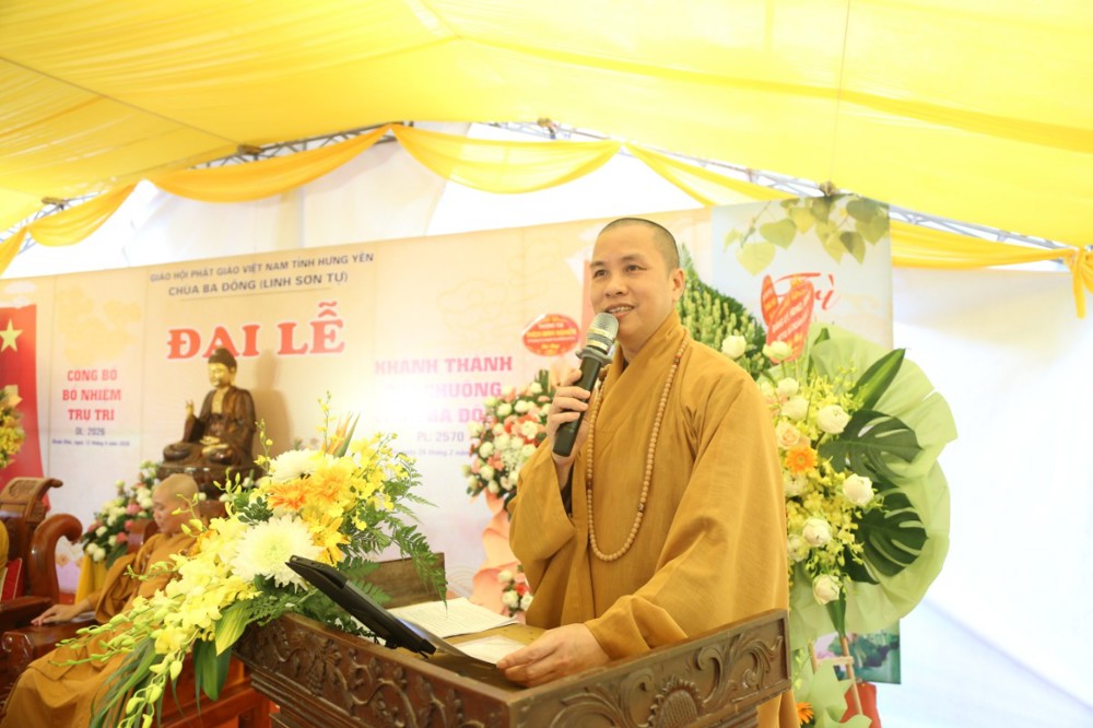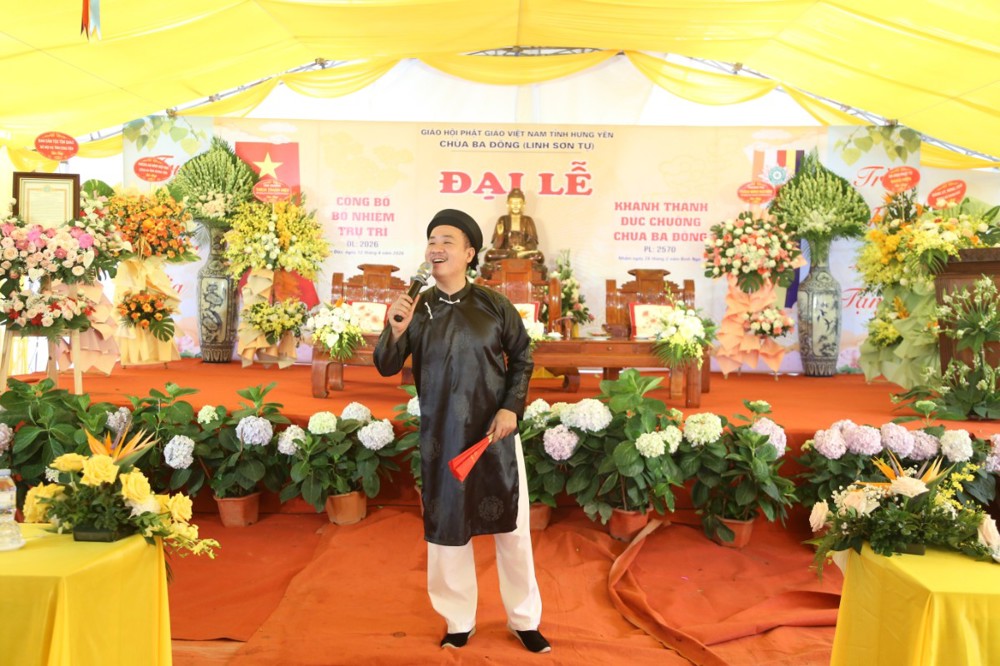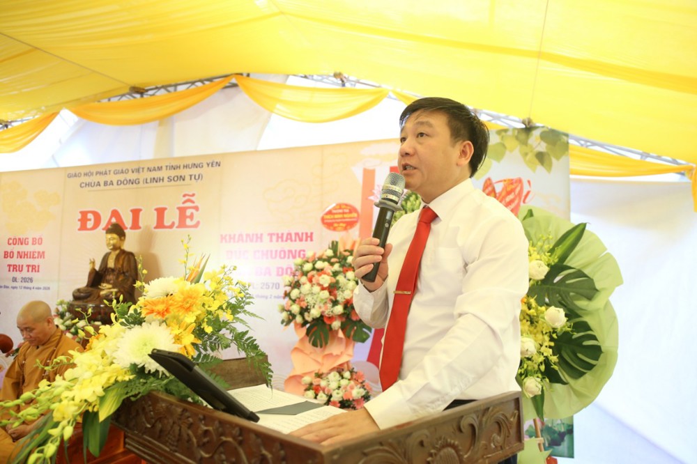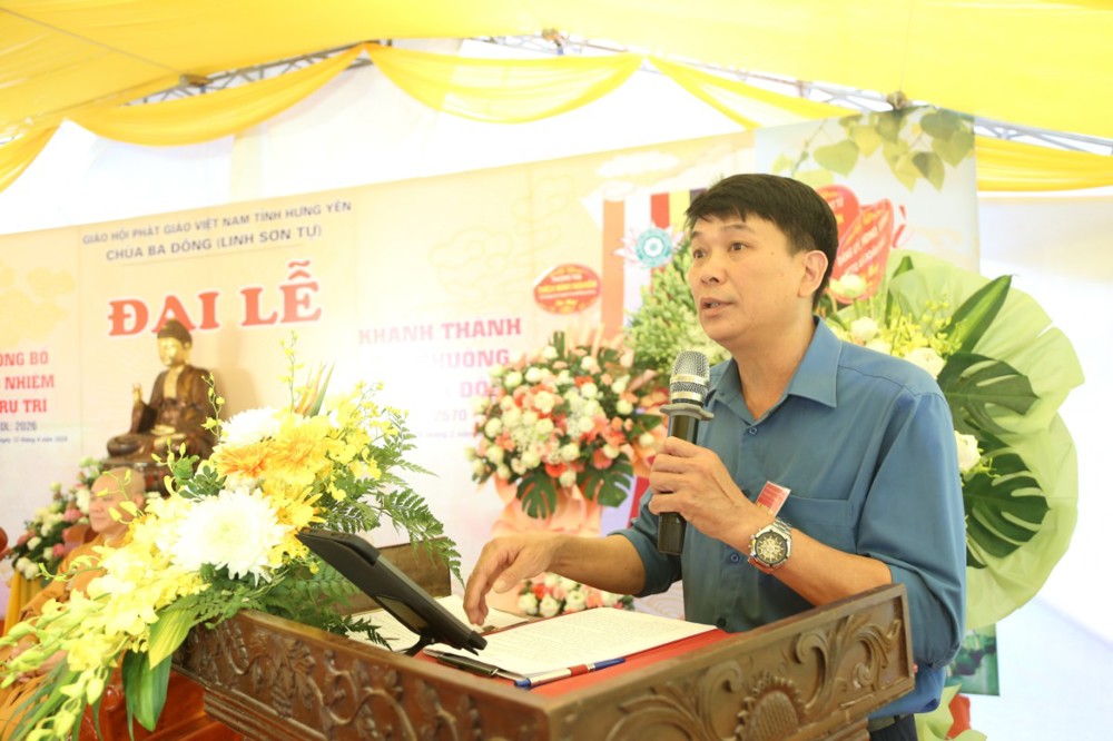 Phát biểu khai mạc, ông Mai Đức Quân nhấn mạnh ý nghĩa đặc biệt của sự kiện đối với đời sống văn hóa, tín ngưỡng của nhân dân địa phương; đồng thời bày tỏ niềm hoan hỷ khi chùa Ba Đông được trùng tu khang trang, đáp ứng nguyện vọng sinh hoạt tâm linh của bà con.