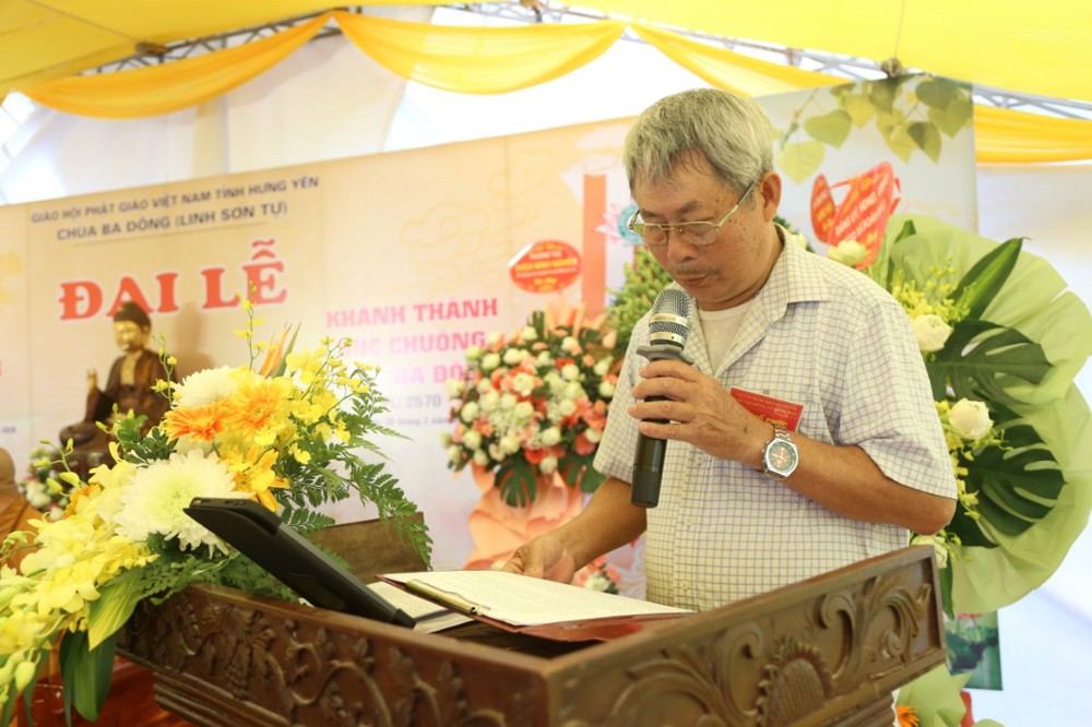 Tiếp đó, ông Trần Văn Dung trình bày báo cáo quá trình xây dựng, trùng tu chùa Ba Đông với tổng kinh phí khoảng 10 tỷ đồng. Công trình là kết tinh từ tâm huyết, công sức và sự đồng lòng của chư Tôn đức, các cấp lãnh đạo, nhân dân và Phật tử gần xa. Việc trùng tu, tôn tạo không chỉ đáp ứng nhu cầu tín ngưỡng của nhân dân mà còn góp phần bảo tồn, phát huy giá trị văn hóa tâm linh truyền thống của dân tộc, tạo điều kiện thuận lợi cho Tăng Ni và Phật tử an tâm tu học.