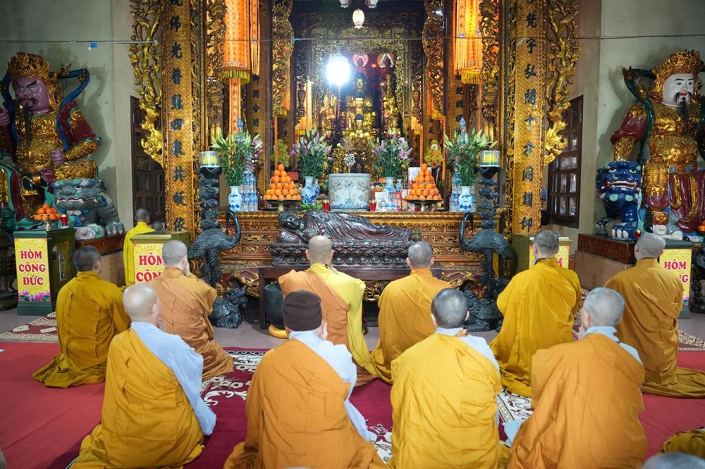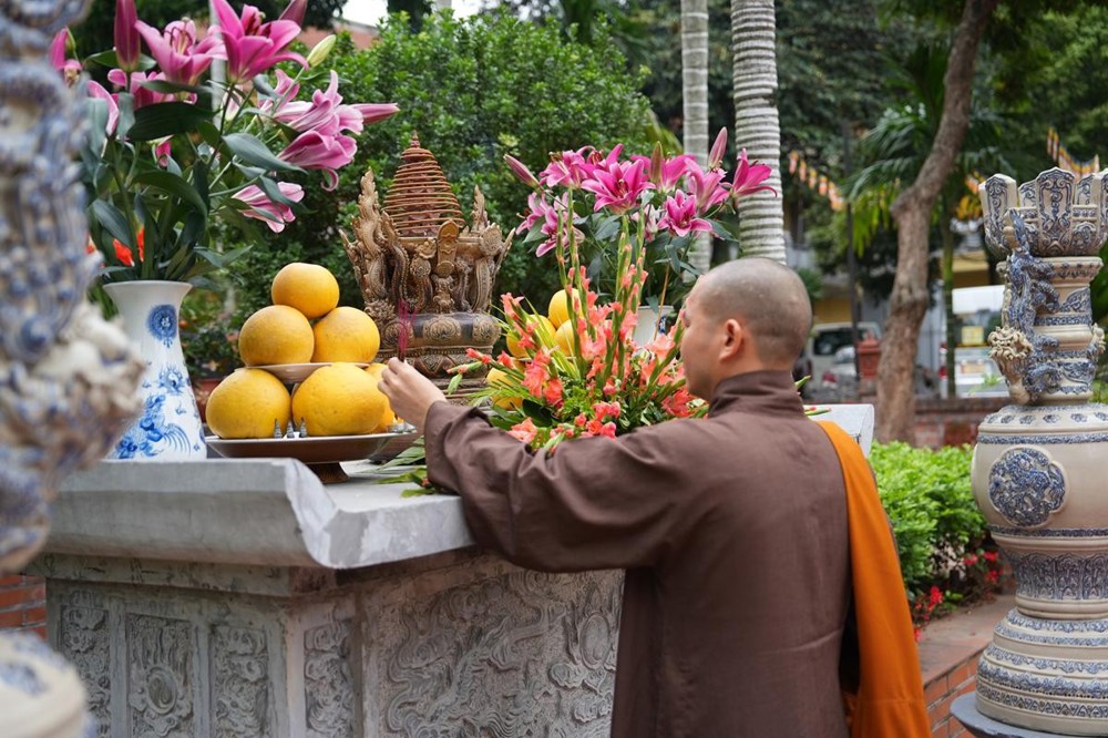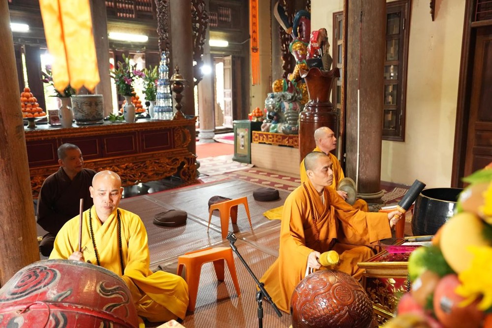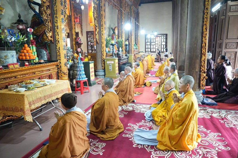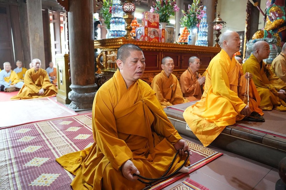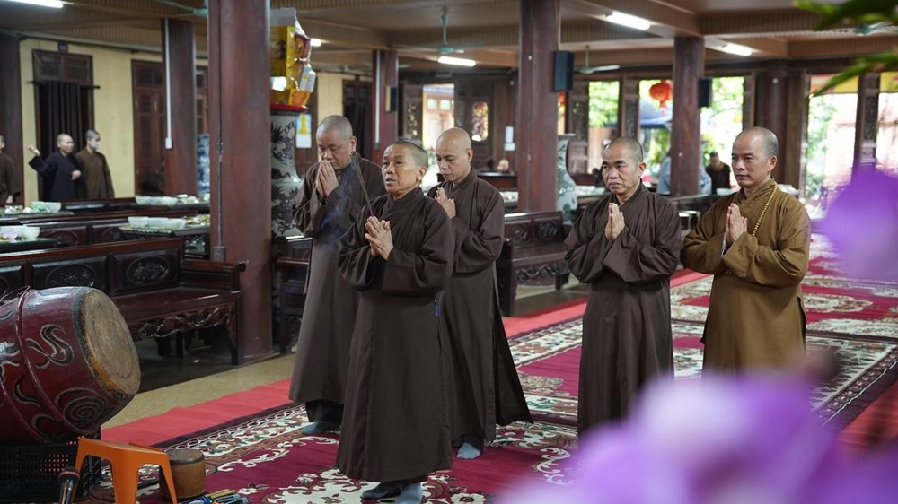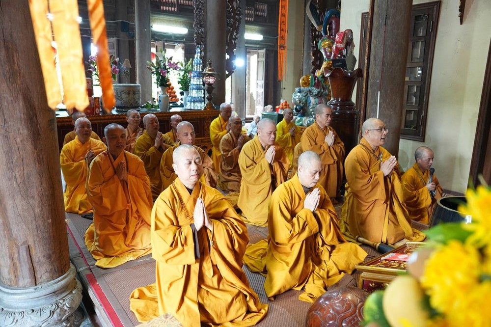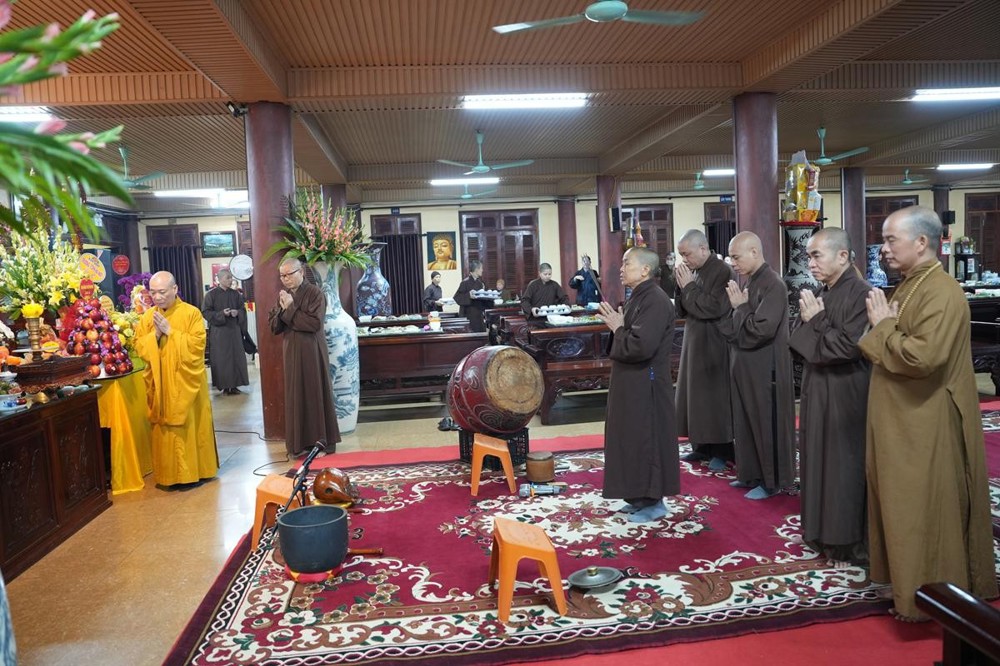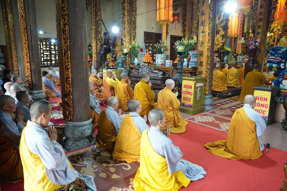 Trong không khí trang nghiêm nơi chốn Tổ, chư tôn đức đã thành kính cử hành nghi thức cúng Phật, cúng Tổ, sau đó vân tập trước Tam Bảo tụng thời Kinh A Di Đà huân tu, nhất tâm hướng lòng tưởng niệm bậc tôn túc khả kính đã trọn đời hiến dâng cho Đạo pháp và Dân tộc. Sau thời kinh, chư tôn đức cùng đại chúng trang nghiêm nhiễu quanh bảo tháp thờ Đức Đệ nhị Pháp chủ, dâng nén tâm hương tri ân và kính ngưỡng trước đạo phong cao khiết của bậc long tượng thiền môn.