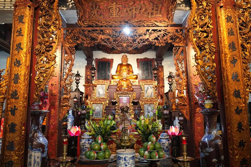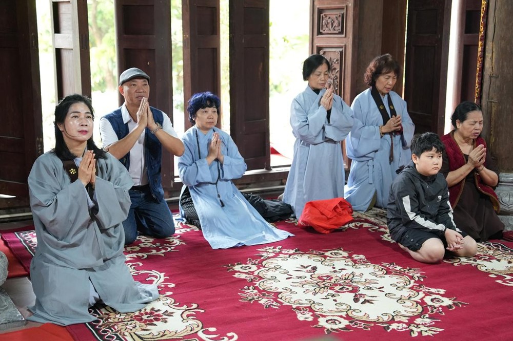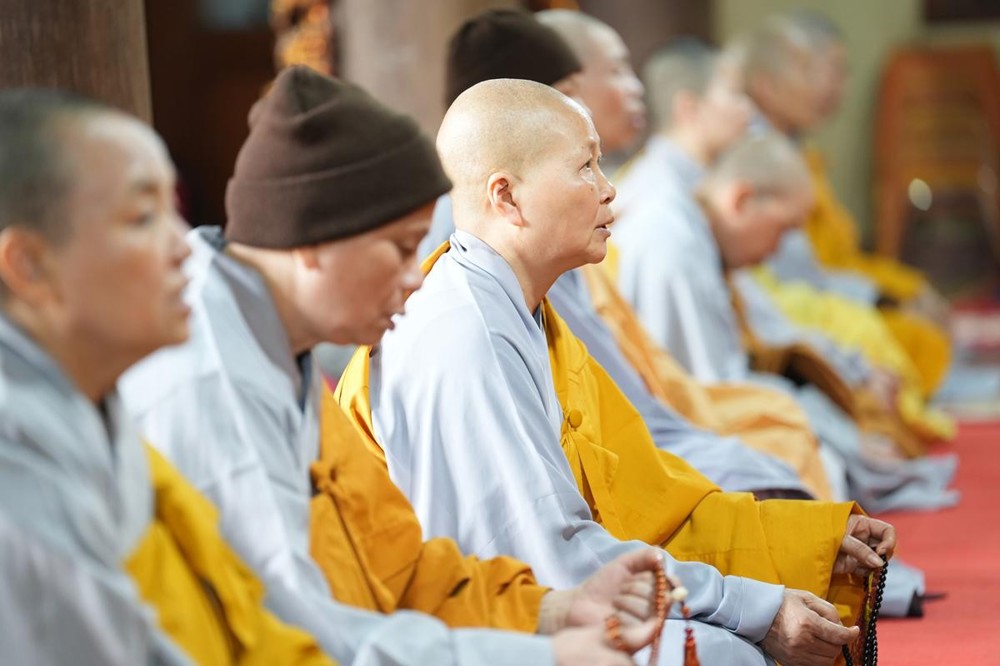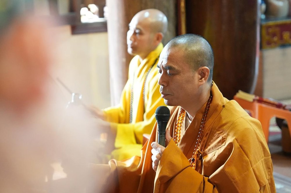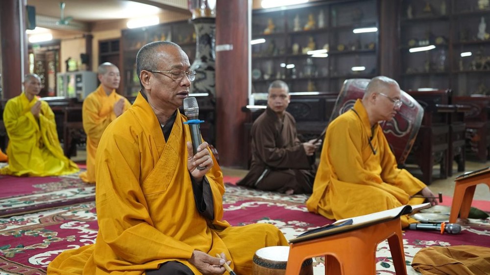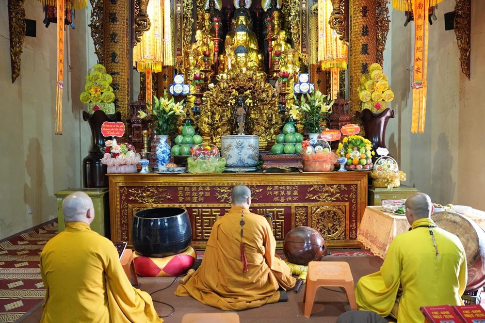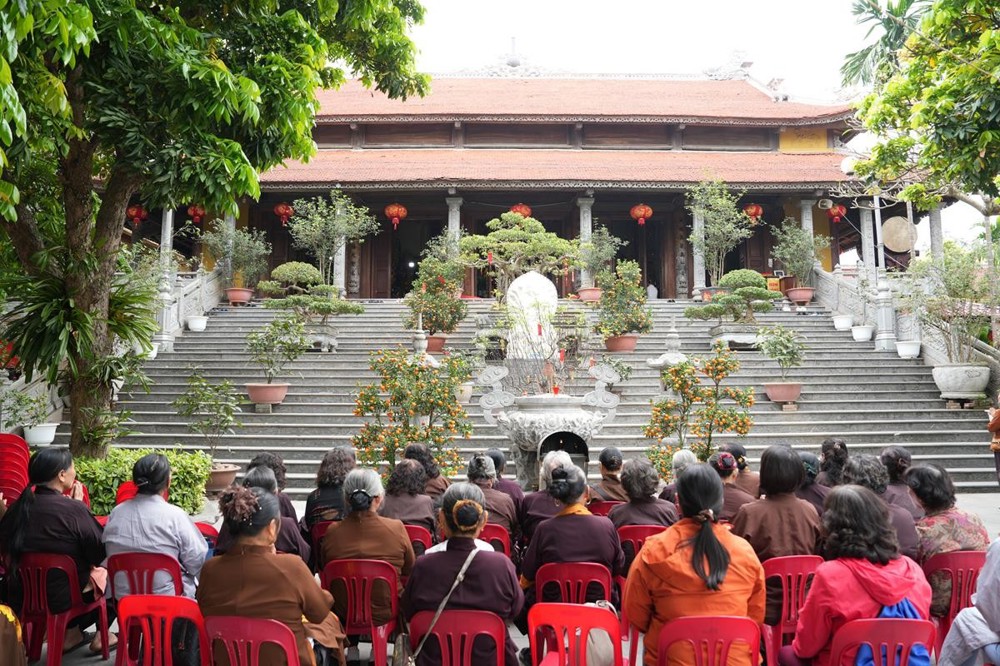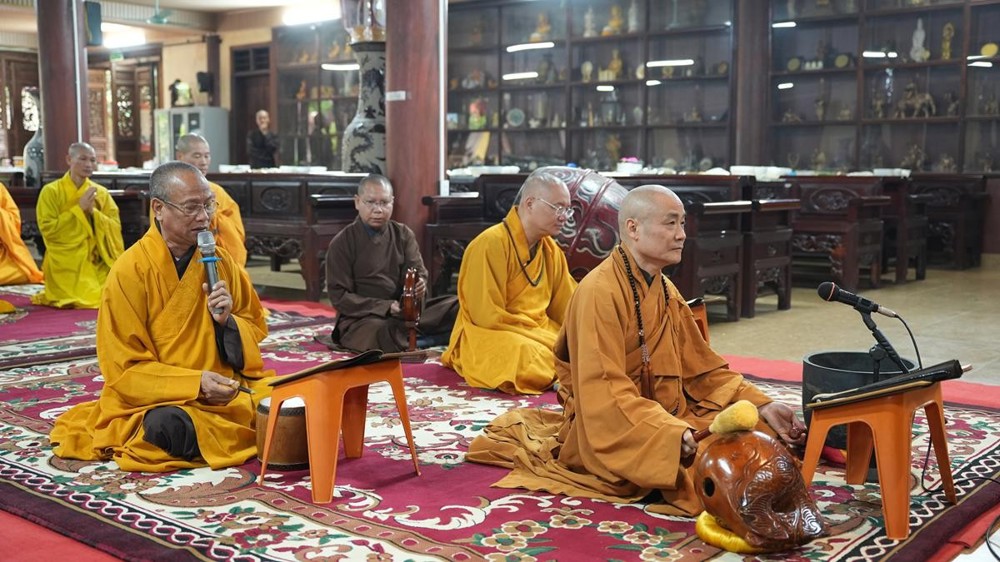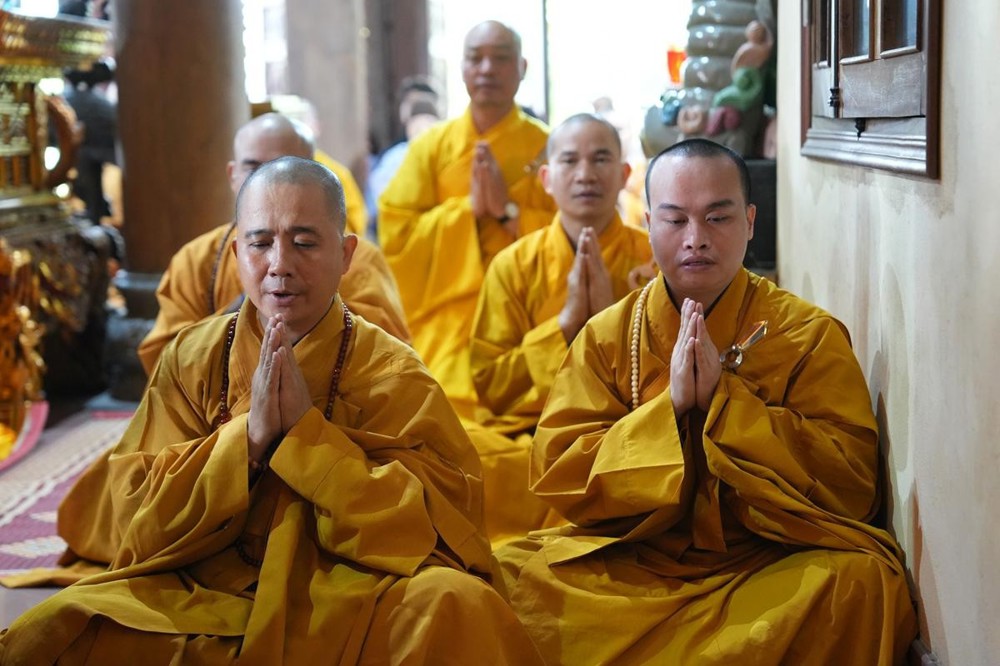 Trong không khí trang nghiêm nơi chốn Tổ, chư tôn đức đã thành kính cử hành nghi thức cúng Phật, cúng Tổ, sau đó vân tập trước Tam Bảo tụng thời Kinh A Di Đà huân tu, nhất tâm hướng lòng tưởng niệm bậc tôn túc khả kính đã trọn đời hiến dâng cho Đạo pháp và Dân tộc. Sau thời kinh, chư tôn đức cùng đại chúng trang nghiêm nhiễu quanh bảo tháp thờ Đức Đệ nhị Pháp chủ, dâng nén tâm hương tri ân và kính ngưỡng trước đạo phong cao khiết của bậc long tượng thiền môn.