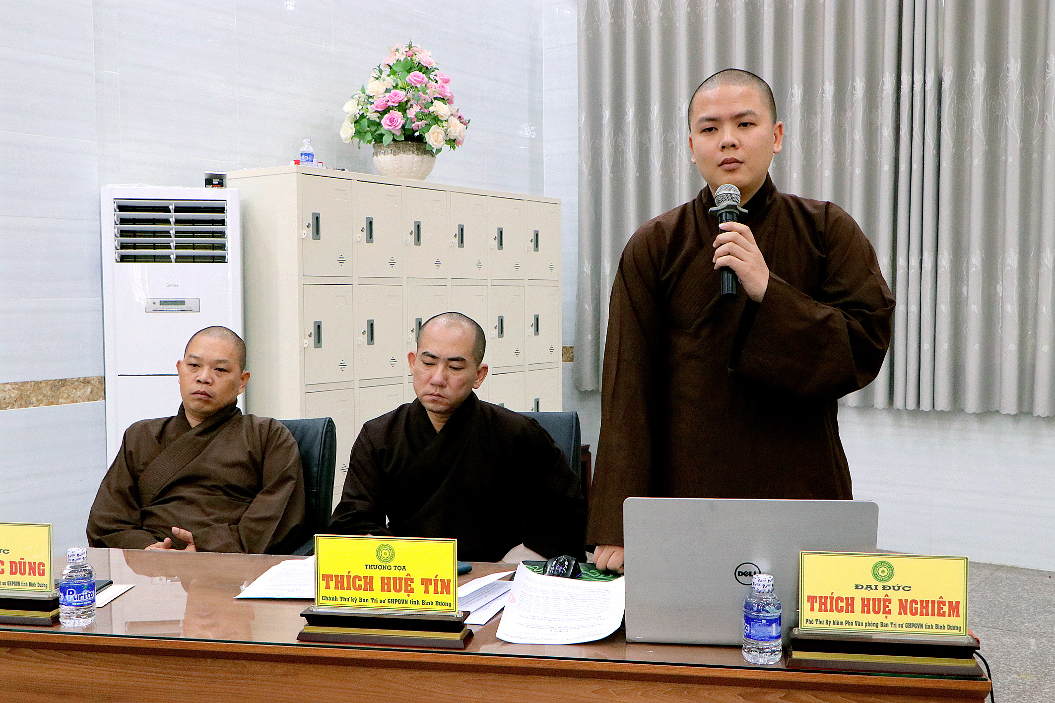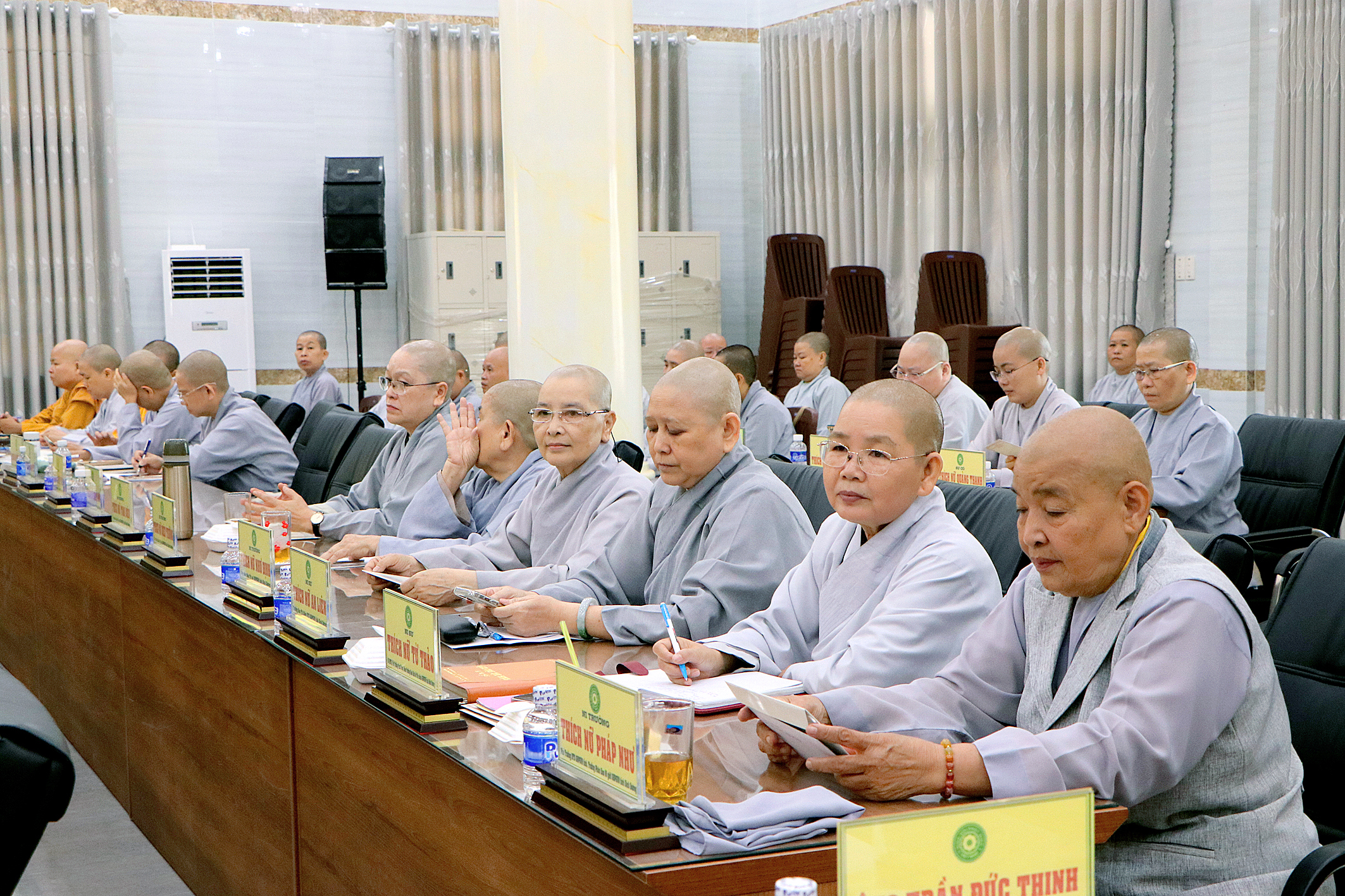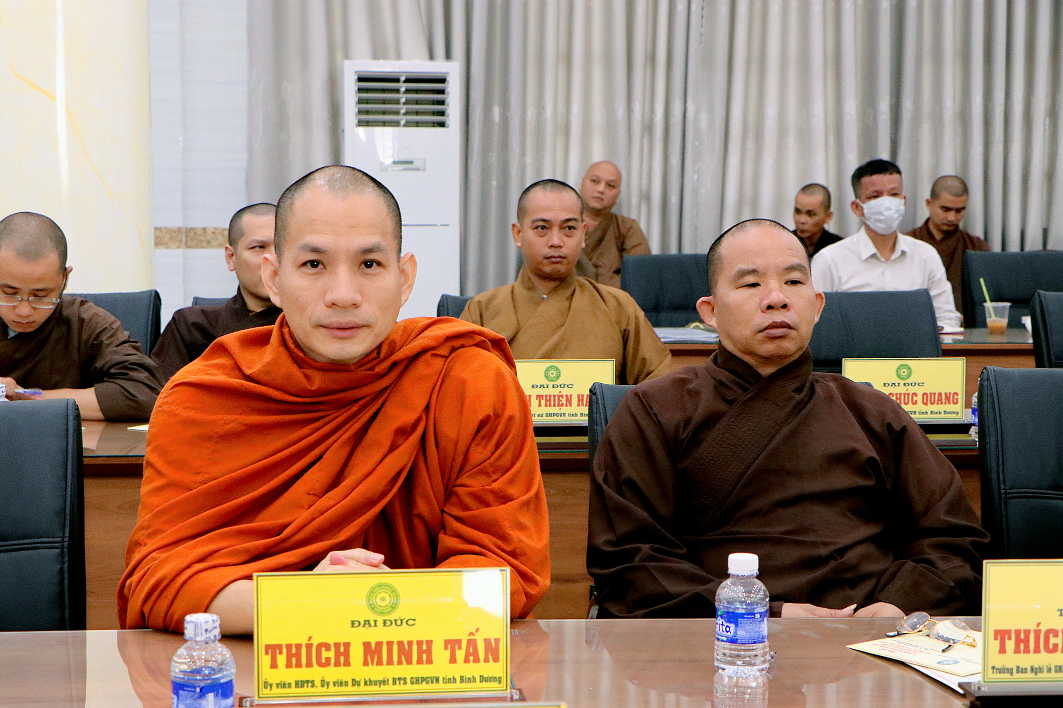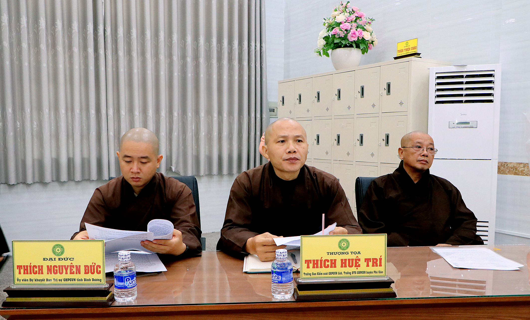 Quang lâm chứng minh và chủ trì phiên họp có: Hòa thượng Thích Huệ Thông – Phó Chủ tịch HĐTS, Trưởng ban Pháp chế Trung ương, Trưởng ban Trị sự GHPG Việt Nam tỉnh Bình Dương; HT. Thích Thiện Duyên – Ủy viên HĐTS, Phó ban Thường trực BTS GHPGVN tỉnh; TT. Thích Chơn Phát - Uỷ viên HĐTS, Phó BTS kiêm Trưởng ban Giáo dục Phật giáo tỉnh; TT. Thích Minh Vũ – Phó BTS, Trưởng ban Hoằng pháp Phật giáo tỉnh; TT. Thích Minh Lực – Phó ban Trị sự, Trưởng ban Phật giáo Quốc tế GHPGVN tỉnh; ĐĐ. Thích Thiện Hưng - Phó ban Trị sự, Trưởng ban Thông tin Truyền thông PG tỉnh; Ni trưởng Thích nữ Pháp Như – Phó ban Trị sự, Trưởng Phân ban Ni giới GHPGVN tỉnh; Ni sư Thích nữ Từ Thảo – Ủy viên HĐTS, Phó trưởng Phân ban kiêm Trưởng ban Pháp chế Phân ban Ni giới TƯ, Phó BTS kiêm Trưởng ban Kinh tế Tài chánh GHPGVN tỉnh; TT. Thích Huệ Tín – Chánh Thư ký Ban Trị sự Phật giáo tỉnh; ĐĐ. Thích Đức Dũng – Phó Thư ký kiêm Chánh Văn phòng Ban Trị sự Phật giáo tỉnh; ĐĐ. Thích Huệ Nghiêm – Phó Thư ký kiêm Phó Văn phòng Ban Trị sự Phật giáo tỉnh; cùng chư Tôn đức Tăng Ni Thường trực BTS, các ban chuyên trách, chư Tôn đức Tăng Ni 09 huyện, thị, thành phố trực thuộc Phật giáo tỉnh Bình Dương và đặc biệt có Ông Trần Đức Thịnh - Phó Giám đốc Sở Nội vụ, Trưởng ban Tôn giáo tỉnh Bình Dương đồng tham dự.