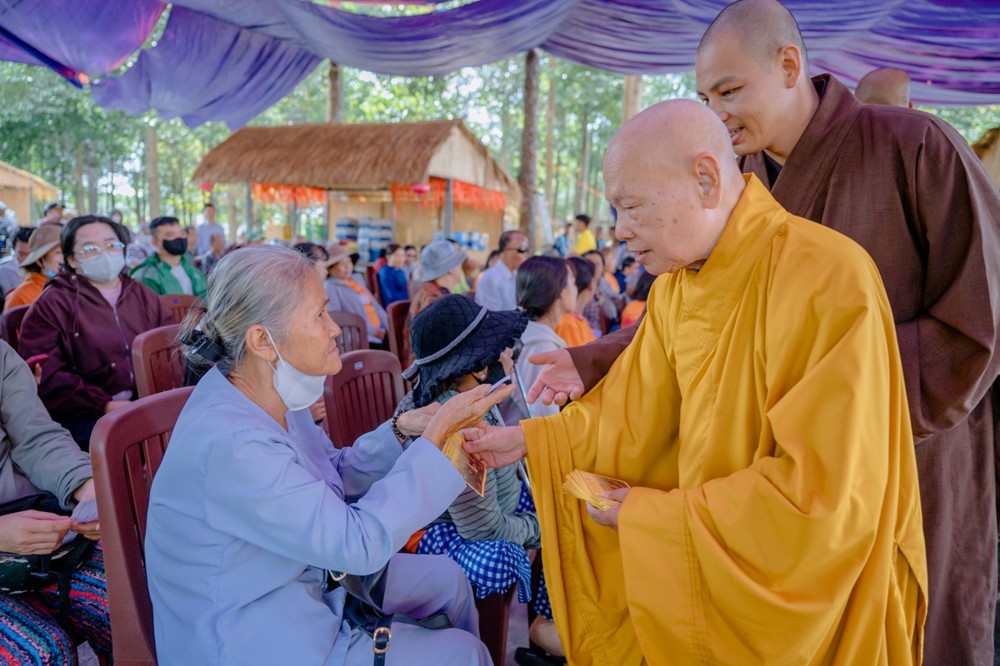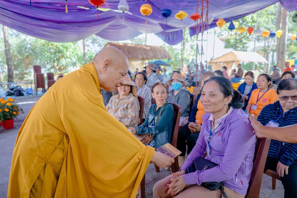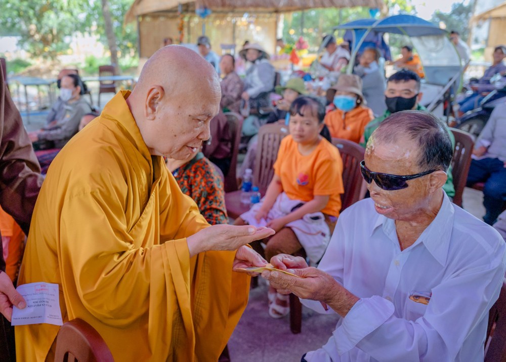 Bên cạnh đó, Trưởng lão Hòa thượng cũng trao 200 phần quà Tết đến người khiếm thị, người già neo đơn và các hoàn cảnh khó khăn tại địa phương. Những phần quà tuy giá trị vật chất không lớn nhưng thấm đượm tinh thần từ bi, sẻ chia trong những ngày đầu xuân năm mới. Được biết, 300 phần quà do gia đình Phật tử Tuệ Cang – Giác Hoa phát tâm tài trợ.