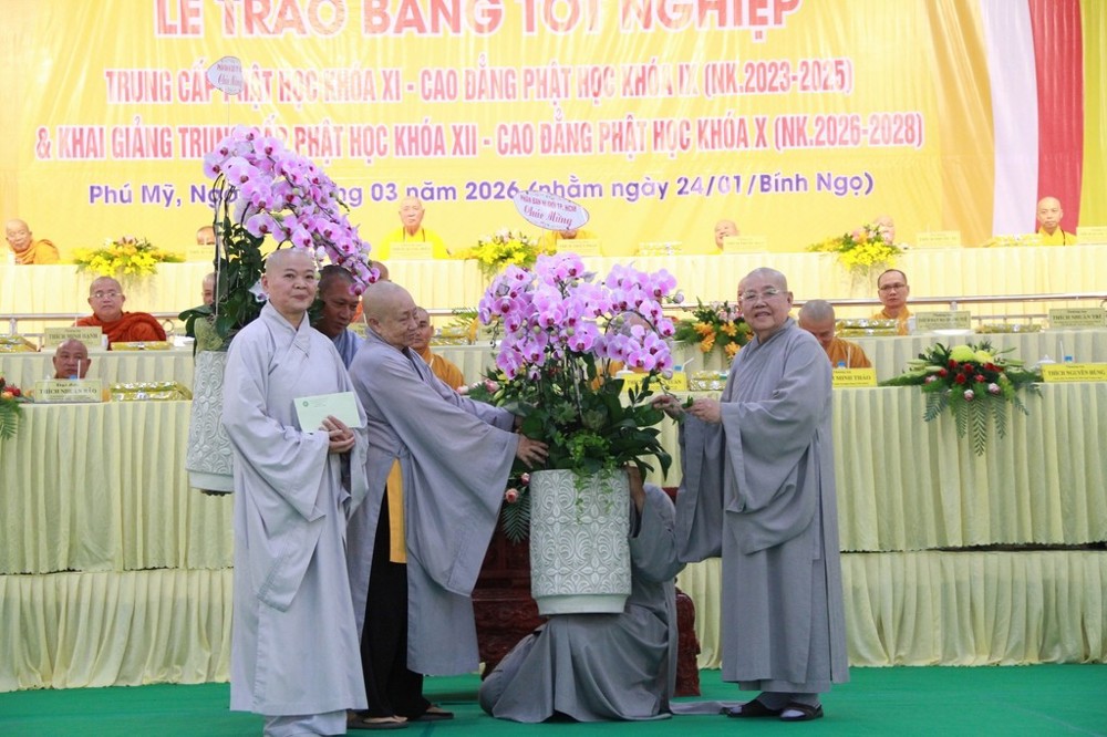 Theo báo cáo, trong niên khóa 2023–2025 có 78 Tăng Ni sinh tốt nghiệp Trung cấp Phật học và 24 Tăng Ni sinh tốt nghiệp Cao đẳng Phật học. Nhân dịp này, Thượng tọa Thích Viên Trí và Thượng tọa Thích Quang Thạnh thay mặt Ban Giáo dục Phật giáo Trung ương đã trao tặng quà và học bổng đến các Tăng Ni sinh có thành tích học tập xuất sắc. Đồng thời, Ban Giám hiệu nhà trường cũng trao tặng nhiều phần quà và học bổng nhằm khích lệ tinh thần học tập của Tăng Ni sinh.
