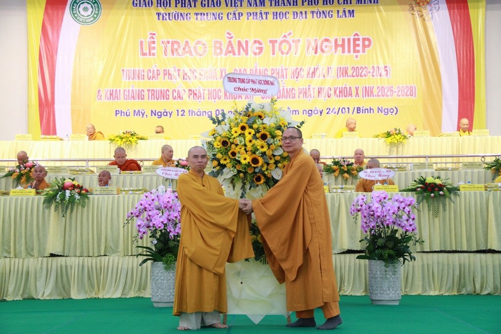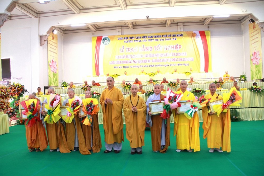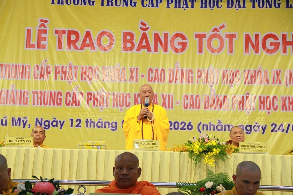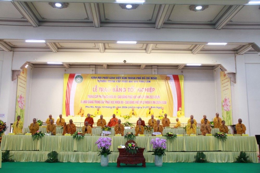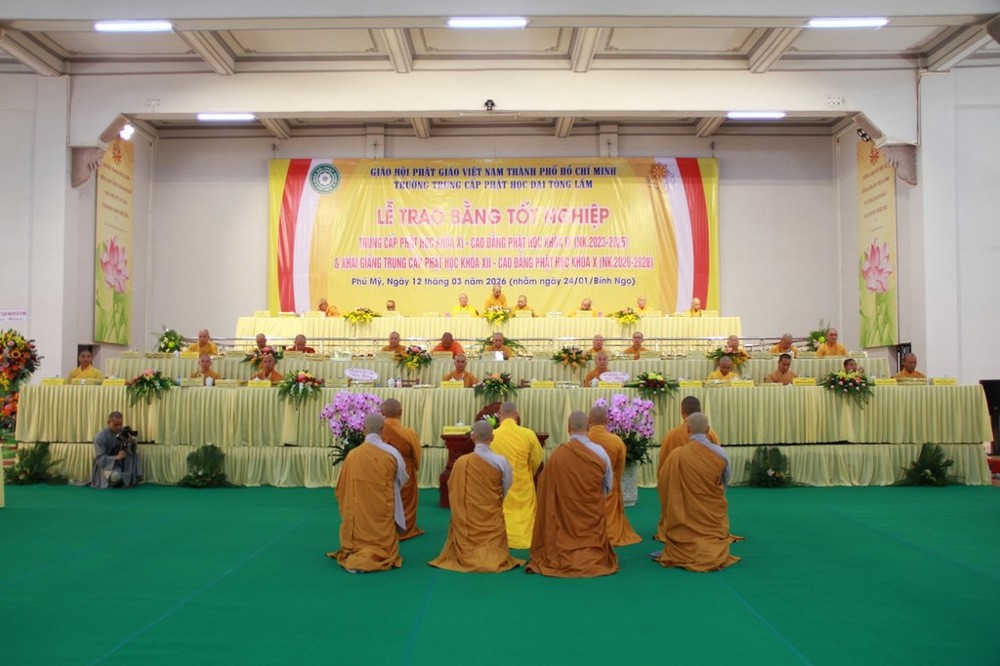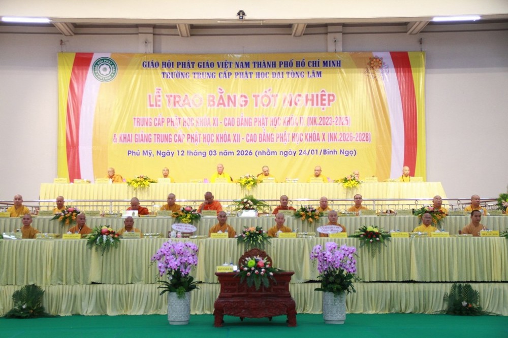 PSO - Sáng ngày 12/3/2026 (nhằm ngày 24 tháng Giêng năm Bính Ngọ), Ban Giám hiệu Trường Trung cấp Phật học Đại Tòng Lâm đã trang nghiêm tổ chức Lễ tốt nghiệp và ra trường cho Tăng Ni sinh lớp Trung cấp Phật học khóa XI – Cao đẳng khóa IX (niên khóa 2023–2025), đồng thời khai giảng niên khóa 2026–2028 cho Tăng Ni sinh lớp Trung cấp Phật học khóa XII – Cao đẳng khóa X.
