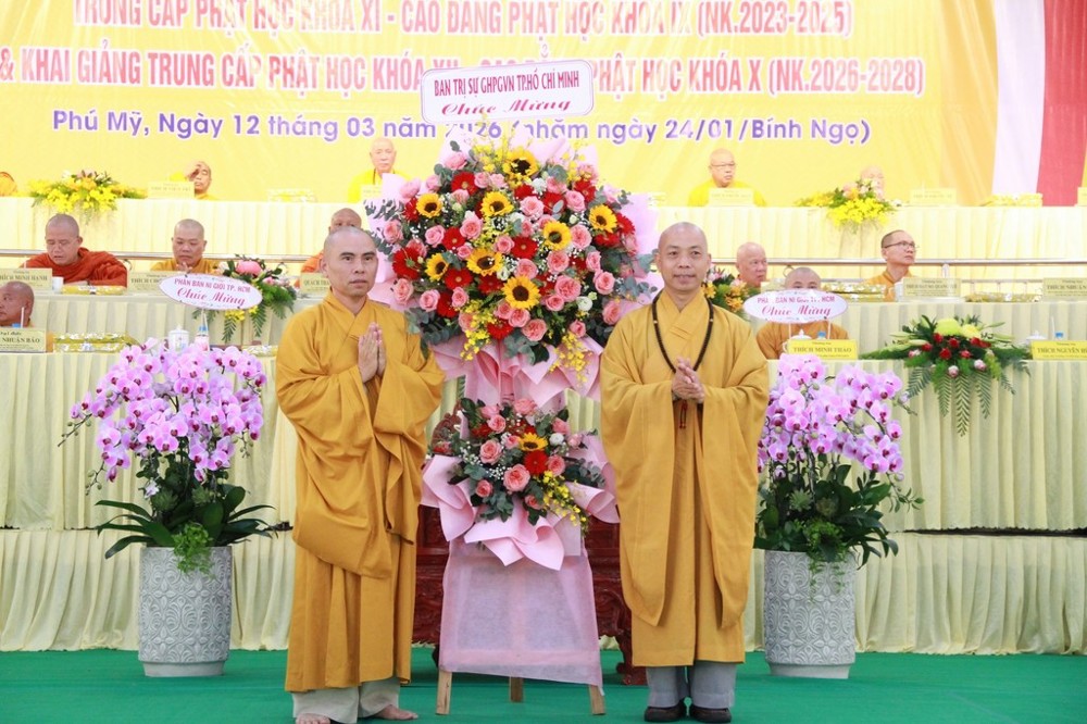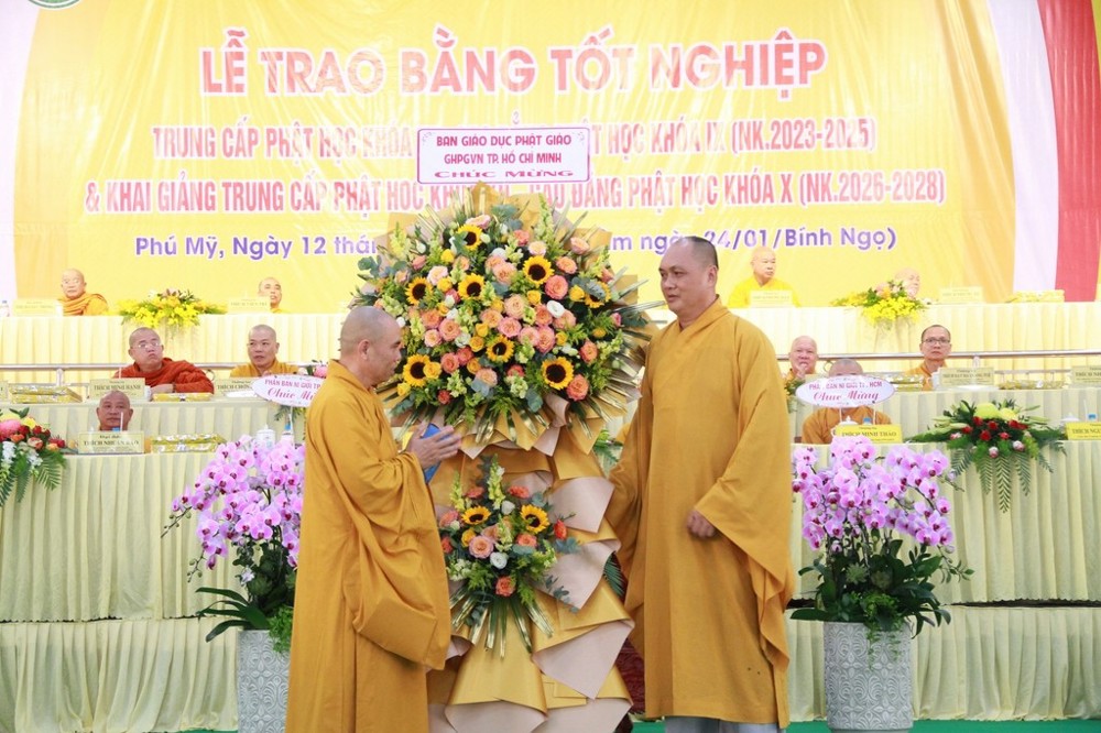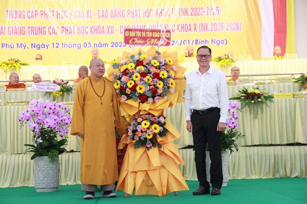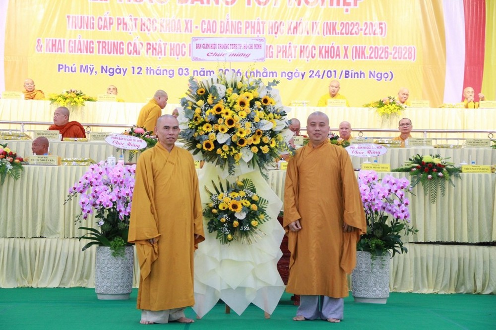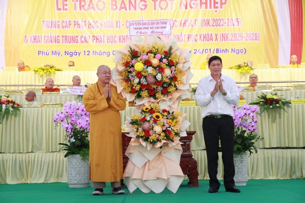 Phát biểu tại buổi lễ, ông Tạ Minh Phong, Phó Giám đốc Sở Dân tộc và Tôn giáo TP.HCM cho biết ông rất ấn tượng với kết quả đào tạo của nhà trường trong niên khóa 2023–2025. Ông ghi nhận sự chuẩn mực trong công tác tuyển sinh đầu cấp, sự tận tâm của đội ngũ Giáo thọ cũng như tinh thần học tập của Tăng Ni sinh. Thay mặt chính quyền thành phố, ông khẳng định sẽ tiếp tục ủng hộ phương hướng hoạt động của nhà trường trong niên khóa 2026–2028, đặc biệt là chủ trương sáp nhập ba trường Phật học trên địa bàn.