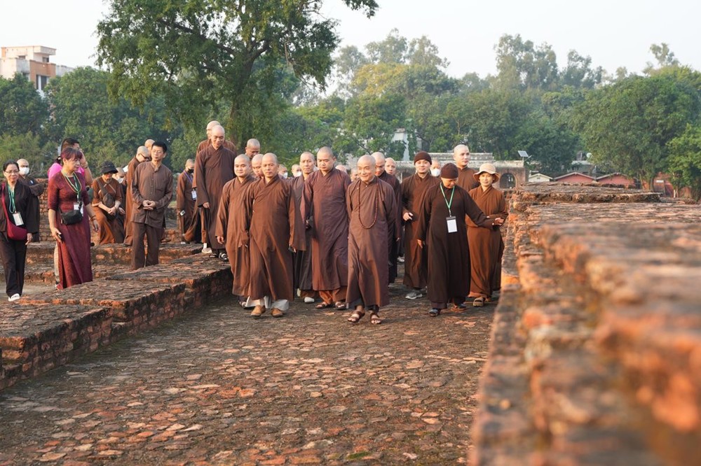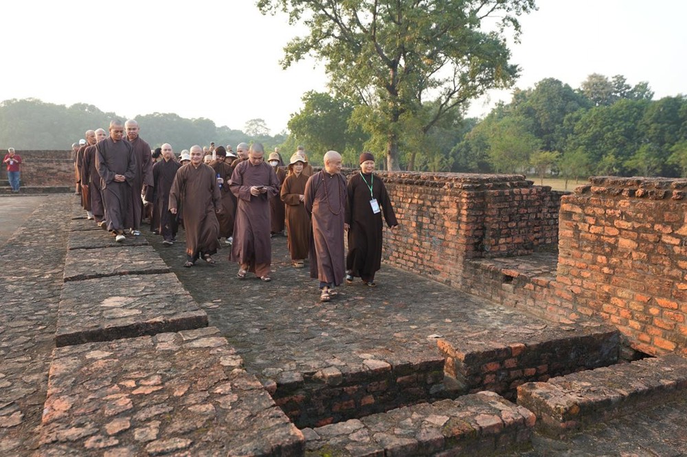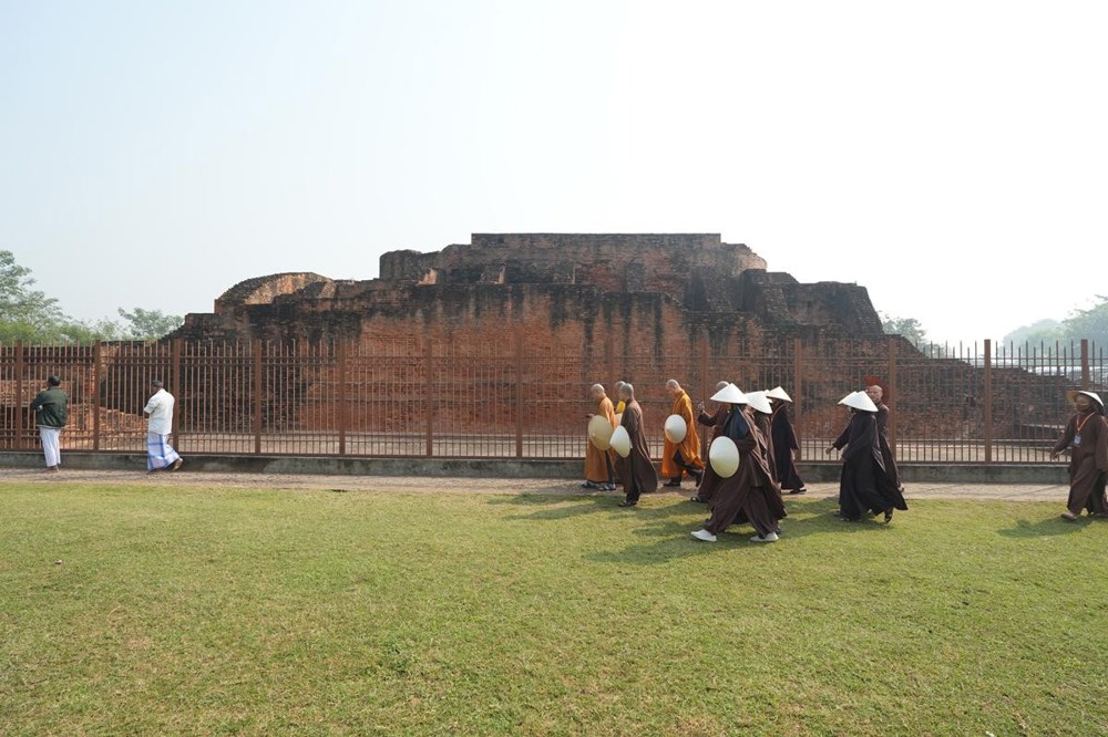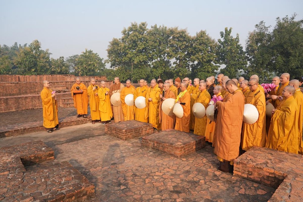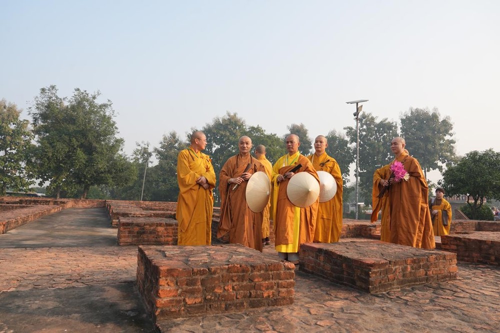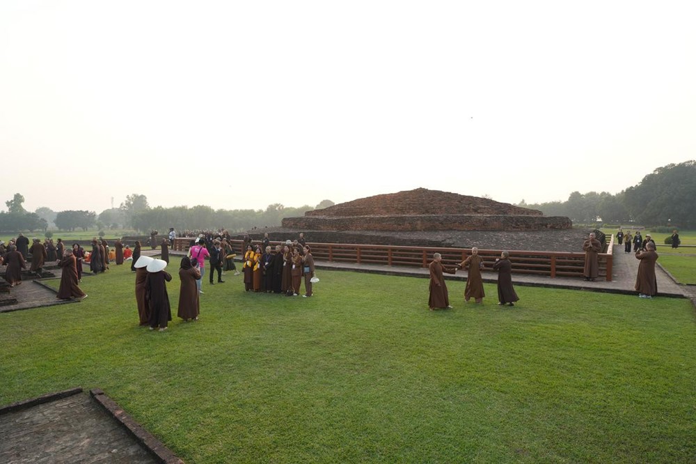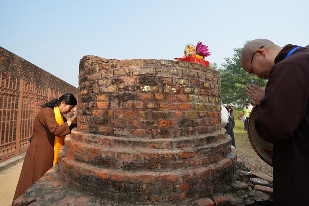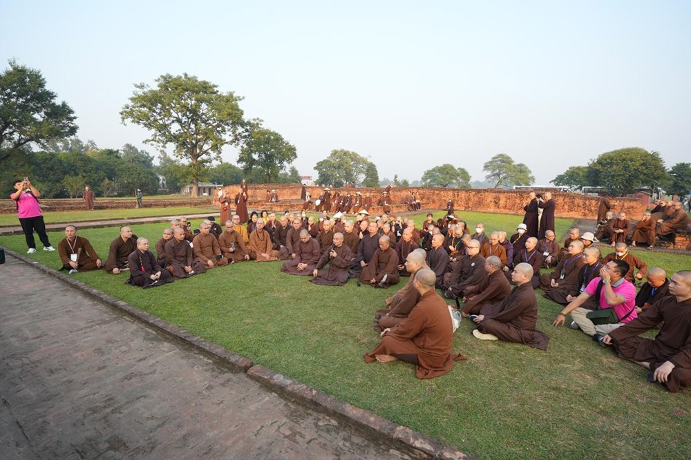 Tại khu thánh địa, đại chúng đã nghe Thượng tọa Thích Tiến Đạt thuyết bài pháp ngắn nói về ý nghĩa đặc thù của mô hình Tịnh xá trong Phật giáo nguyên thủy, về vai trò của Jetavana như cội nguồn của nền giáo dục Phật giáo sơ kỳ. Sau đó, đoàn đã trang nghiêm thành kính tụng thời Kinh A Di Đà, nhiễu Phật ba vòng quanh cây Bồ Đề, đồng thời đỉnh lễ trước những di tích còn hiện hữu: cây Bồ Đề do Tôn giả A Nan trồng, nền hương thất của Đức Thế Tôn, cùng các tháp thờ tưởng niệm các bậc Thánh Tăng như Xá Lợi Phất, Mục Kiền Liên và La Hầu La. Những dấu tích ấy là từng lớp lịch sử chân thật, đưa Tăng Ni sinh trở về với hơi thở sống động của xã hội Ấn Độ cổ đại, nơi Giáo pháp không chỉ được thuyết giảng mà còn được thể nghiệm và chứng ngộ.