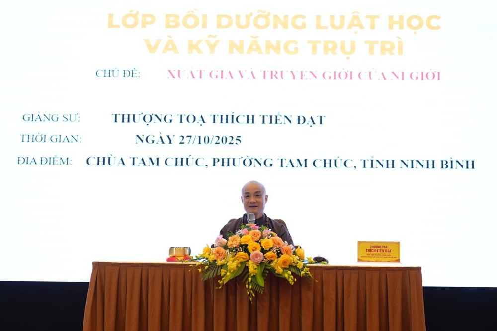 Ngày 27/10/2025, trong không khí trang nghiêm tại chùa Tam Chúc (tỉnh Ninh Bình), Thượng tọa Thích Tiến Đạt – Phó Viện trưởng Viện Nghiên cứu Phật học Việt Nam tại Hà Nội tiếp tục có buổi pháp thoại ý nghĩa với Ni chúng trong Khóa Bồi dưỡng Luật học và Kỹ năng trụ trì, với chủ đề: “Xuất gia và truyền giới của Ni giới”.