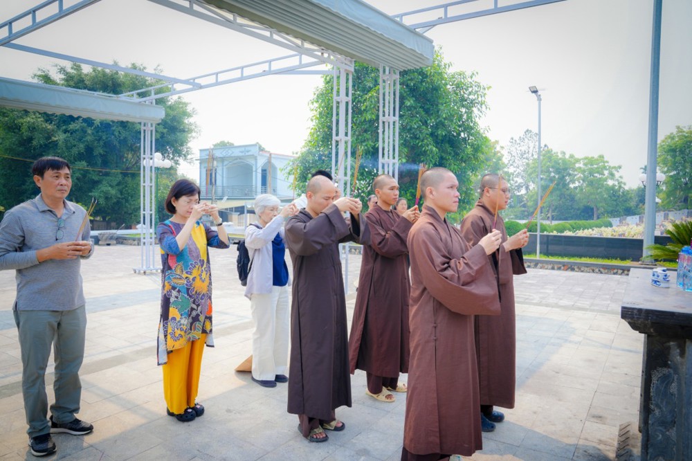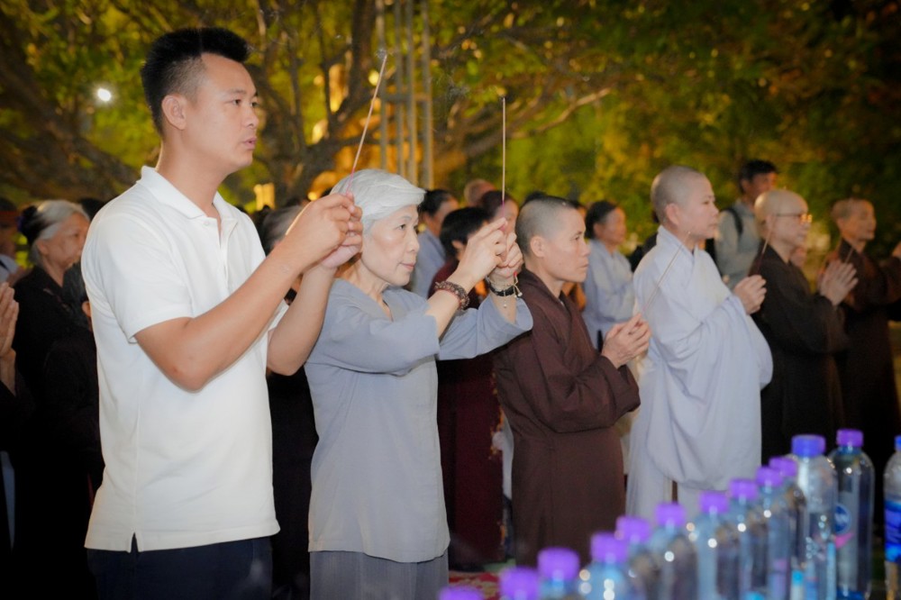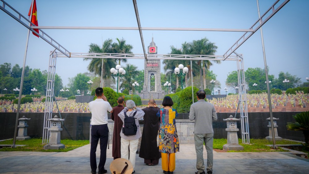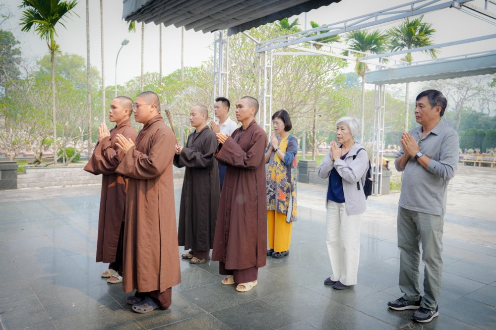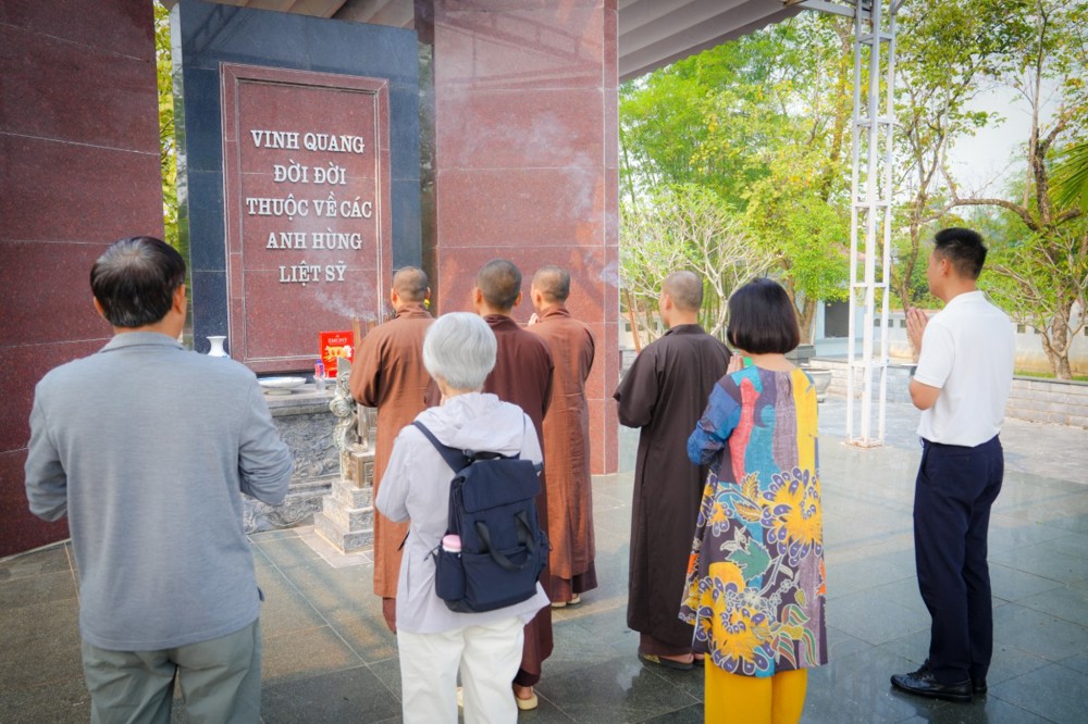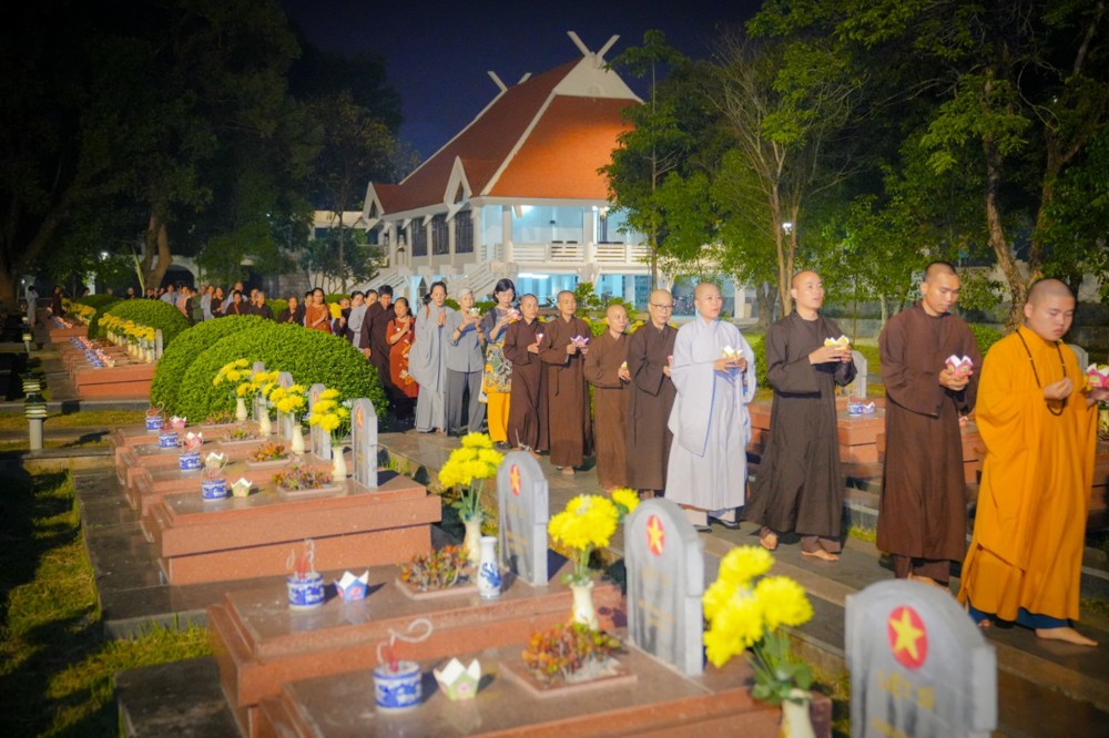 Tiếp đó, đoàn đến dâng hương tại các nghĩa trang Nghĩa trang Độc Lập, Nghĩa trang Tông Khao và Nghĩa trang Him Lam. Đến 18h30, nghi thức thắp nến cầu nguyện tại Nghĩa trang liệt sĩ Quốc gia Đồi A1 được cử hành trang nghiêm. Trong ánh nến lung linh trên 644 phần mộ, đại chúng cùng trì tụng kinh, thiền hành niệm Phật, tưởng niệm các anh hùng liệt sĩ đã hy sinh trong 39 ngày đêm làm nên Chiến thắng Điện Biên Phủ. Không gian linh thiêng ấy đã khắc sâu đạo lý “Uống nước nhớ nguồn”, kết nối hiện tại với những hy sinh của quá khứ.
