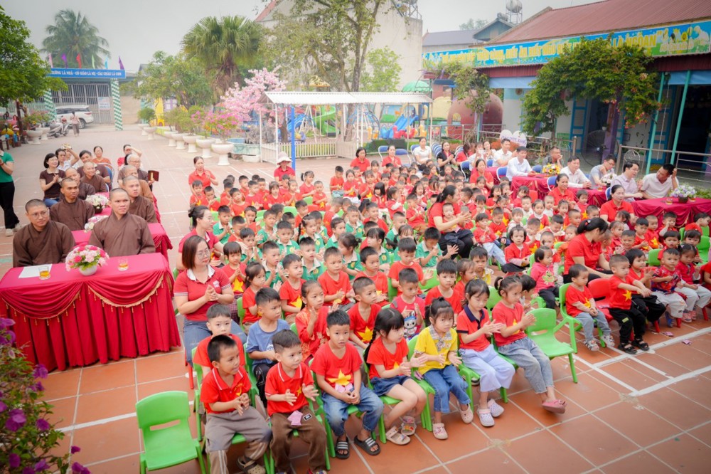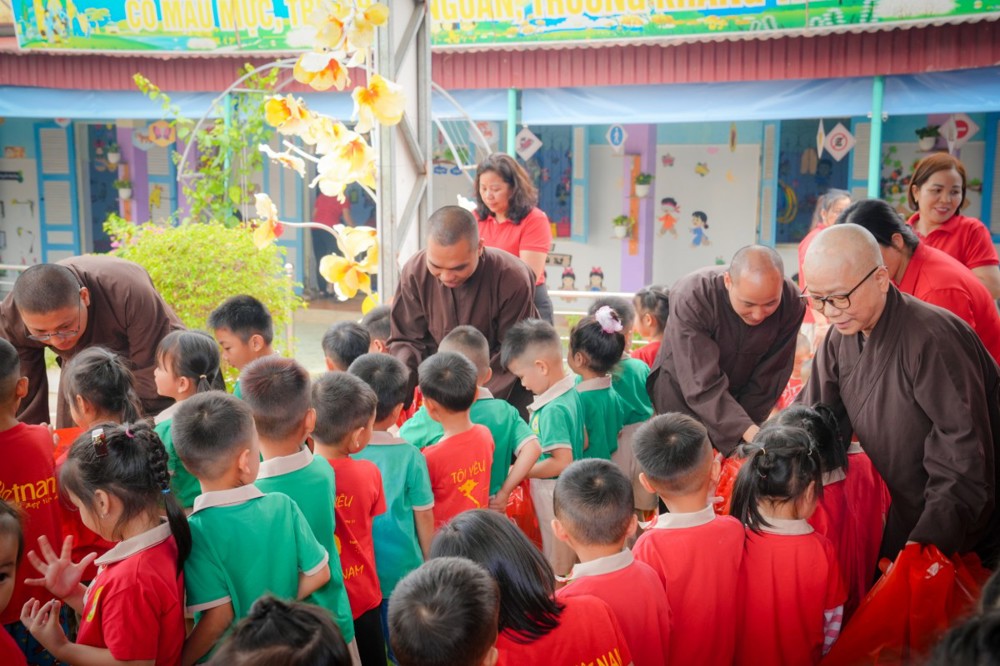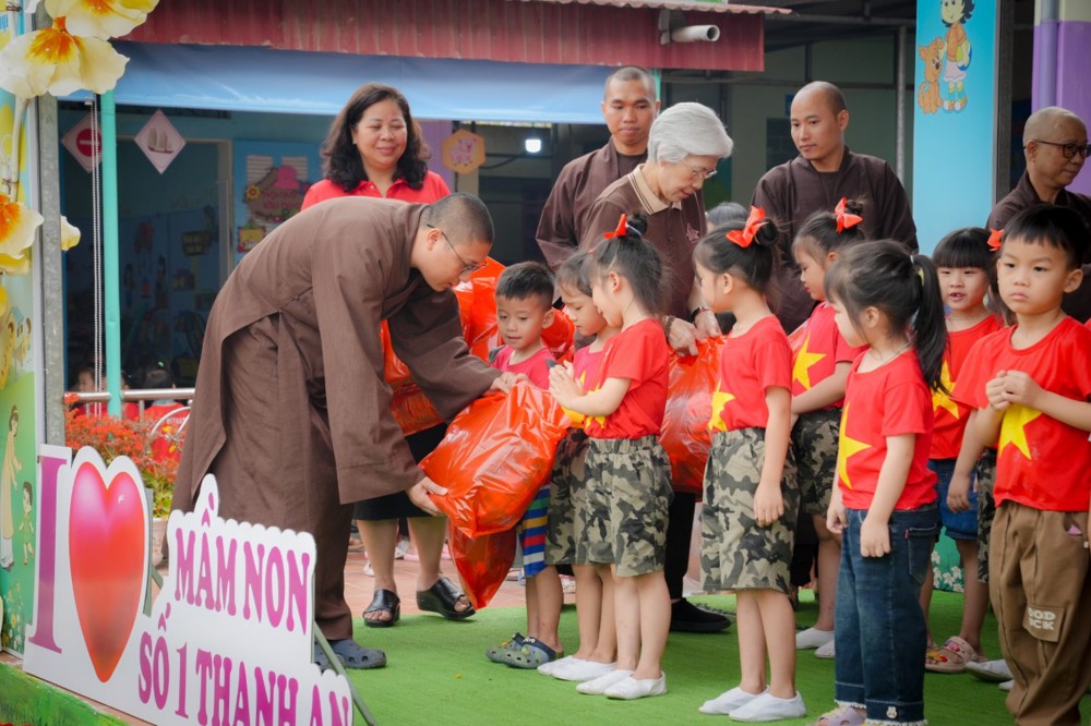 Đại diện đoàn, Thầy Tuệ Định gửi lời thăm hỏi và chia sẻ mong muốn các em được lớn lên trong sự yêu thương, đủ đầy điều kiện để phát triển. Đại diện nhà trường, bà Mai Thị Phương – Hiệu trưởng, bày tỏ lòng biết ơn sâu sắc.