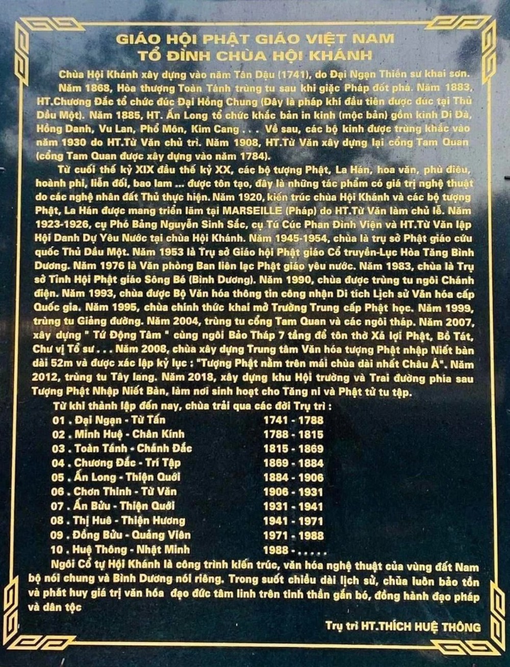 Với bề dày lịch sử, kiến trúc cổ kính cùng nhiều giá trị văn hóa, chùa Hội Khánh trở thành điểm đến quen thuộc đối với du khách khi ghé thăm Thủ Dầu Một. Nhiều người tìm đến chùa không chỉ để chiêm bái tượng Phật niết bàn đặc biệt trên mái, mà còn để cảm nhận không gian thanh tịnh của một ngôi tổ đình lâu đời ở vùng đất Nam bộ.