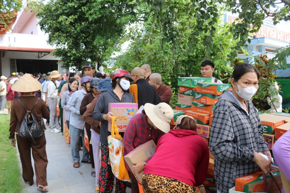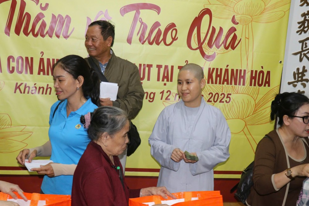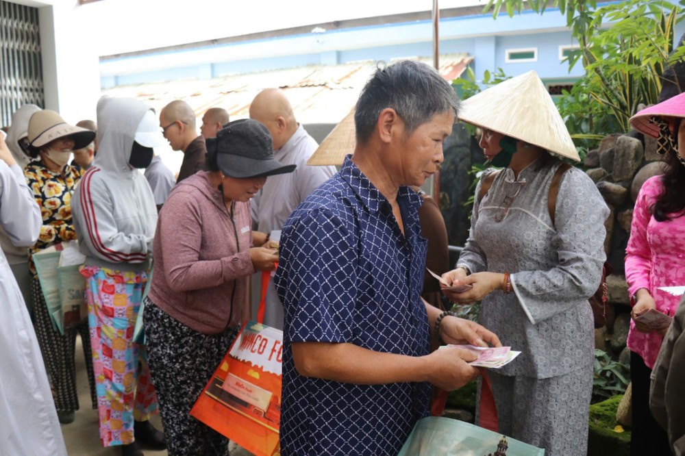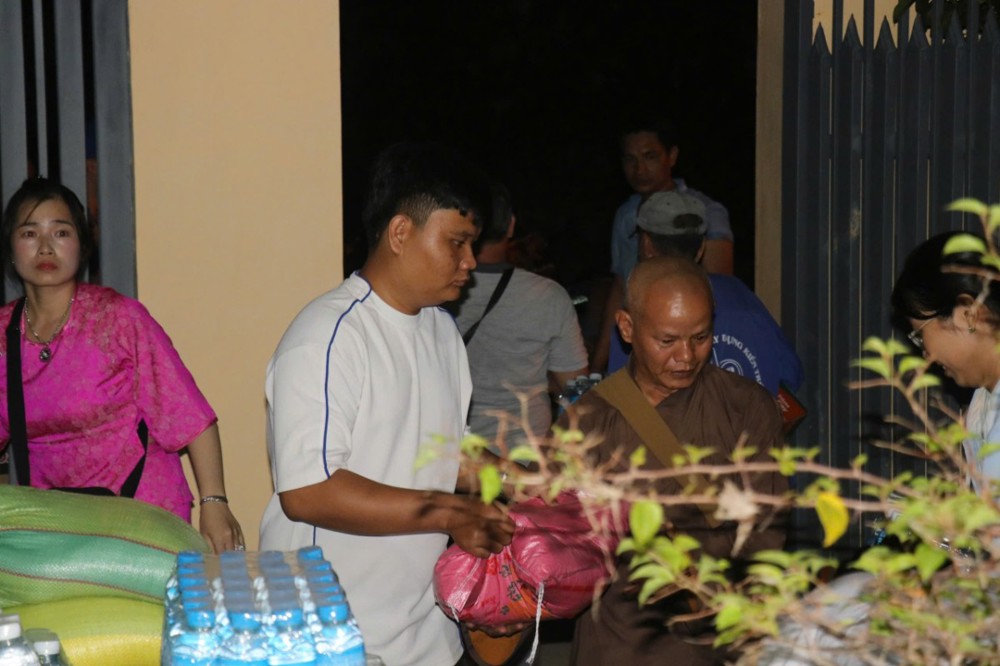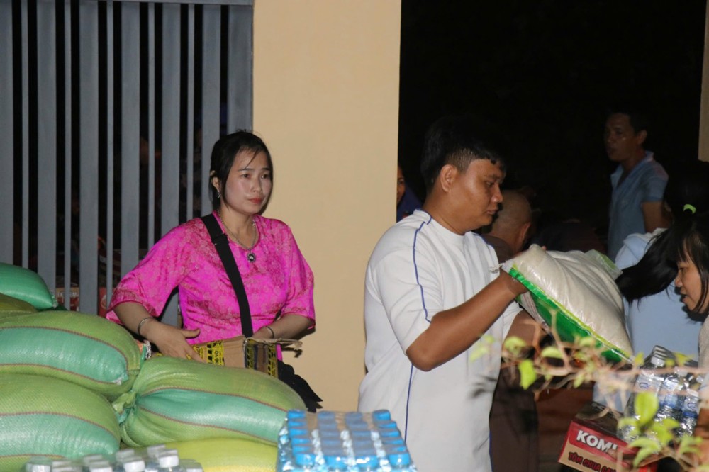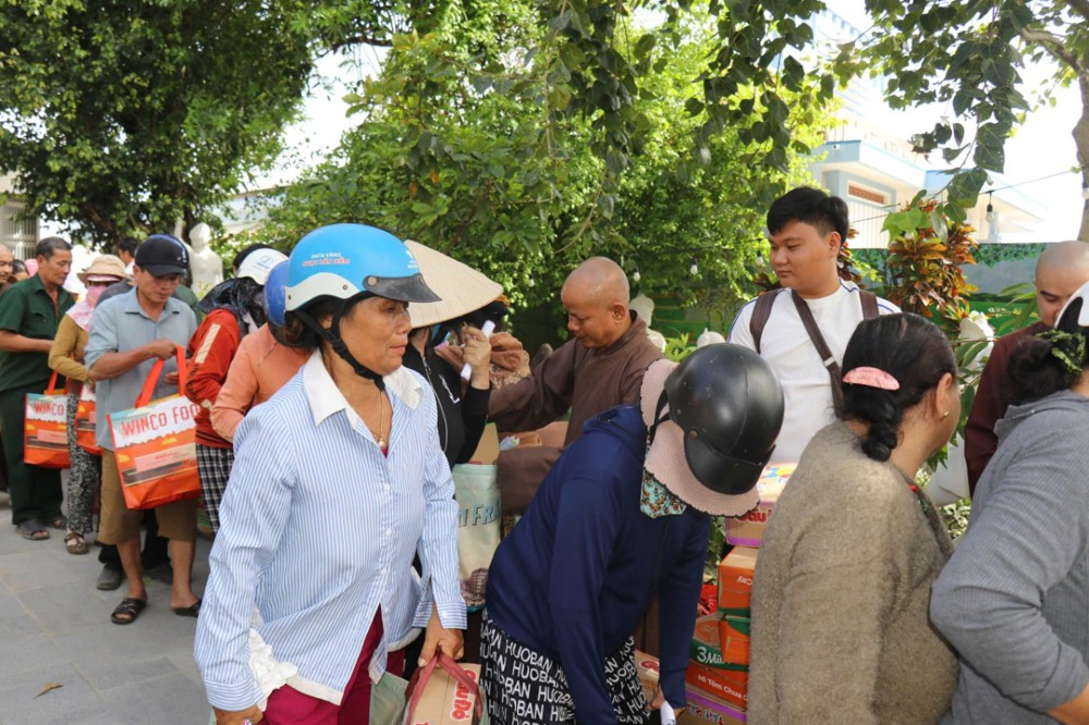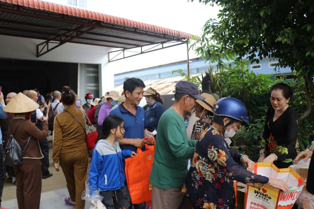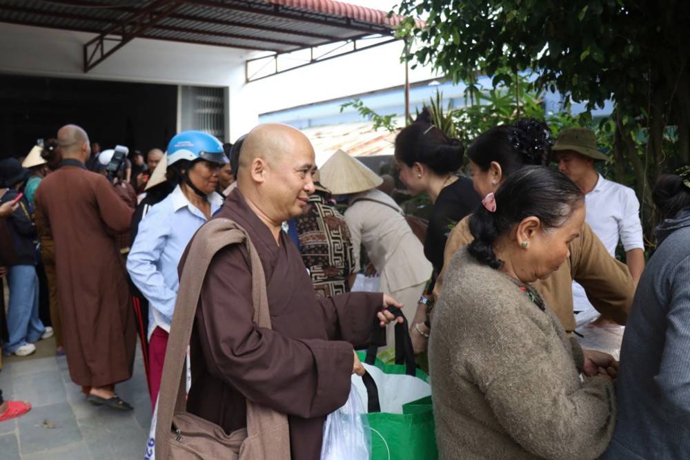 Rời Đắk Lắk, đoàn tiếp tục đến chùa Kim Quang (xã Vĩnh Thái, Khánh Hòa) – nơi bà con vừa chống chọi với trận lũ vỡ đê, nước dâng cao đến 2 mét. Trong không gian đầy ấm áp và xúc động, 200 phần quà đã được trao tận tay từng hộ dân. Mỗi hộ nhận 1.200.000 đồng, cùng các nhu yếu phẩm thiết yếu như 15kg gạo, nước tương, mì gói, dầu gió, mền, quần áo, thuốc Tây… Đoàn cũng hỗ trợ 40 triệu đồng để chùa Kim Quang khắc phục hậu quả sau thiên tai.