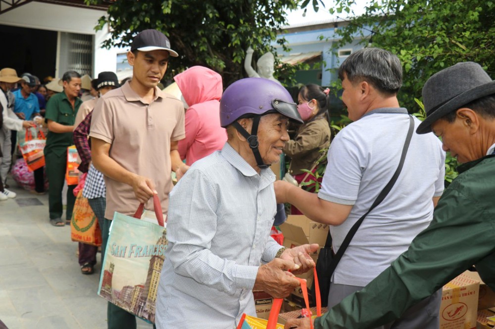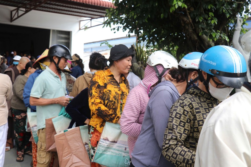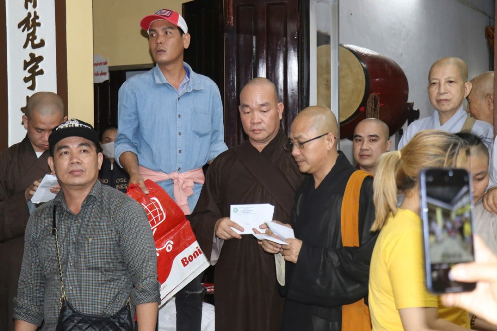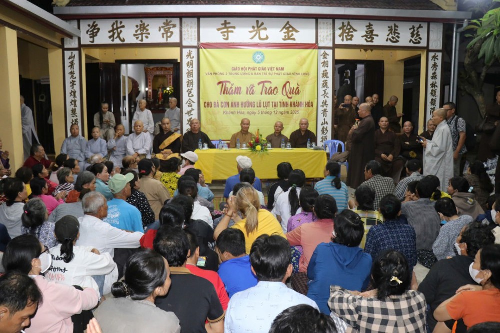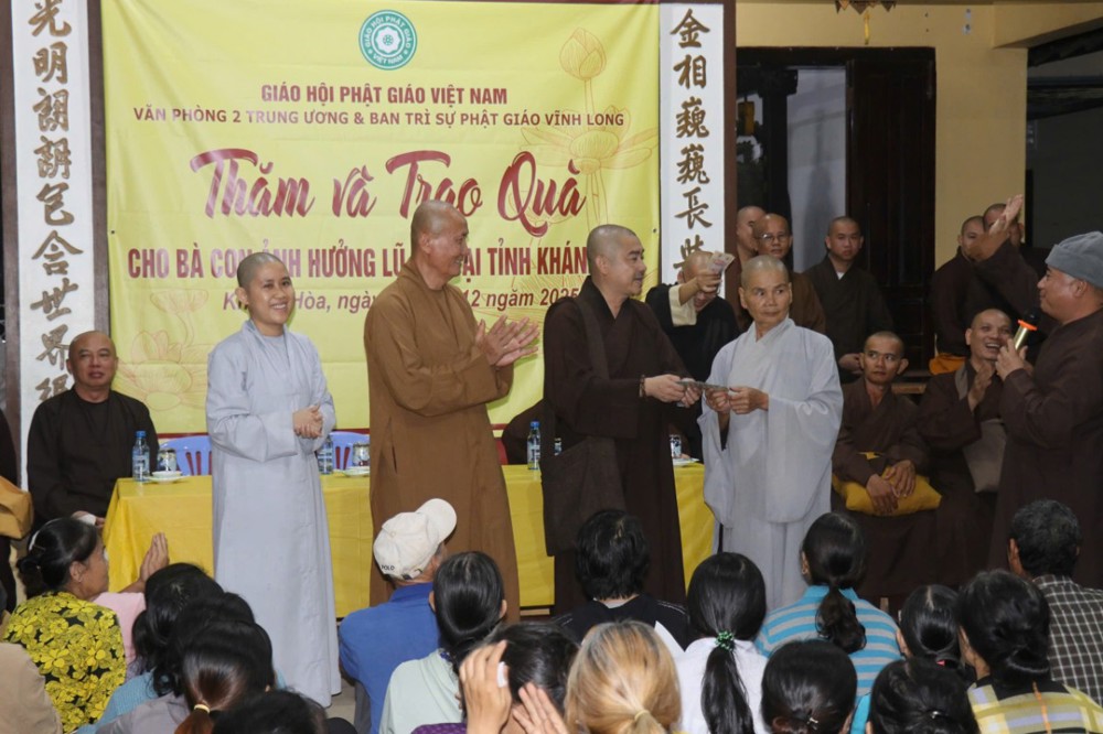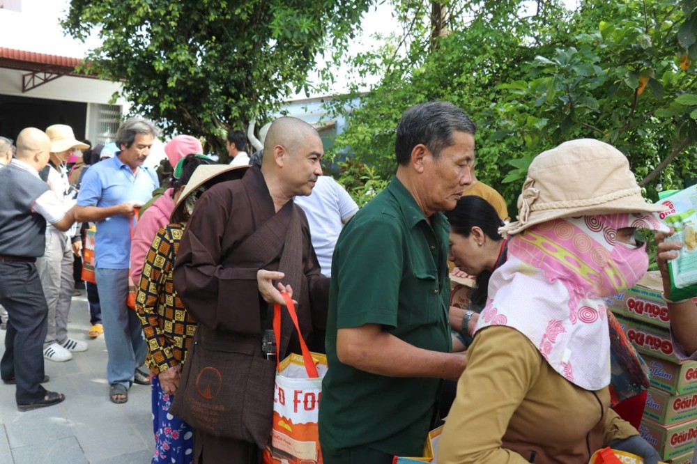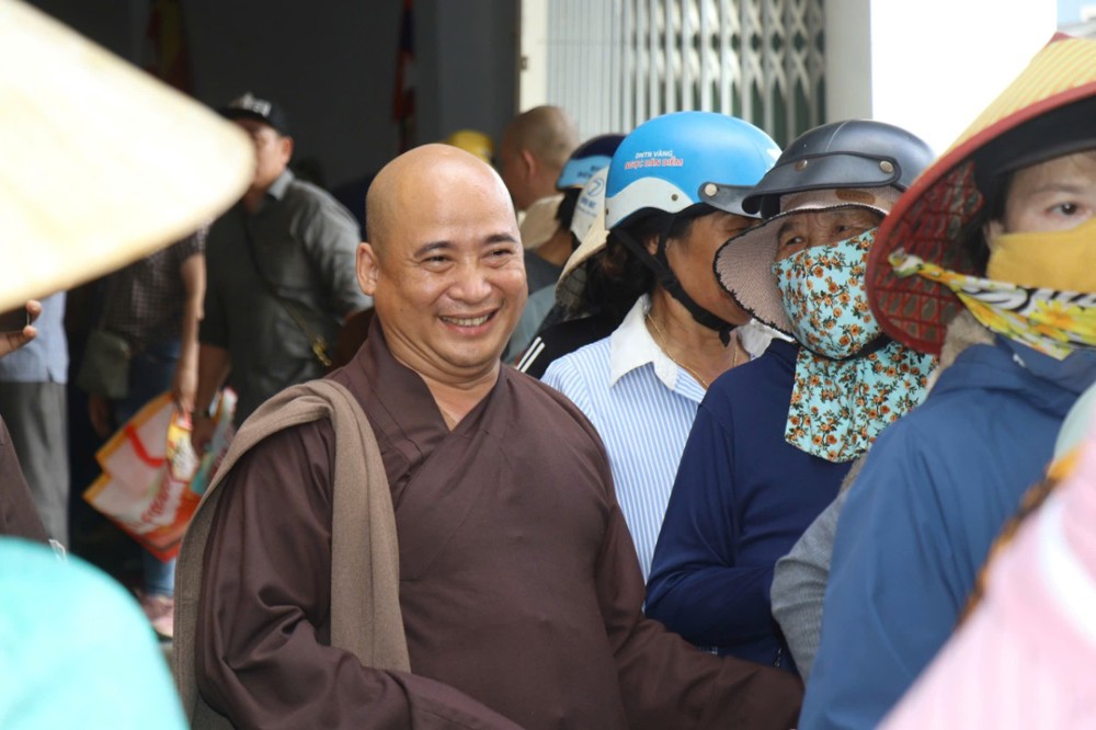 Rời Đắk Lắk, đoàn tiếp tục đến chùa Kim Quang (xã Vĩnh Thái, Khánh Hòa) – nơi bà con vừa chống chọi với trận lũ vỡ đê, nước dâng cao đến 2 mét. Trong không gian đầy ấm áp và xúc động, 200 phần quà đã được trao tận tay từng hộ dân. Mỗi hộ nhận 1.200.000 đồng, cùng các nhu yếu phẩm thiết yếu như 15kg gạo, nước tương, mì gói, dầu gió, mền, quần áo, thuốc Tây… Đoàn cũng hỗ trợ 40 triệu đồng để chùa Kim Quang khắc phục hậu quả sau thiên tai.