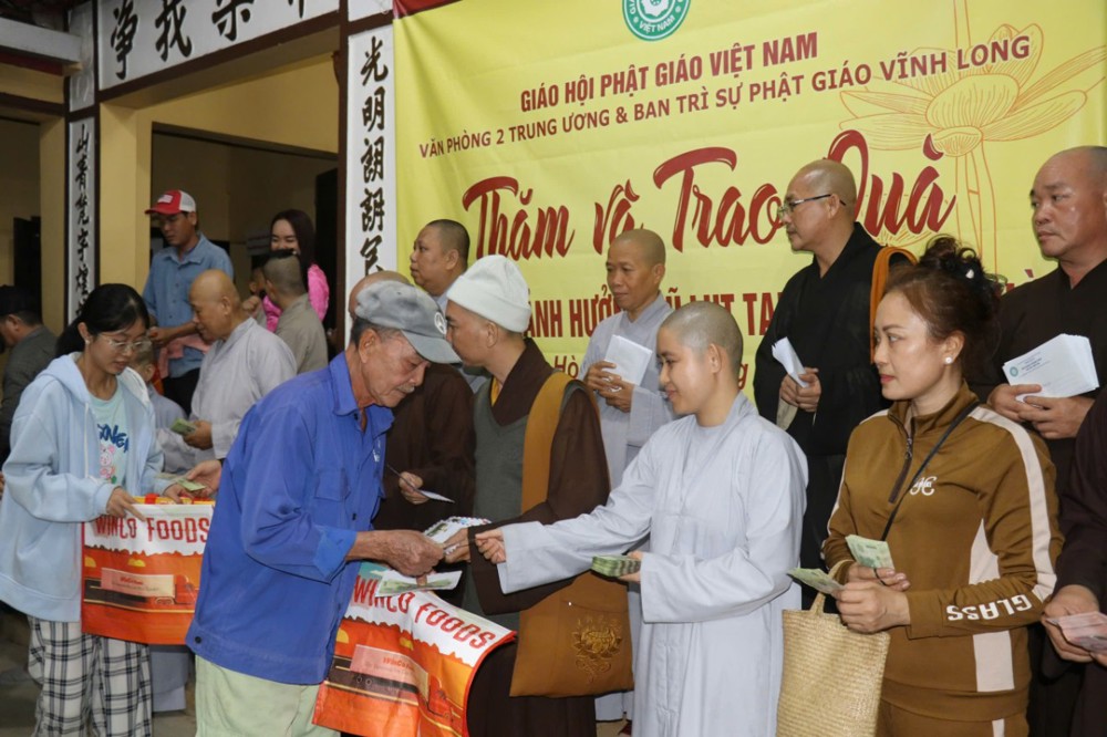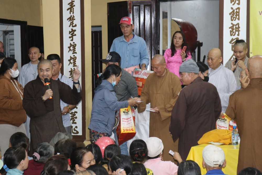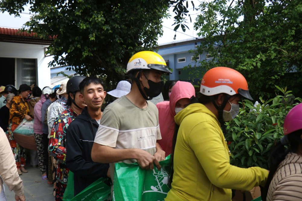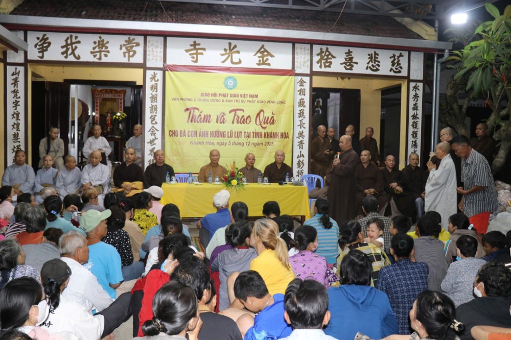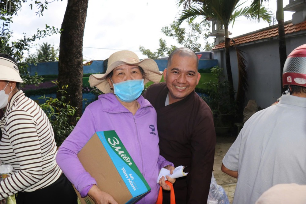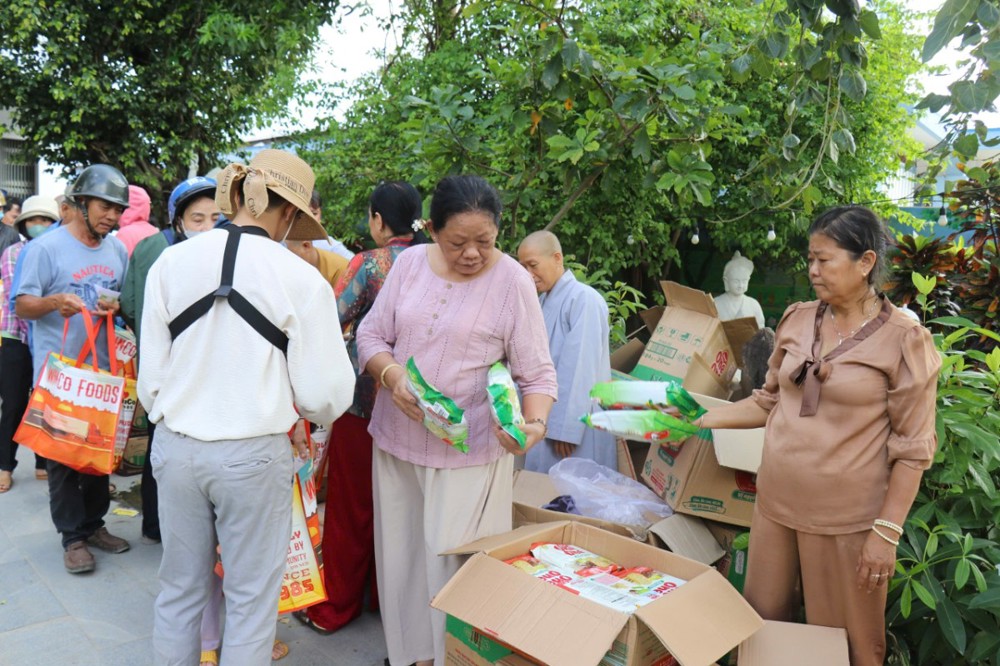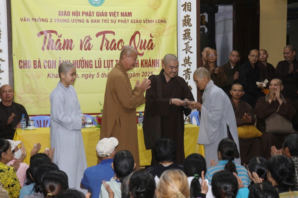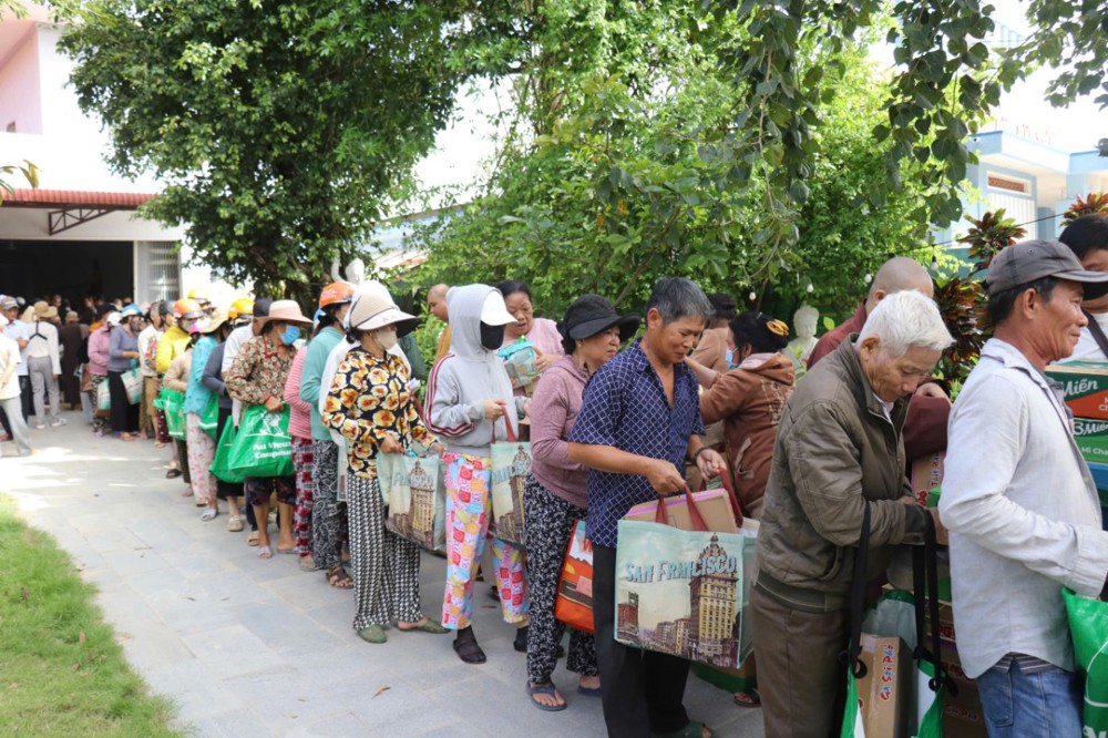 Rời Đắk Lắk, đoàn tiếp tục đến chùa Kim Quang (xã Vĩnh Thái, Khánh Hòa) – nơi bà con vừa chống chọi với trận lũ vỡ đê, nước dâng cao đến 2 mét. Trong không gian đầy ấm áp và xúc động, 200 phần quà đã được trao tận tay từng hộ dân. Mỗi hộ nhận 1.200.000 đồng, cùng các nhu yếu phẩm thiết yếu như 15kg gạo, nước tương, mì gói, dầu gió, mền, quần áo, thuốc Tây… Đoàn cũng hỗ trợ 40 triệu đồng để chùa Kim Quang khắc phục hậu quả sau thiên tai.