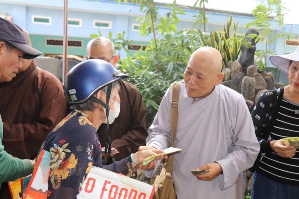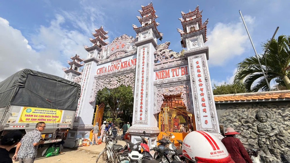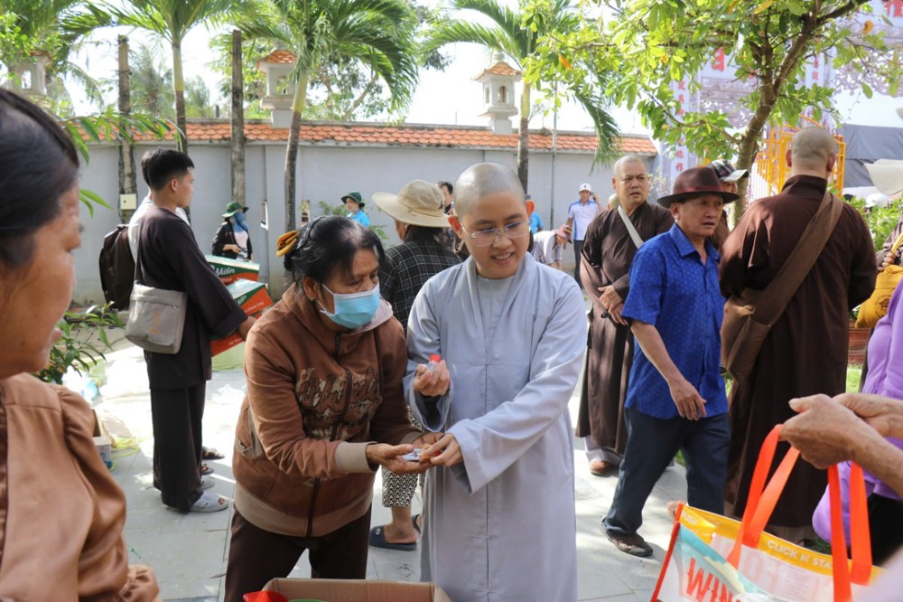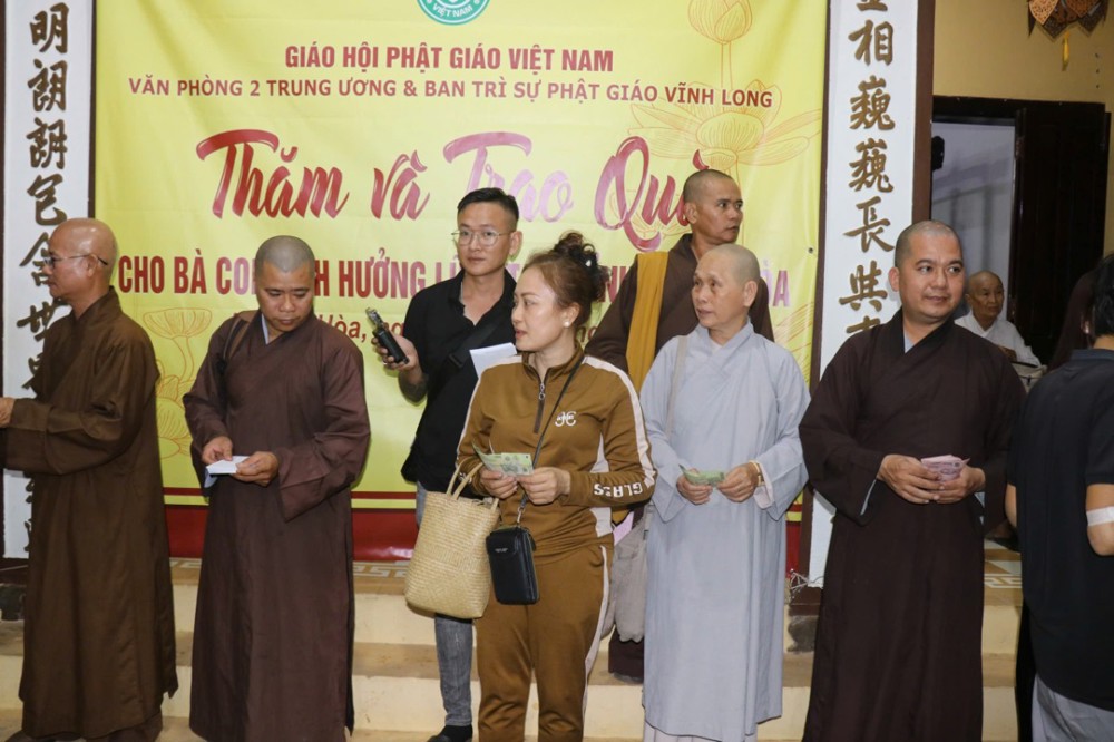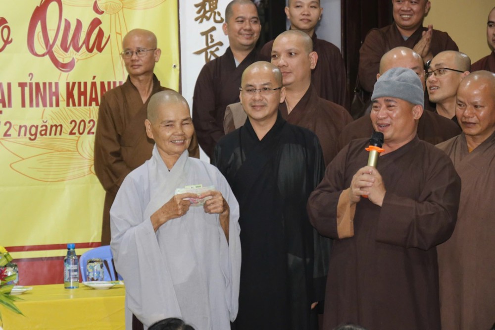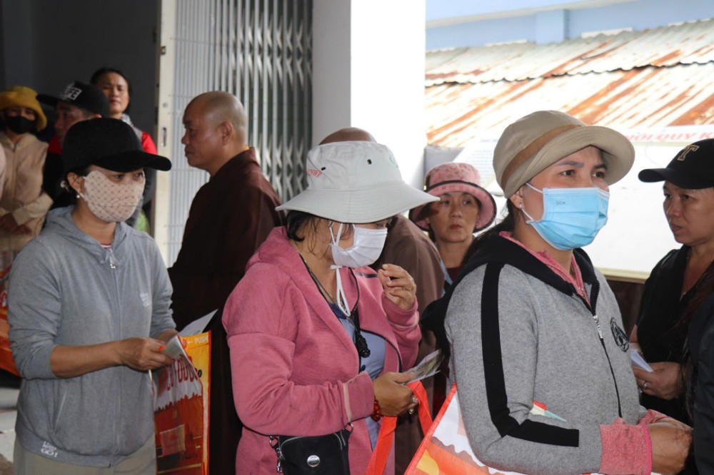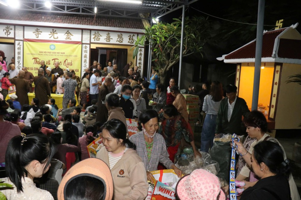 Rời Đắk Lắk, đoàn tiếp tục đến chùa Kim Quang (xã Vĩnh Thái, Khánh Hòa) – nơi bà con vừa chống chọi với trận lũ vỡ đê, nước dâng cao đến 2 mét. Trong không gian đầy ấm áp và xúc động, 200 phần quà đã được trao tận tay từng hộ dân. Mỗi hộ nhận 1.200.000 đồng, cùng các nhu yếu phẩm thiết yếu như 15kg gạo, nước tương, mì gói, dầu gió, mền, quần áo, thuốc Tây… Đoàn cũng hỗ trợ 40 triệu đồng để chùa Kim Quang khắc phục hậu quả sau thiên tai.