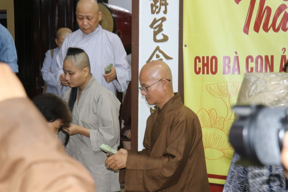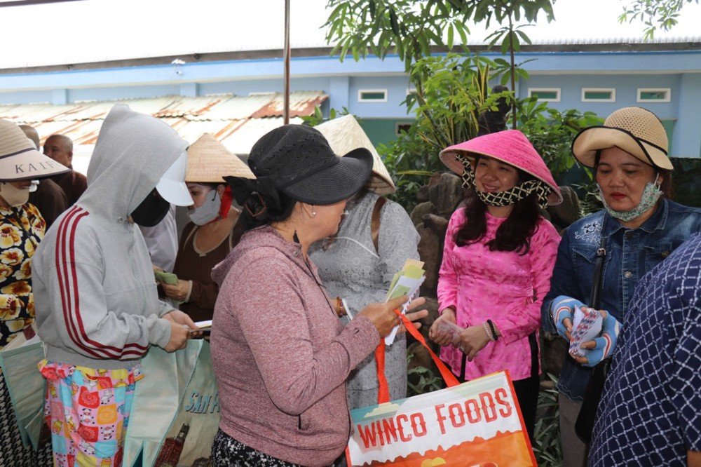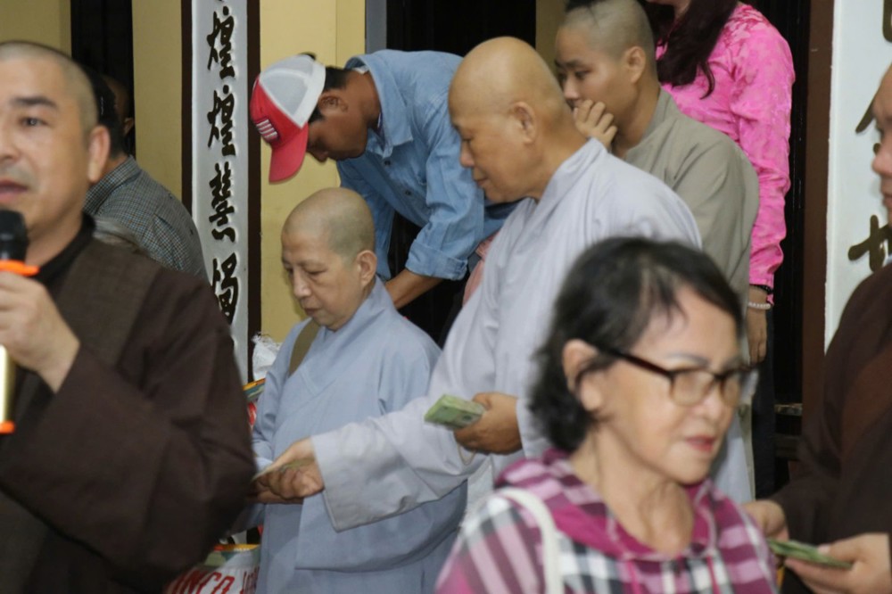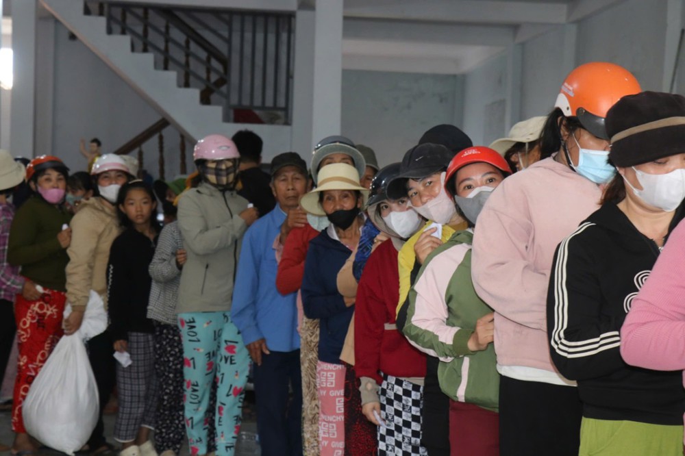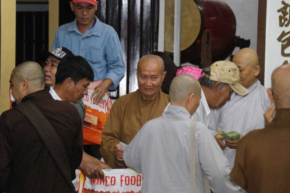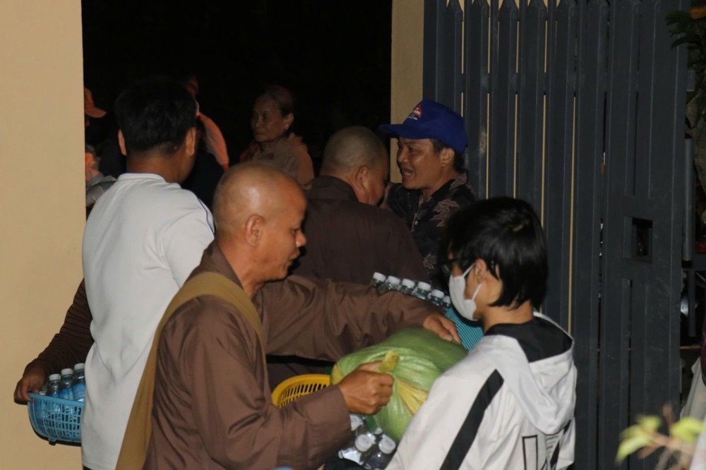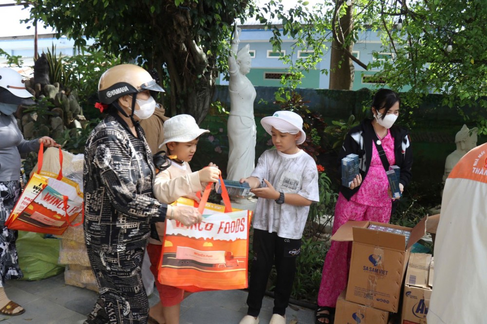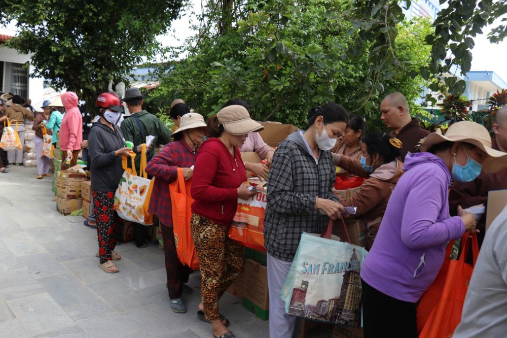 Rời Đắk Lắk, đoàn tiếp tục đến chùa Kim Quang (xã Vĩnh Thái, Khánh Hòa) – nơi bà con vừa chống chọi với trận lũ vỡ đê, nước dâng cao đến 2 mét. Trong không gian đầy ấm áp và xúc động, 200 phần quà đã được trao tận tay từng hộ dân. Mỗi hộ nhận 1.200.000 đồng, cùng các nhu yếu phẩm thiết yếu như 15kg gạo, nước tương, mì gói, dầu gió, mền, quần áo, thuốc Tây… Đoàn cũng hỗ trợ 40 triệu đồng để chùa Kim Quang khắc phục hậu quả sau thiên tai.