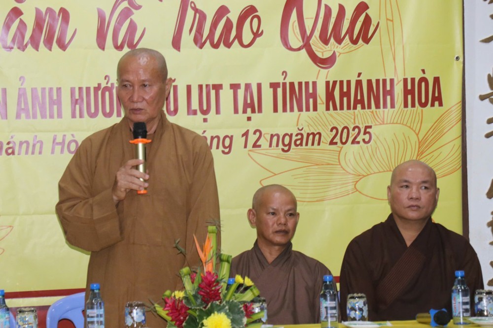 Tại đây, Thượng tọa Thích Phước Nghiêm – Ủy viên Thường trực HĐTS, Phó Chánh Văn phòng II trung ương GHPGVN – đã bày tỏ niềm cảm thông sâu sắc: “Bão lũ có thể cuốn trôi nhà cửa, nhưng không thể cuốn trôi tình người, Chúng ta không thể xoay chuyển dòng nước lũ, nhưng chúng ta có thể trao nhau những bàn tay nâng đỡ. Mất mát chỉ là tạm thời, còn tình người sẽ là điểm tựa giúp chúng ta đứng dậy. Mong bà con giữ vững tâm, vì mỗi người đều có khả năng vượt lên nghịch cảnh khi trong lòng còn giữ được niềm tin.”