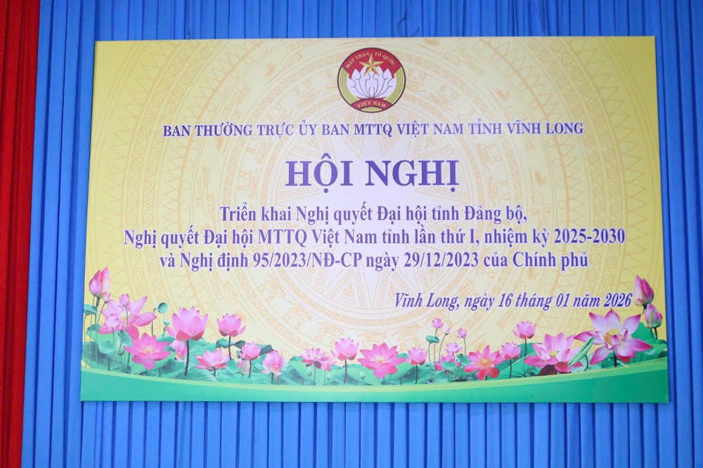 PSO - Sáng ngày 16/1/2026 (nhằm ngày 28/11 năm Ất Tỵ) tại Hội trường Trung tâm Chính trị (số 164, Lê Lợi, P.Trà Vinh, tỉnh Vĩnh Long) Ban Thường trực UB MTTQVN tỉnh Vĩnh Long tổ chức Hội nghị triển khai các chủ trương, đường lối của Đảng, chính sách, pháp luật của Nhà nước: Nghị quyết Đại hội Đảng bộ, Nghị quyết Đại hội MTTQVN tỉnh lần thứ I, nhiệm kỳ 2025-2030 và Nghị định 95/2023/NĐ-CP ngày 29/12/2023 của Chính phủ quy định chi tiết thực hiện một số điều Luật tín ngưỡng, tôn giáo.