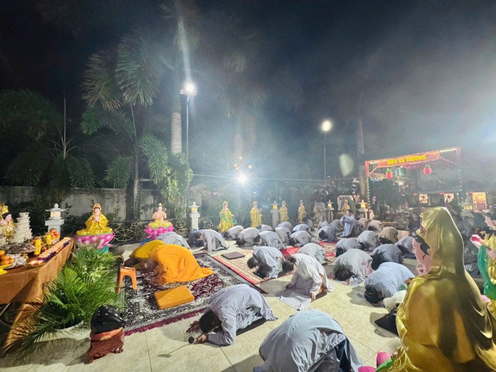 Tiếp đó, toàn thể đạo tràng nhất tâm trì tụng chú Đại Bi với thanh âm hùng tráng mà trầm lắng, hòa quyện trong không gian thanh tịnh như dòng suối cam lồ tưới mát tâm hồn. Đại chúng trang nghiêm đảnh lễ Ngũ Bách Danh – 500 lạy Đức Quán Thế Âm Bồ Tát; mỗi lạy là một bước quay về tự tánh thanh tịnh, nuôi dưỡng tâm từ, buông bỏ phiền não, hướng đến đời sống thiện lành, tỉnh thức.