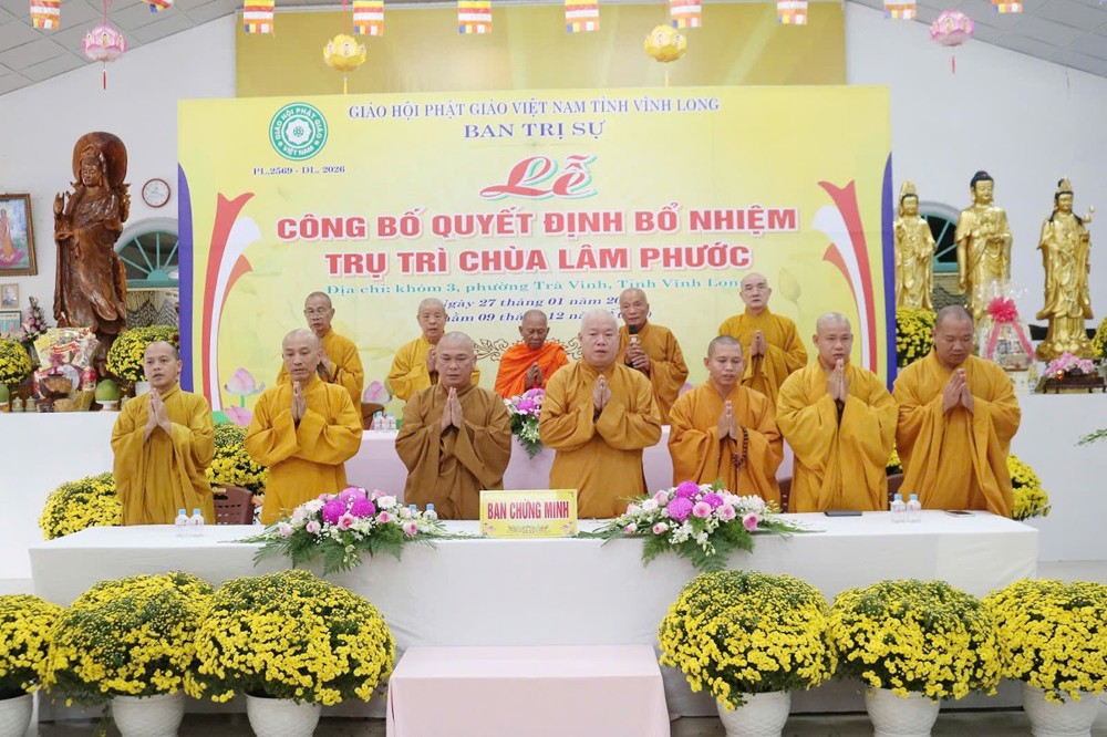 PSO - Sáng ngày 27/01/2026 (nhằm ngày 9/12 năm Ất Tỵ) Ban Thường trực BTS GHPGVN tỉnh Vĩnh Long đã long trọng tổ chức Lễ công bố quyết định bổ nhiệm Trụ trì chùa Lâm Phước (khóm 3, P.Trà Vinh, tỉnh Vĩnh Long) đến NT.Thích Nữ Như Hải.