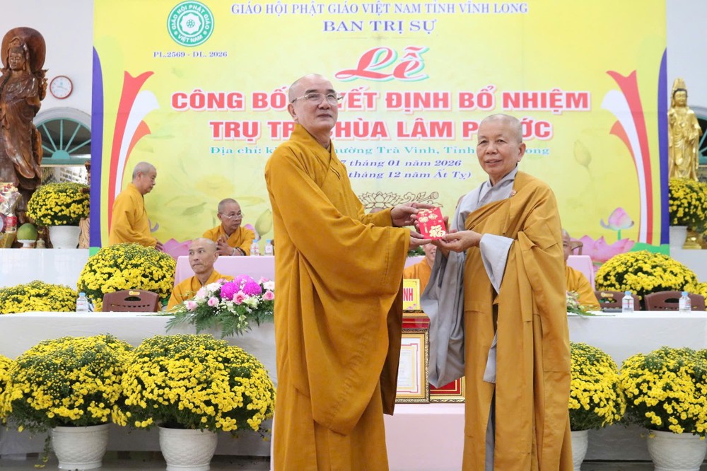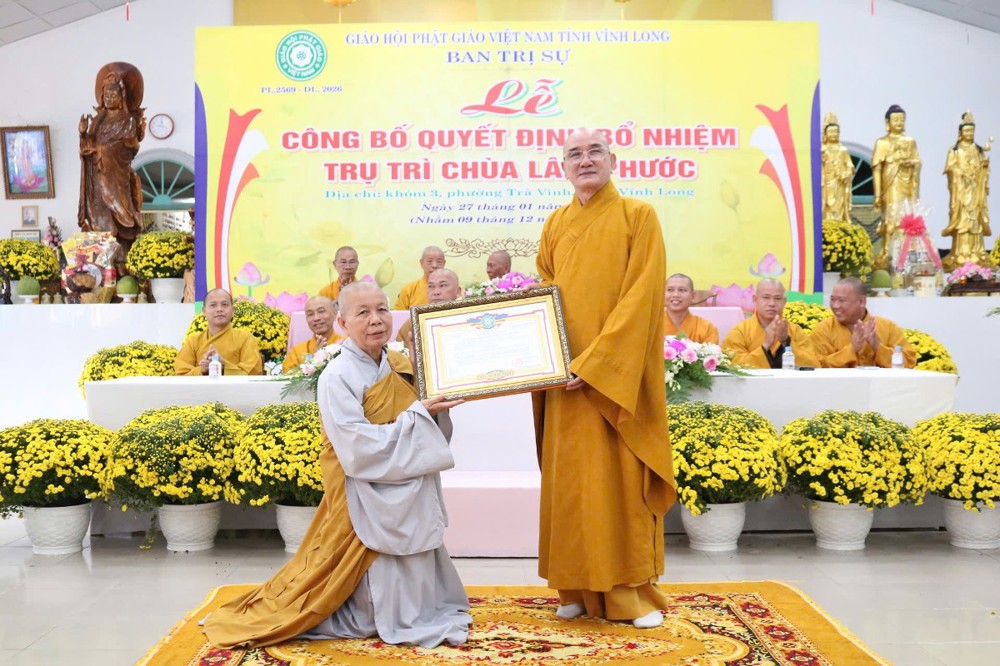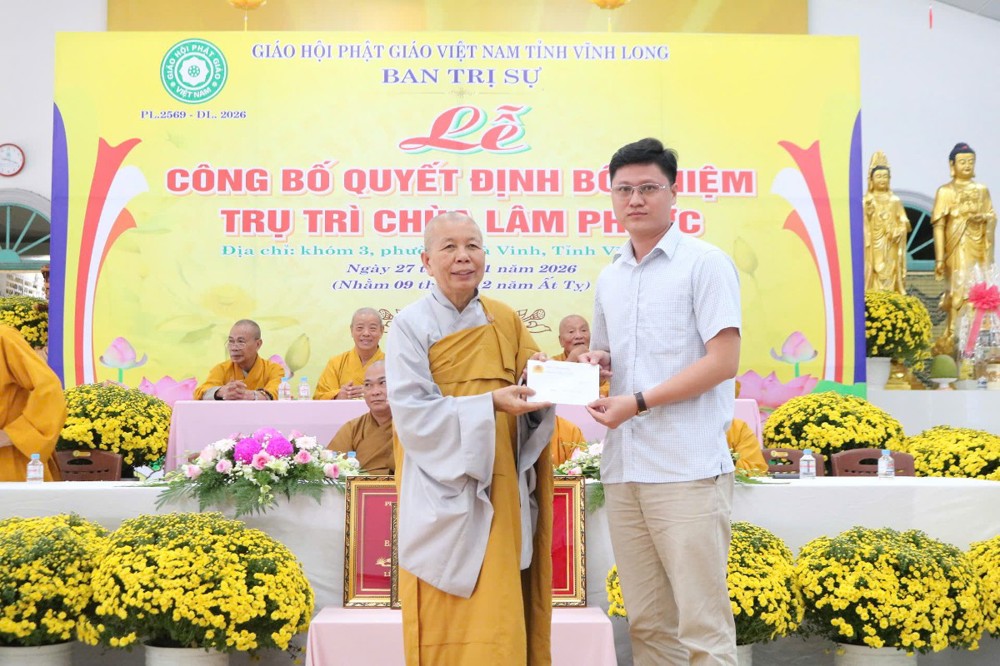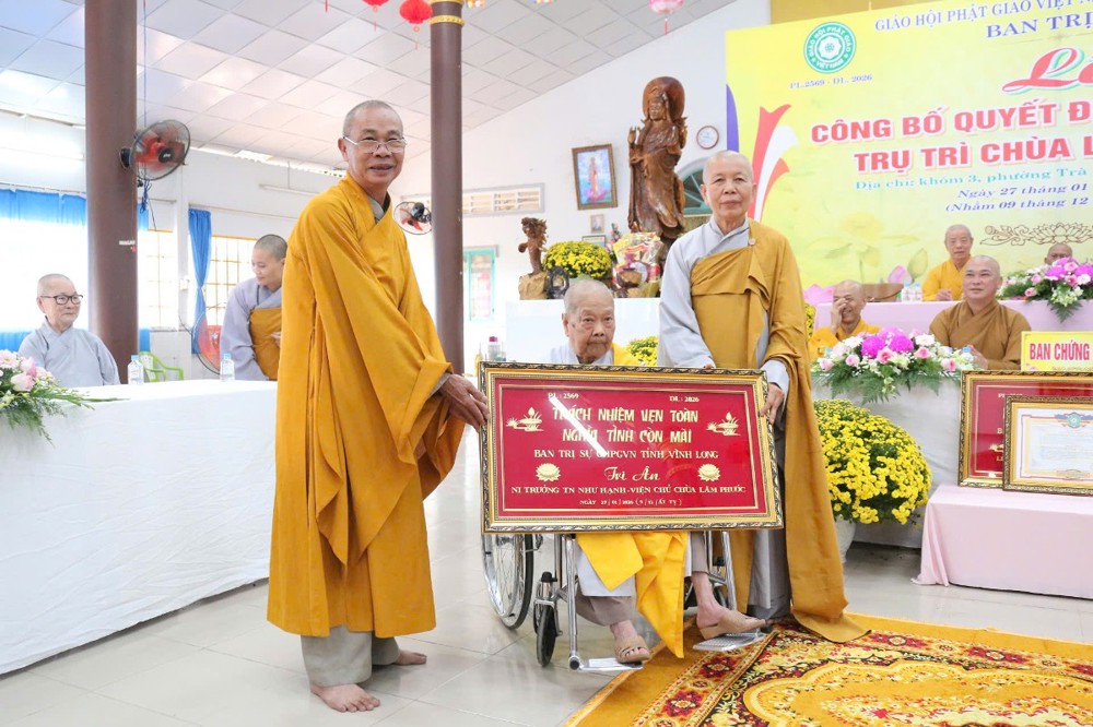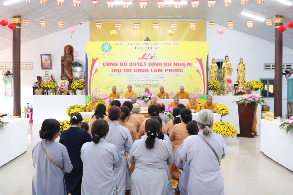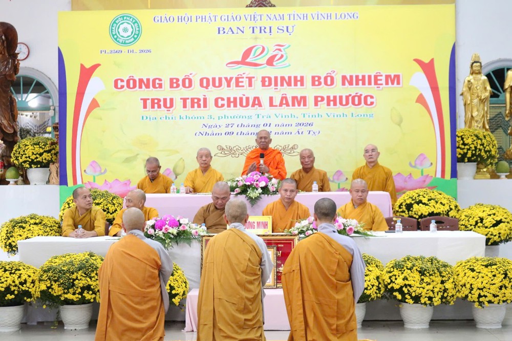 Kế đến, TT.Thích Tâm Khiết - Phó Trưởng ban kiêm Chánh Thư ký BTS GHPGVN tỉnh công bố Quyết định số 37/QĐ-BTS ngày 19/1/2026 về việc bổ nhiệm NT.Thích Nữ Như Hải (thế danh Lâm Thị Hà), sinh năm 1959, Trụ trì chùa Long An (P.Cái Vồn, tỉnh Vĩnh Long) kiêm nhiệm chức vụ Trụ trì chùa Lâm Phước (khóm 3, P.Trà Vinh, tỉnh Vĩnh Long).