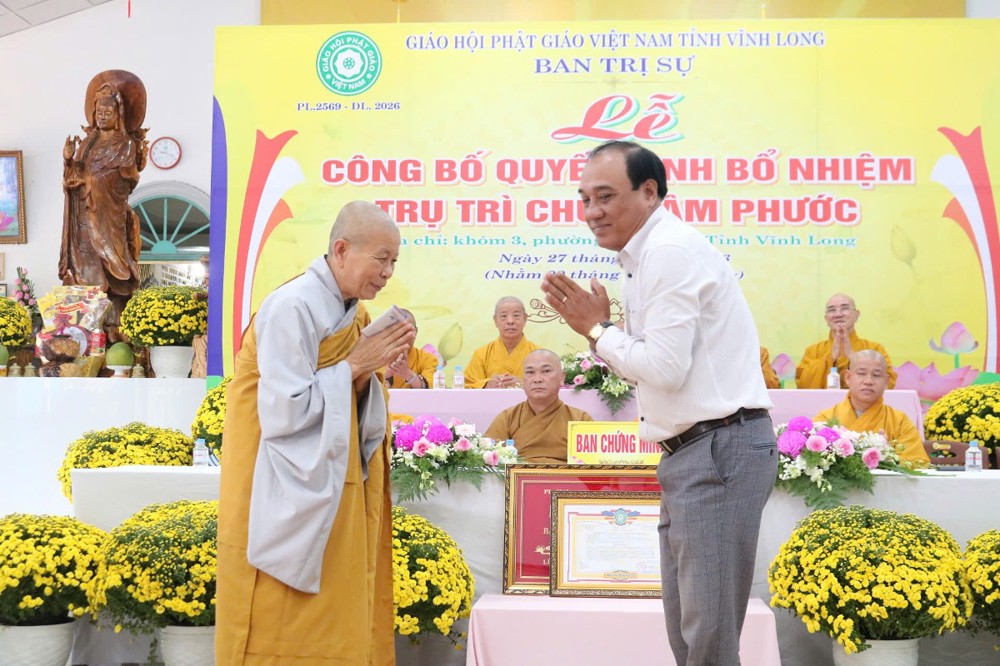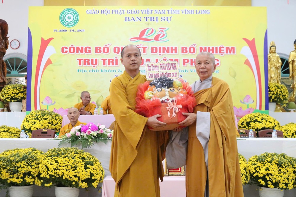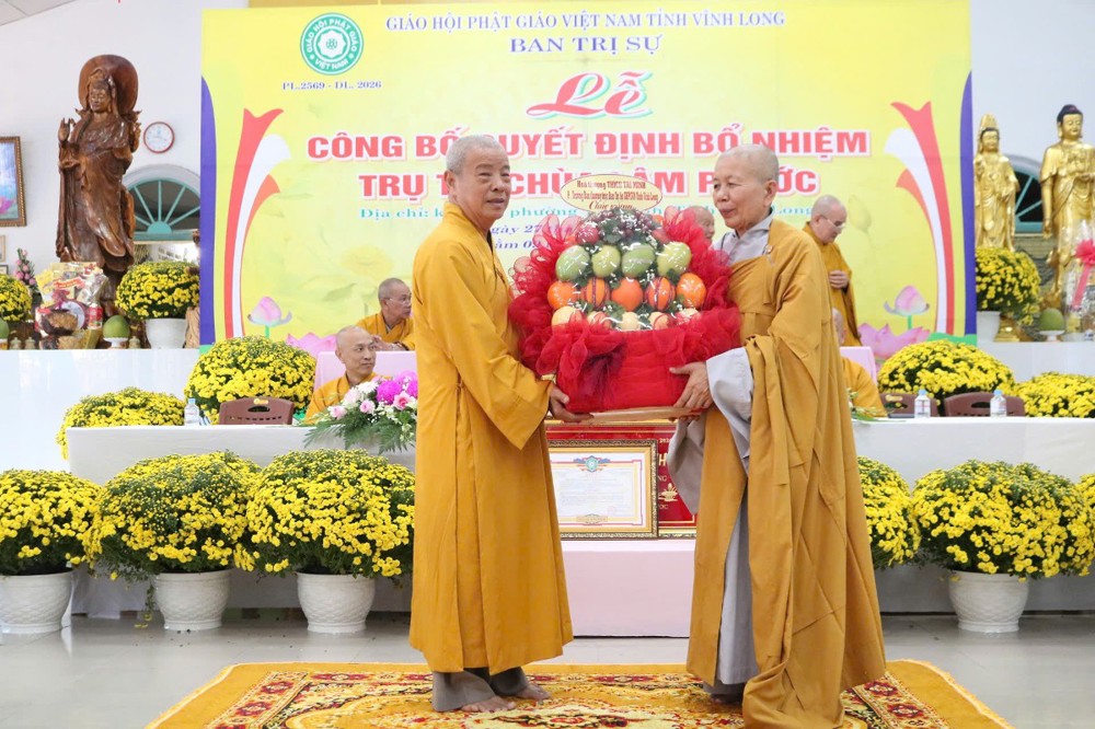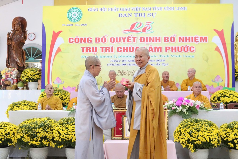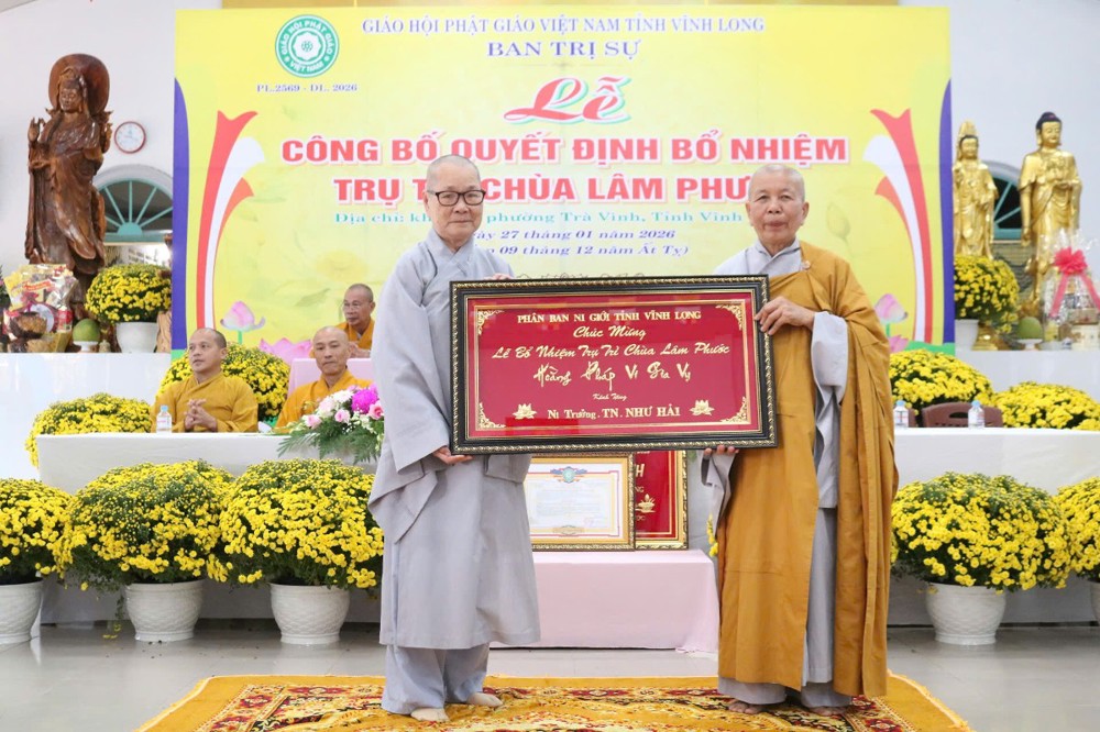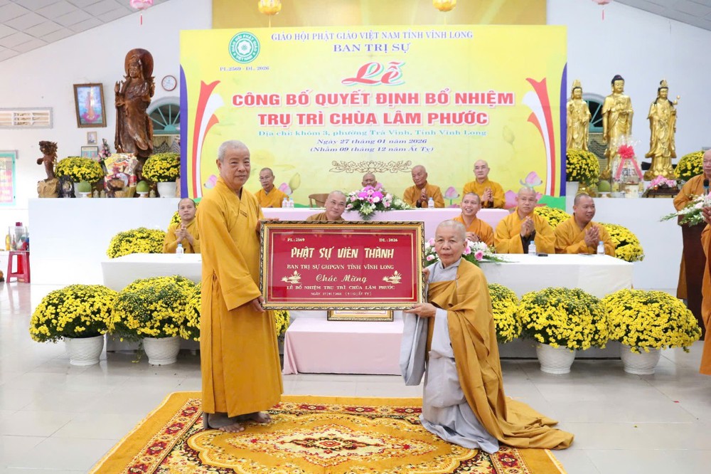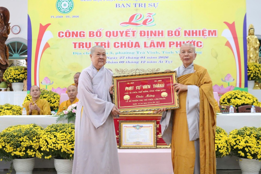 Kế đến, TT.Thích Tâm Khiết - Phó Trưởng ban kiêm Chánh Thư ký BTS GHPGVN tỉnh công bố Quyết định số 37/QĐ-BTS ngày 19/1/2026 về việc bổ nhiệm NT.Thích Nữ Như Hải (thế danh Lâm Thị Hà), sinh năm 1959, Trụ trì chùa Long An (P.Cái Vồn, tỉnh Vĩnh Long) kiêm nhiệm chức vụ Trụ trì chùa Lâm Phước (khóm 3, P.Trà Vinh, tỉnh Vĩnh Long).