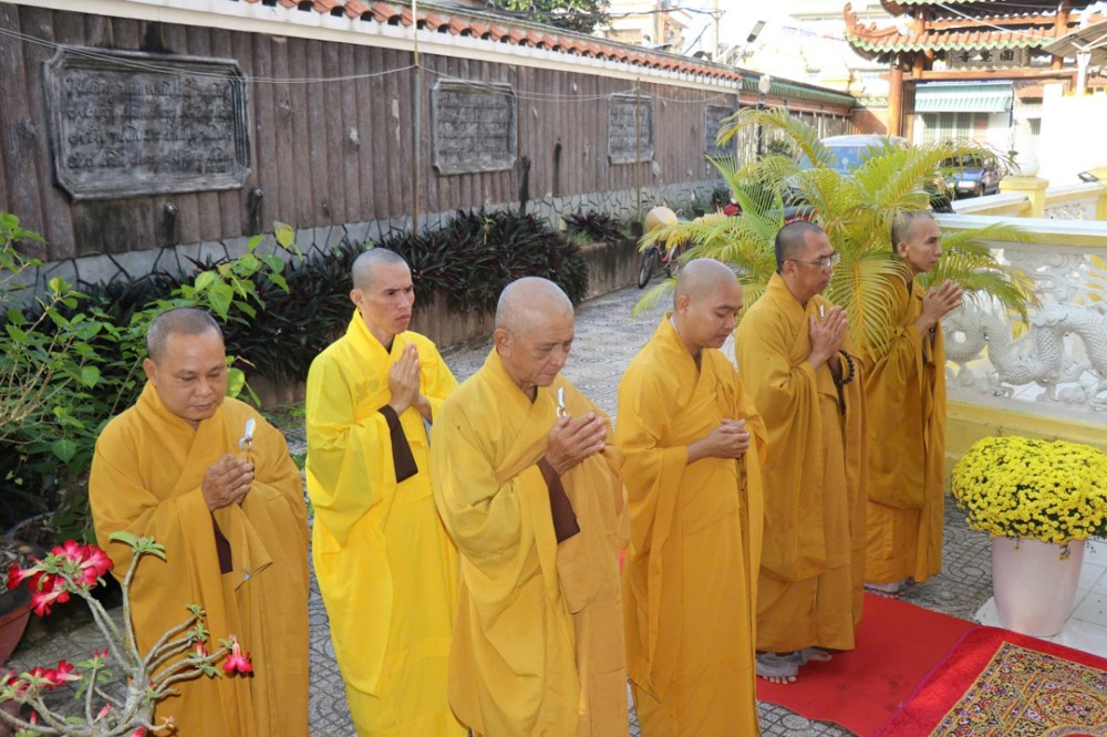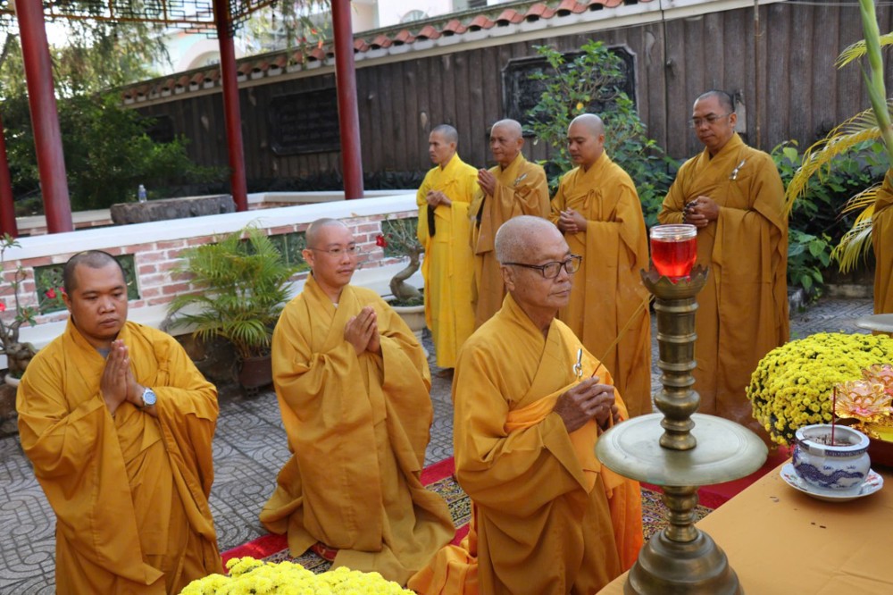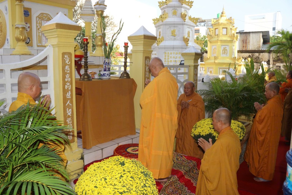 Trong bầu không khí trang nghiêm và thành kính, Chư Tôn thiền đức đã niêm hương bạch Phật, dâng hương tưởng niệm, đảnh lễ và thực hiện nghi thức nhiễu tháp ba vòng, nhất tâm tưởng niệm giác linh chư vị Hòa thượng khai sơn tạo tự, chư vị tiền bối Tổ sư, chư vị trụ trì tiền nhiệm đã dày công khai sáng, gìn giữ và phát triển Chùa Viên Giác qua nhiều thế hệ.