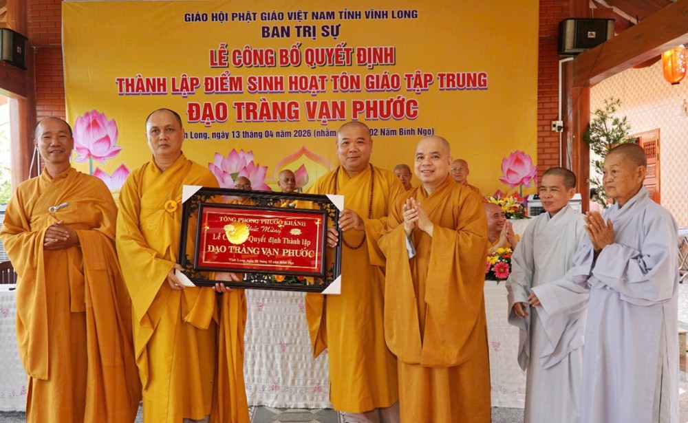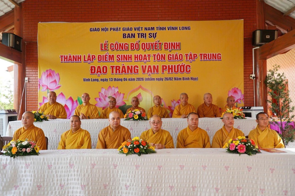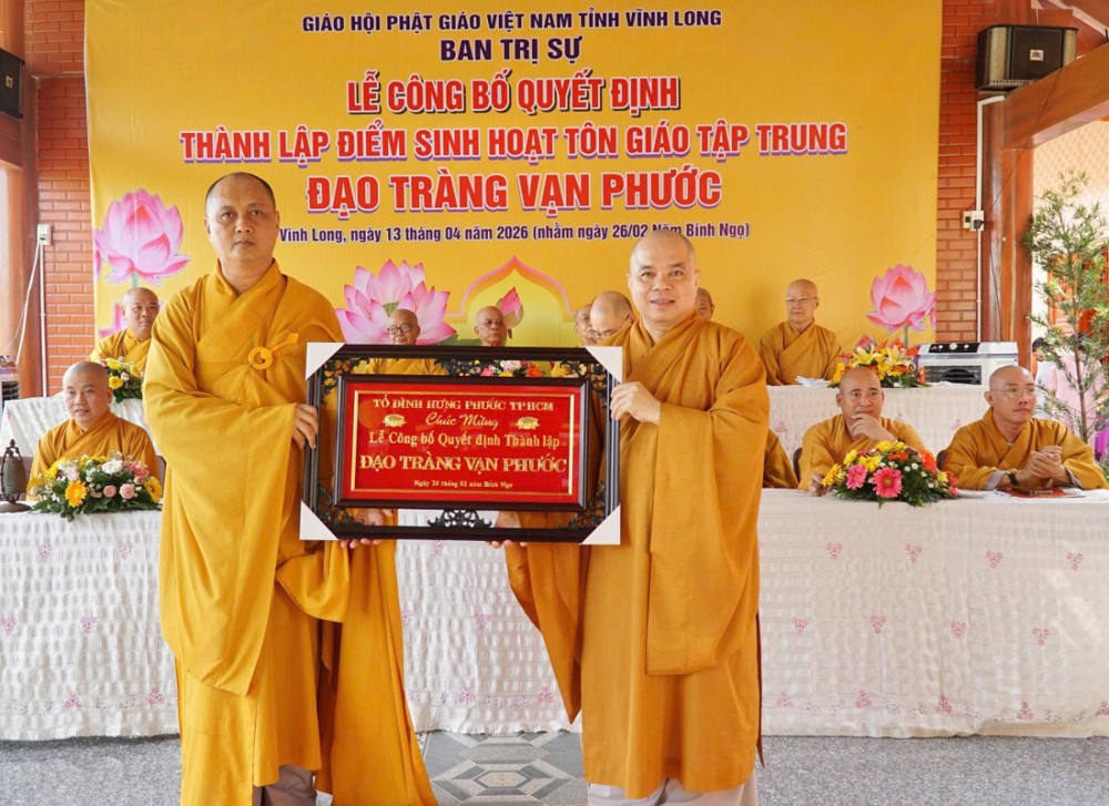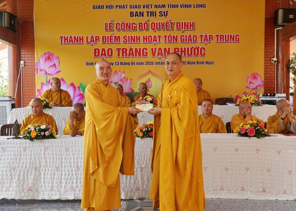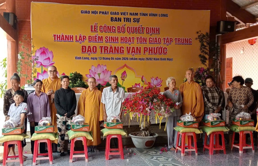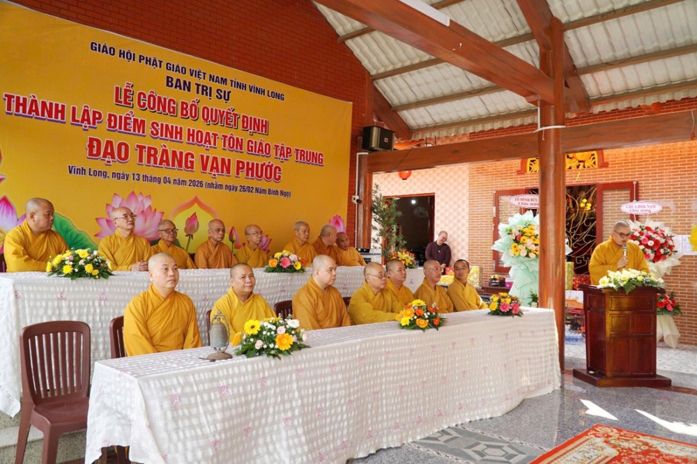 Tại buổi lễ, Thượng tọa Thích Tâm Kiết đã công bố Quyết định số 180/QĐ-BTS, ngày 13-4-2026 của Ban Trị sự GHPGVN tỉnh Vĩnh Long về việc thành lập và phân công nhân sự điểm sinh hoạt tôn giáo tập trung đạo tràng Vạn Phước tại ấp An Bình, xã Thạnh Phú.