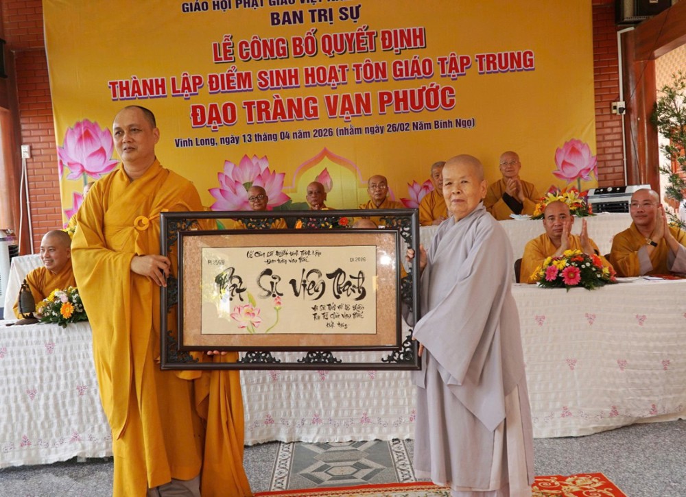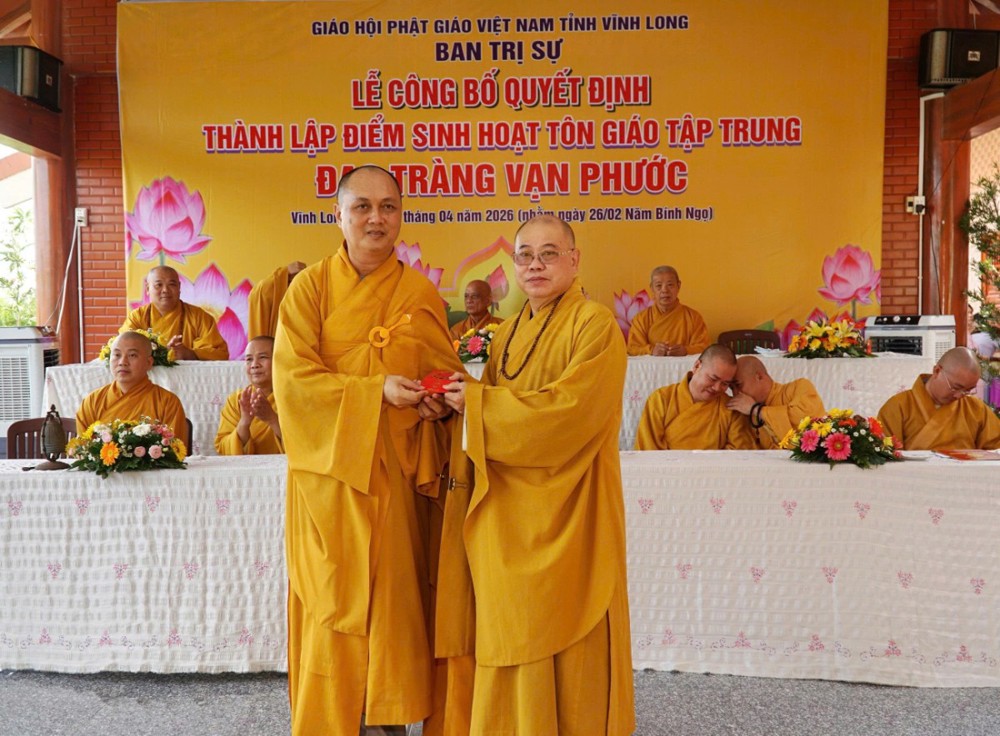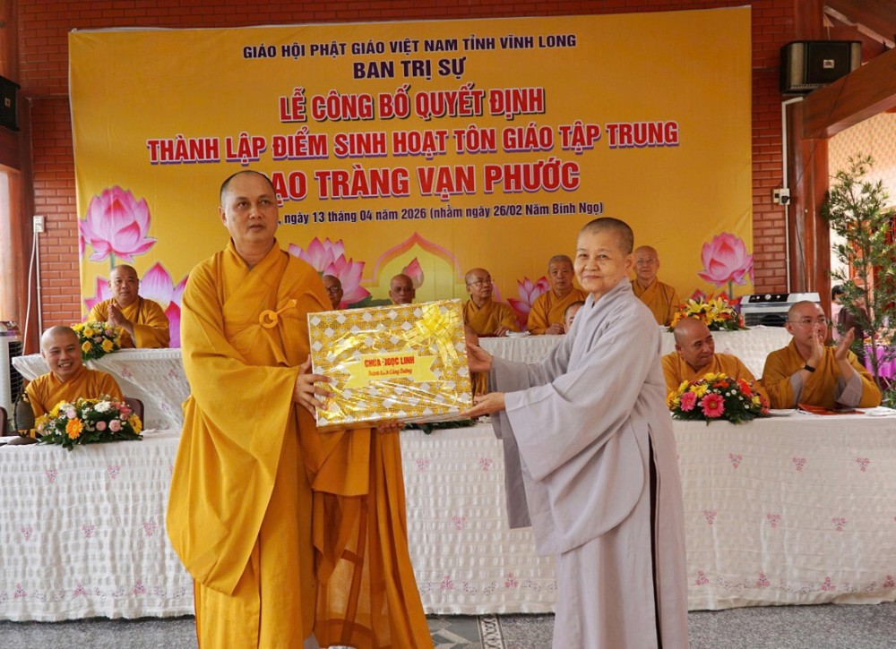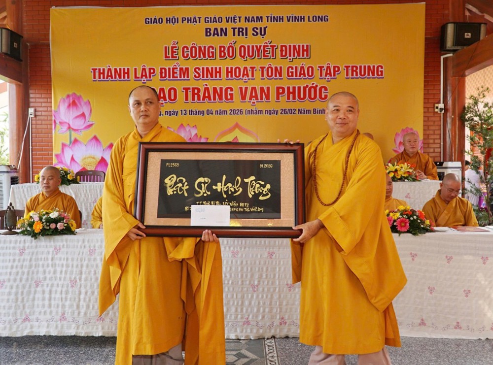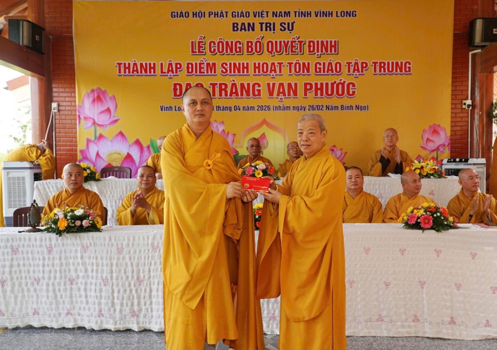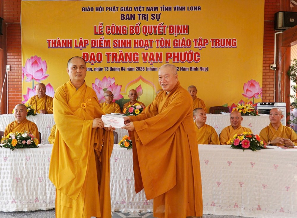 Tại buổi lễ, Thượng tọa Thích Tâm Kiết đã công bố Quyết định số 180/QĐ-BTS, ngày 13-4-2026 của Ban Trị sự GHPGVN tỉnh Vĩnh Long về việc thành lập và phân công nhân sự điểm sinh hoạt tôn giáo tập trung đạo tràng Vạn Phước tại ấp An Bình, xã Thạnh Phú.